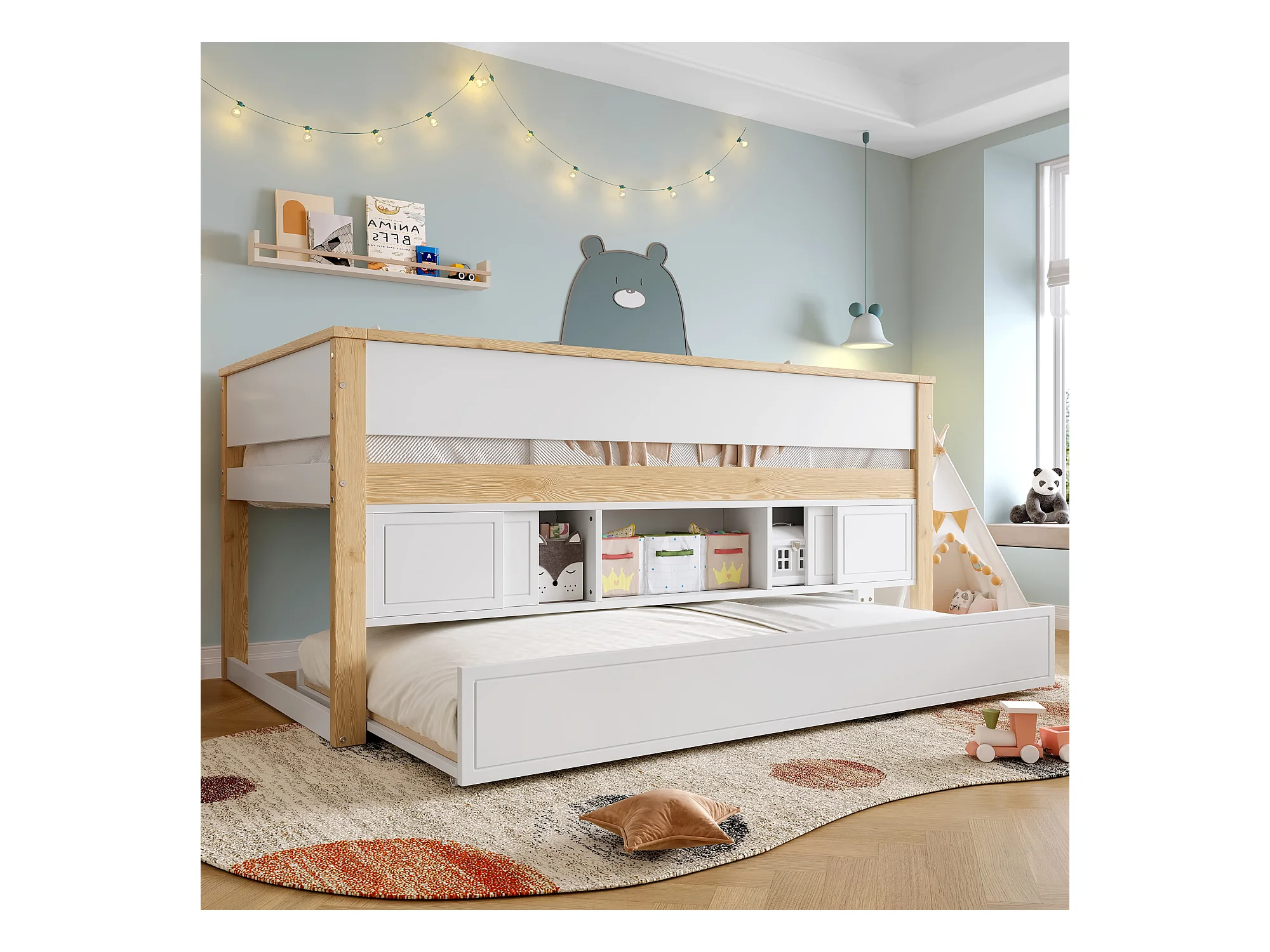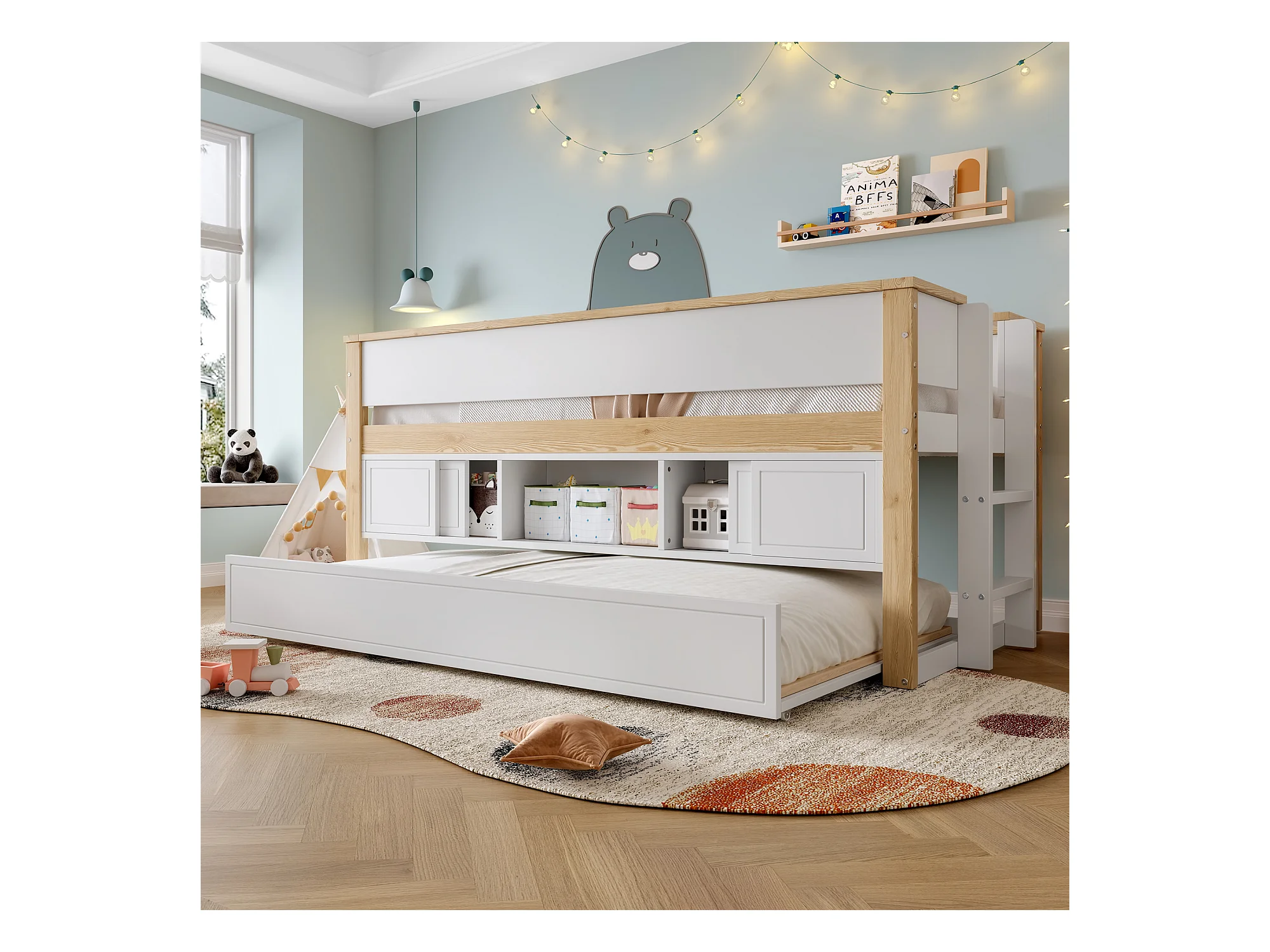 Lit mi-hauteur avec lit gigogne enfant - 90 x 200 cm + 90 x 190 cm - avec rangements - bois - blanc + naturel