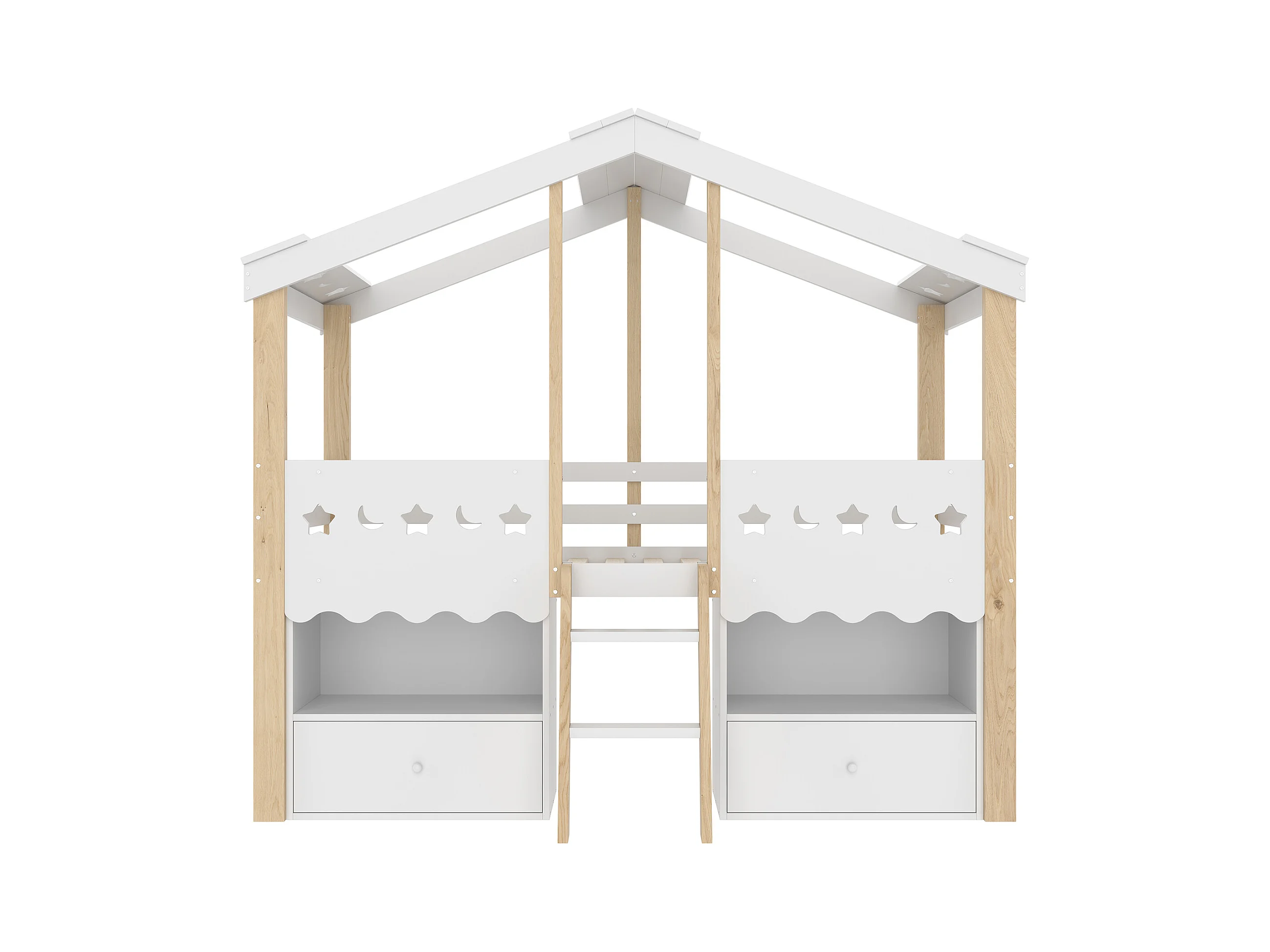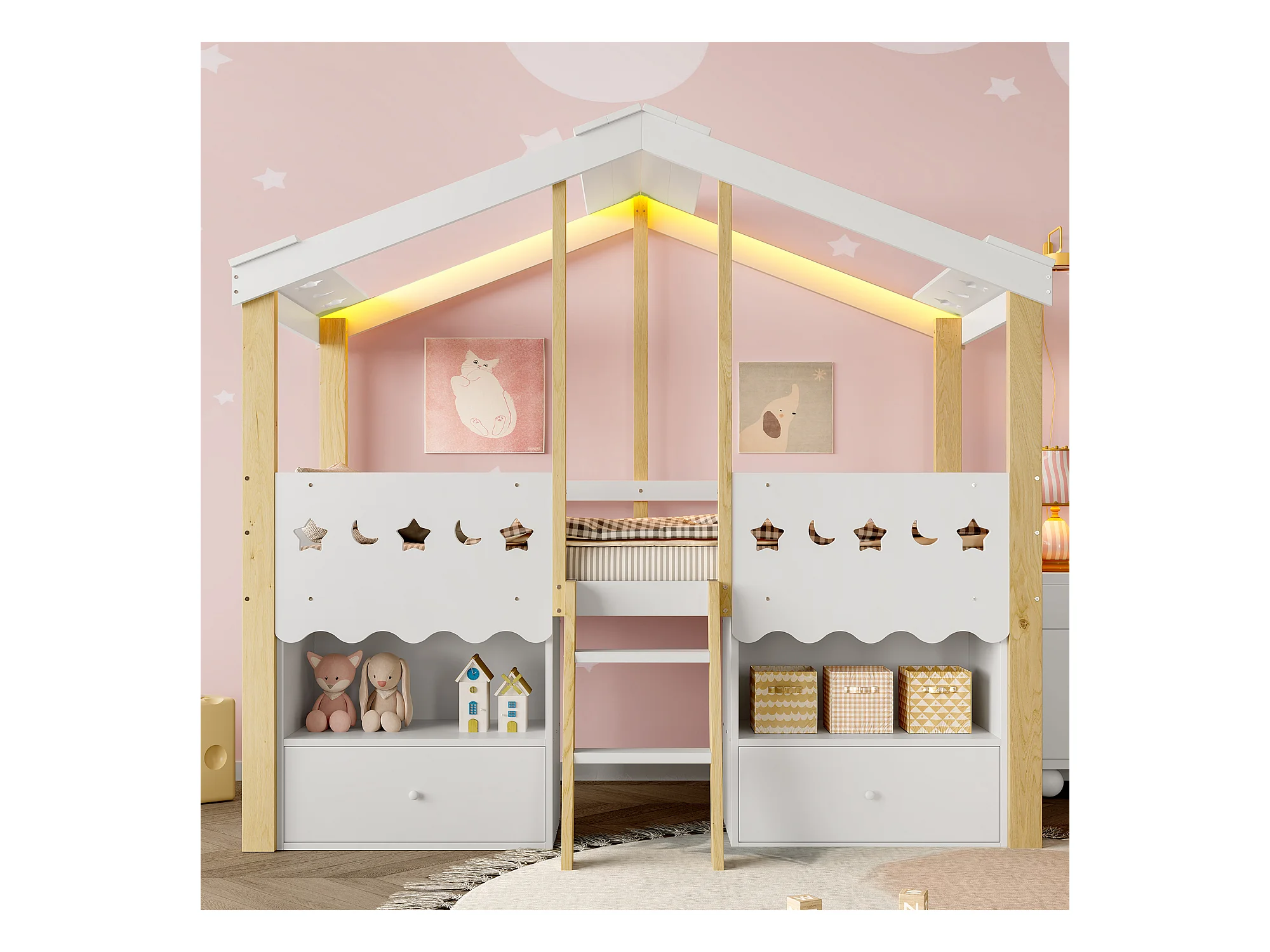 Lit mi-hauteur cabane enfant couleur blanc et naturel 90x200cm avec 2 tiroirs, lumière LED et échelle (sans matelas)