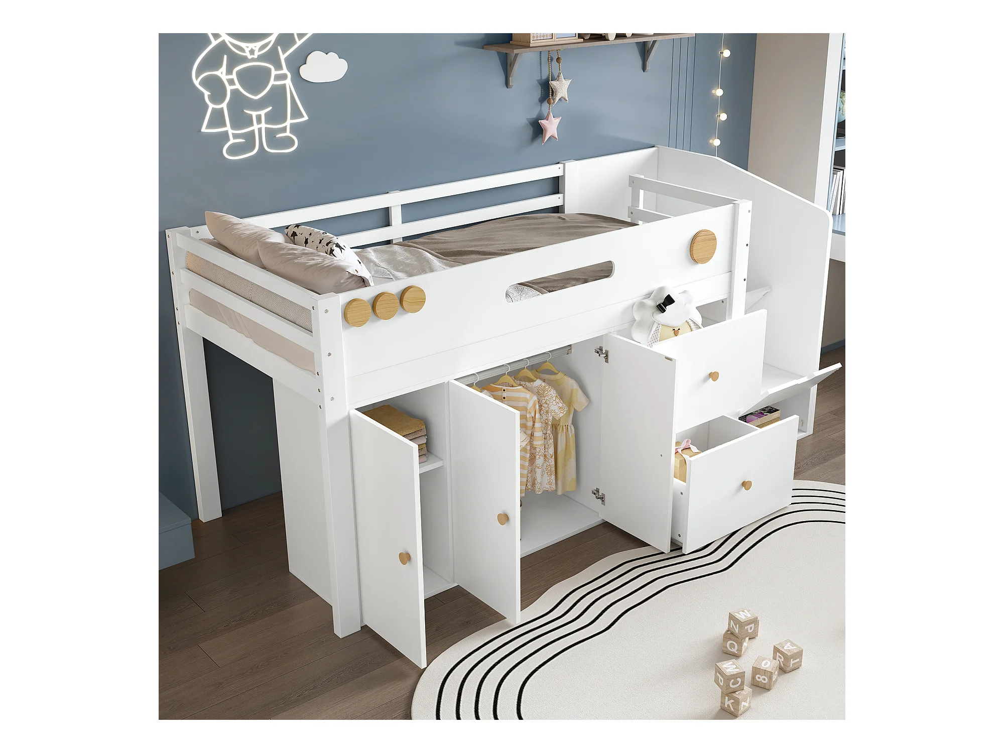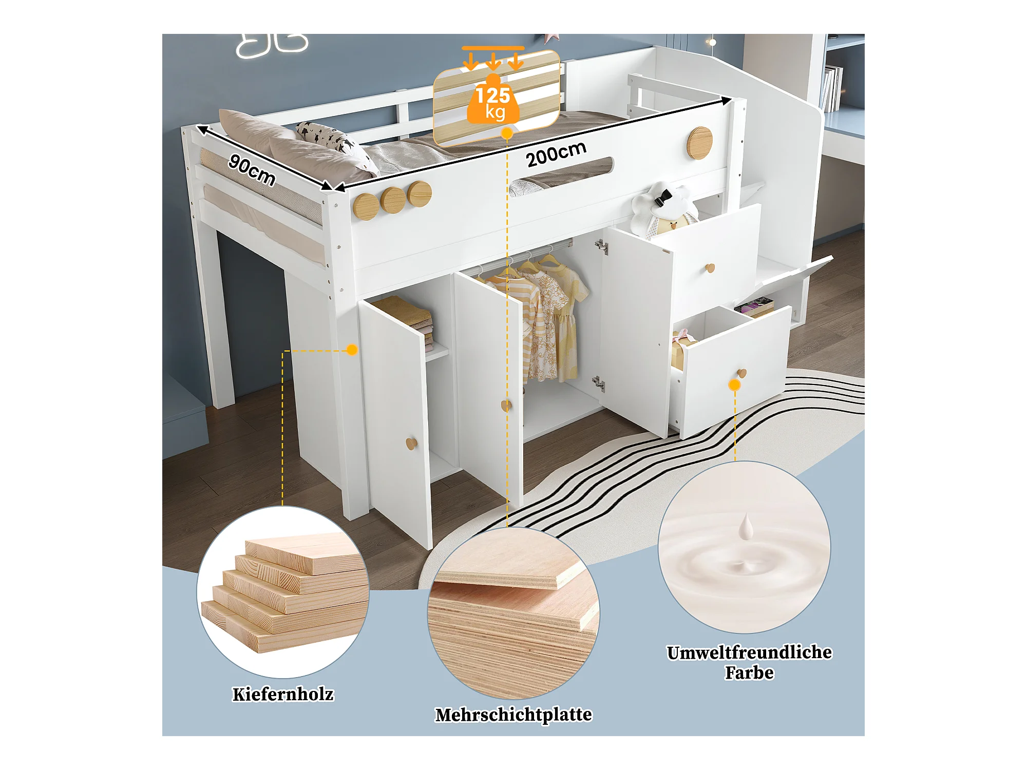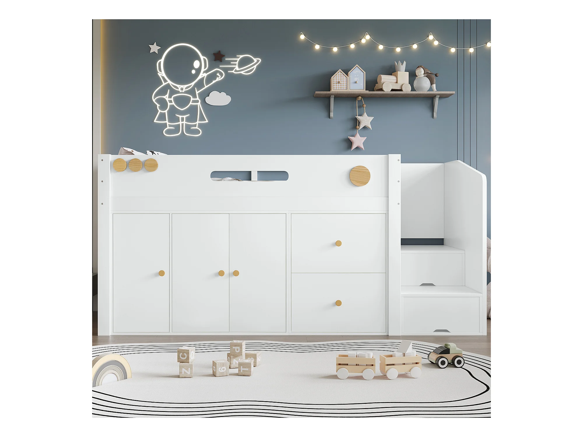 Lit mi-hauteur enfant - 90 x 200 cm - avec escalier rangement + 3 portes + 2 tiroirs + penderie - pin + MDF - blanc