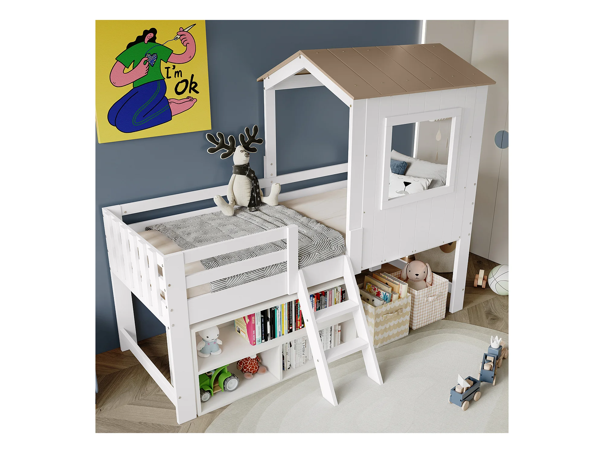 Lit mi-hauteur enfant - 90 x 200 cm - lit cabane avec toit et fenêtre - pin + MDF - blanc + naturel