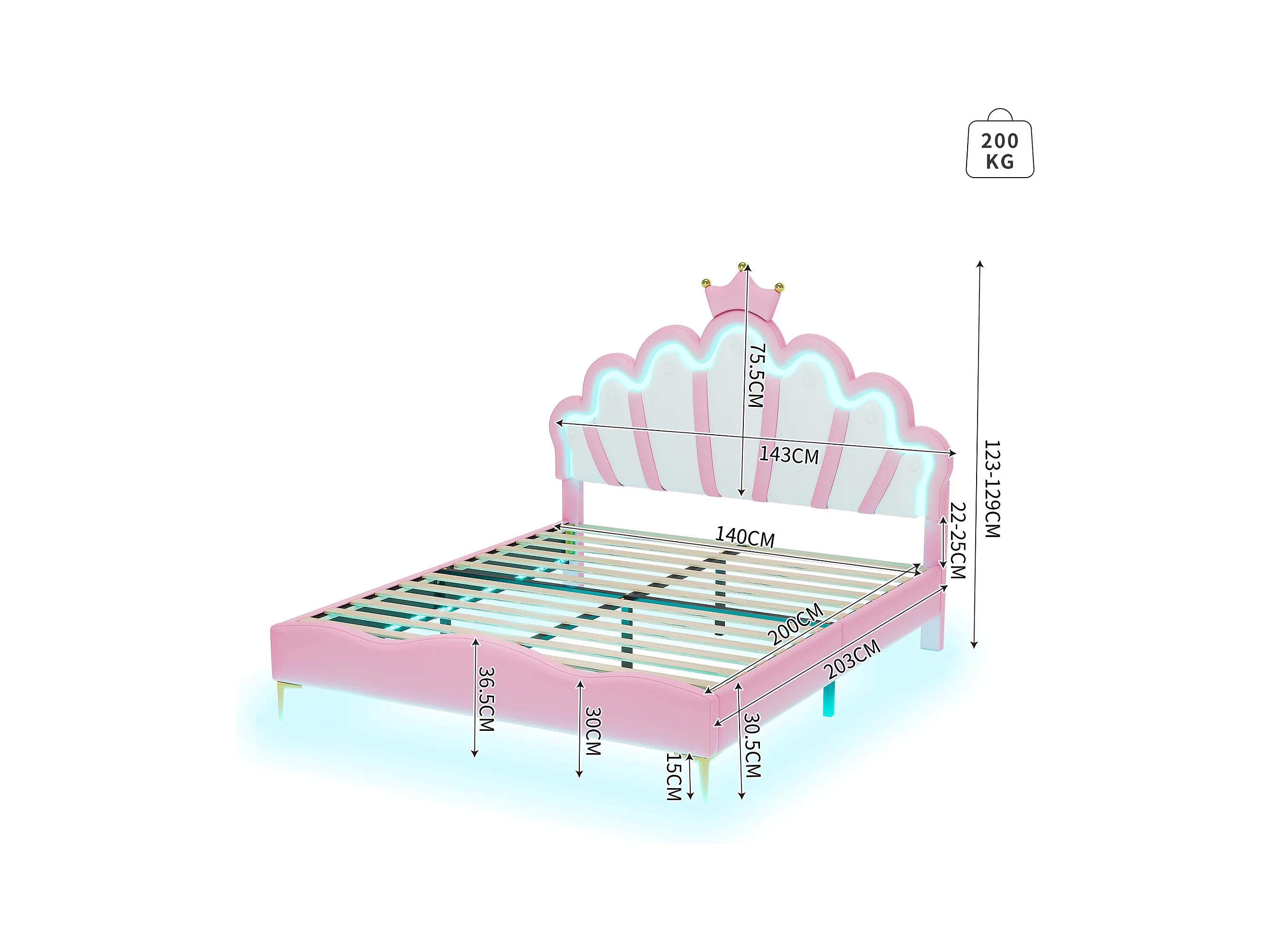 Lit 140x200 cm en cuir PU coussin lit princesse en forme de couronne avec LED - rose