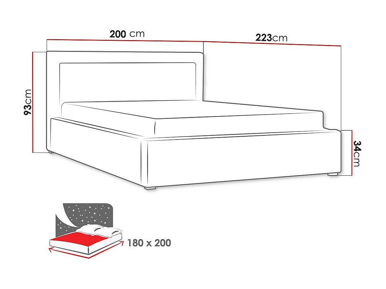 Lit Pomona 102, Double, Gris, 180x200, Tapisserie, Sommier à lattes, 200x223x93cm