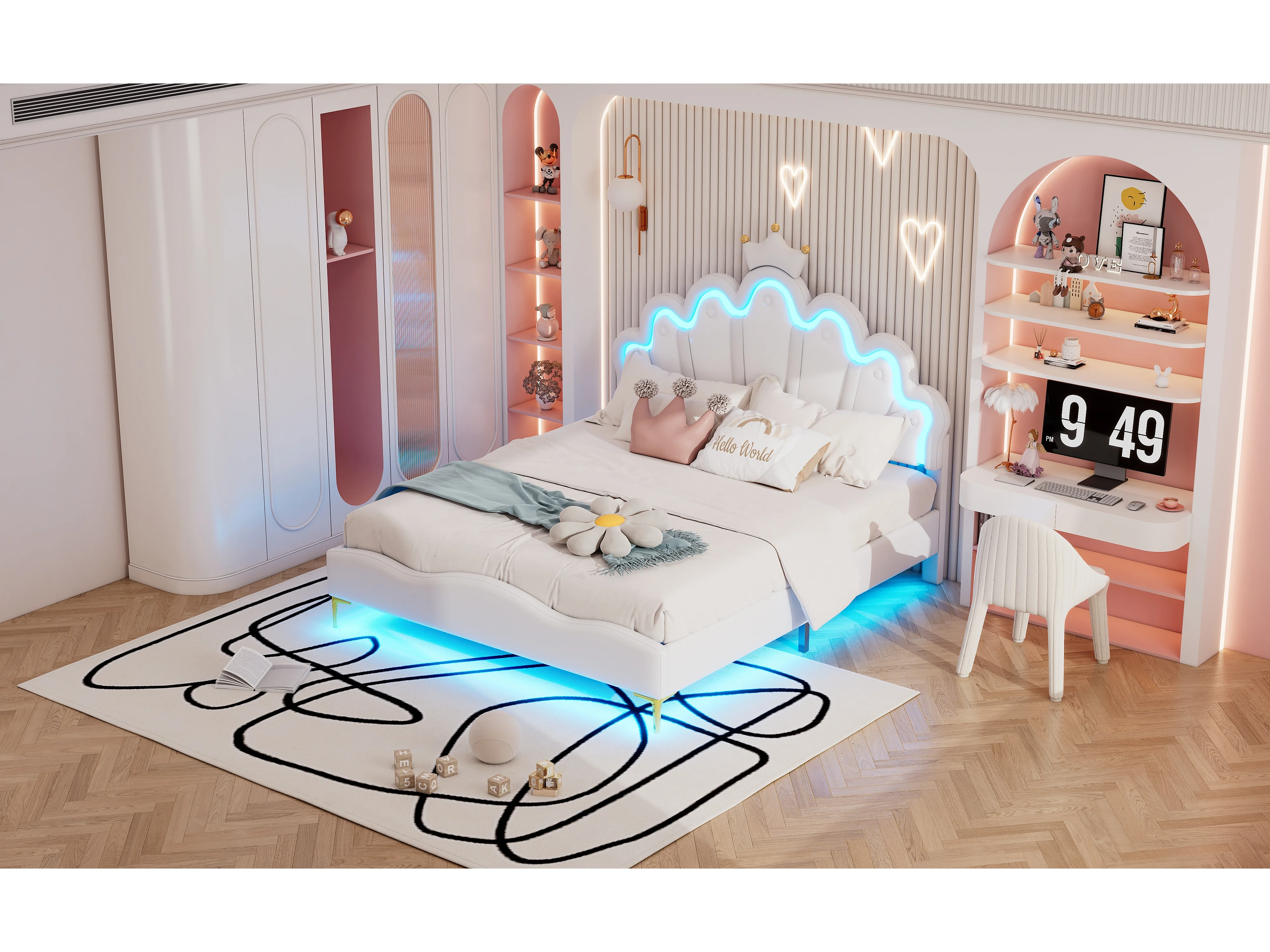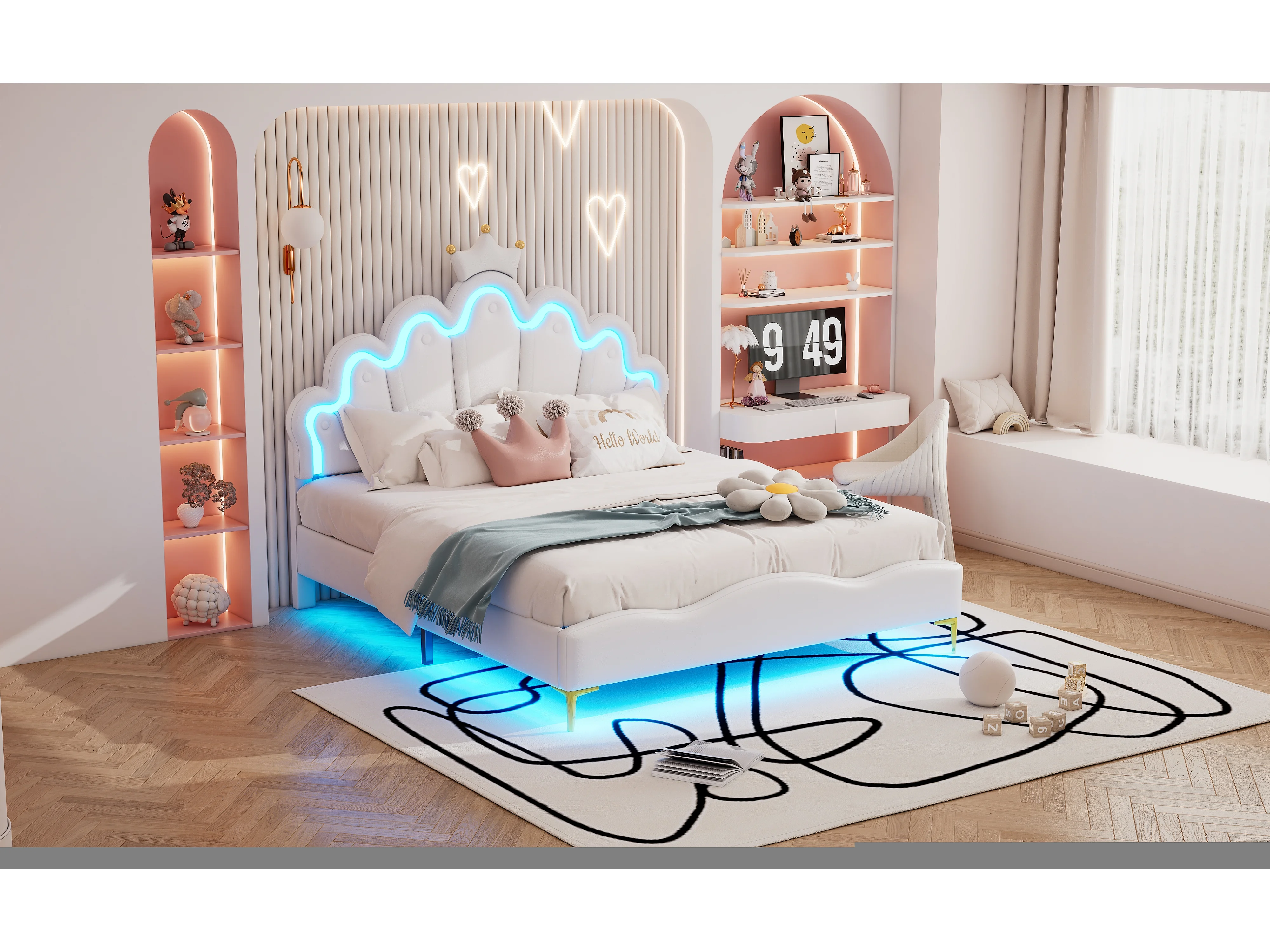 Lit princesse 140x200 cm blanc, double lit plat en cuir PU rembourré, tête couronne, éclairage LED réglable
