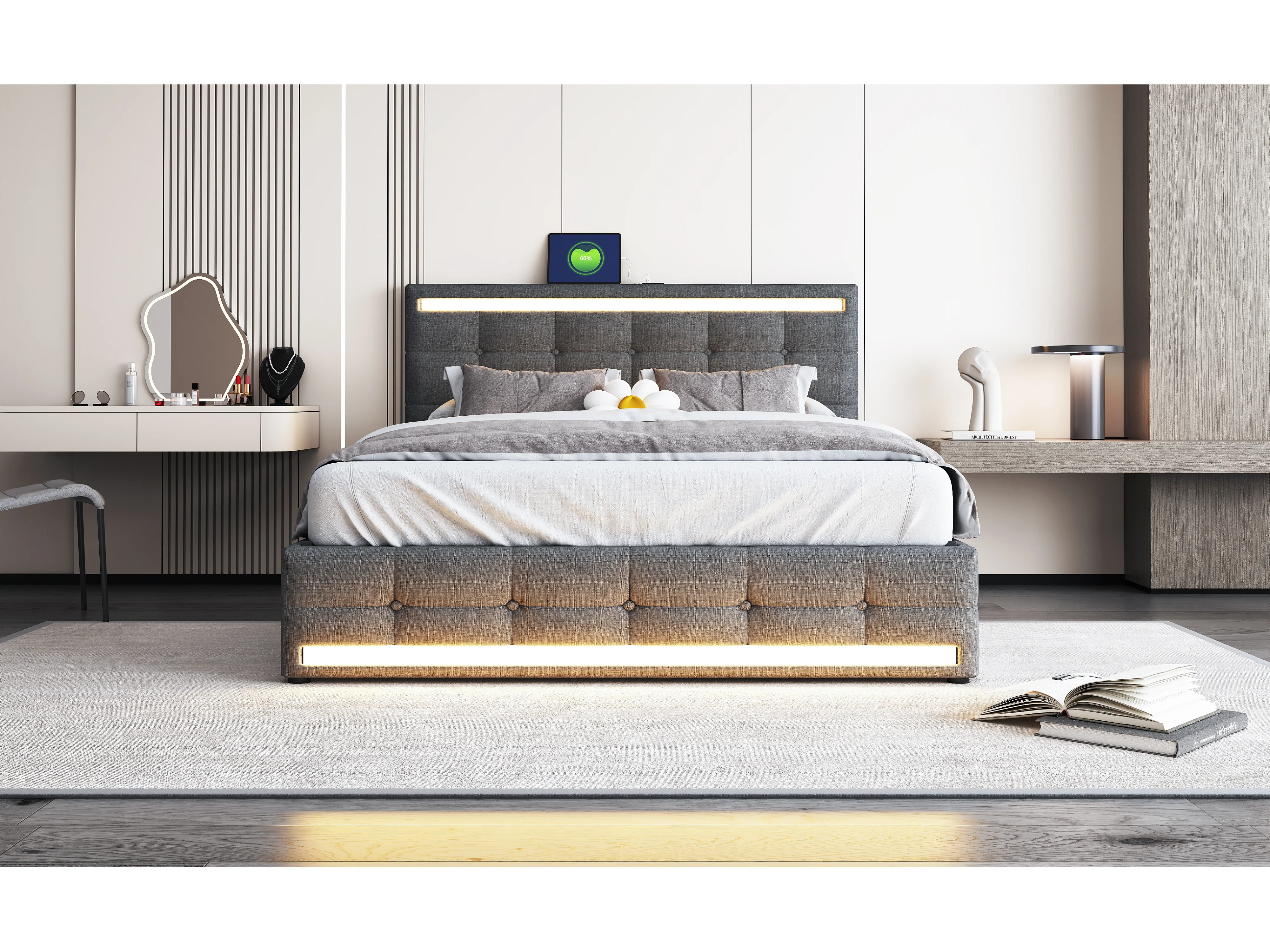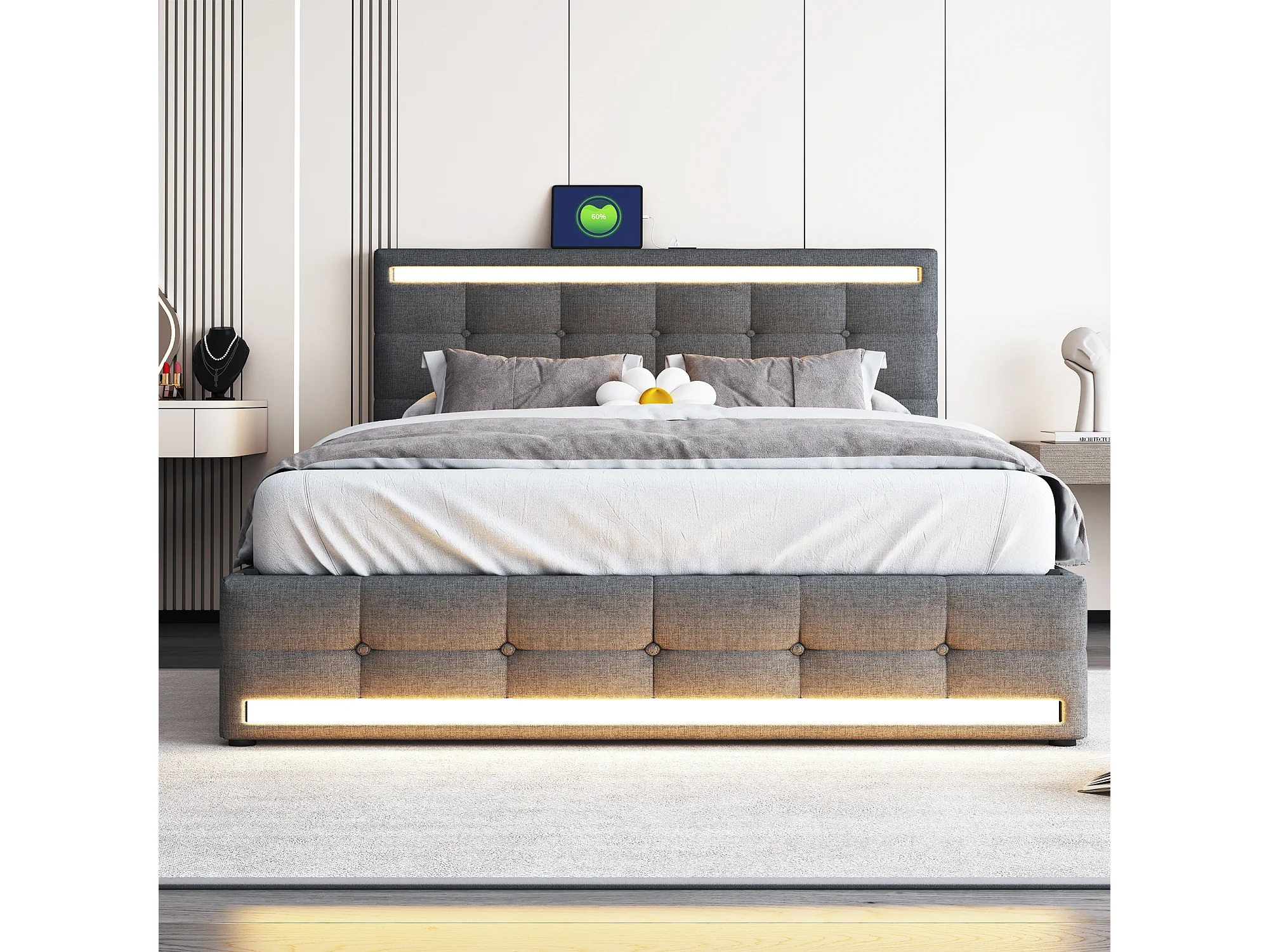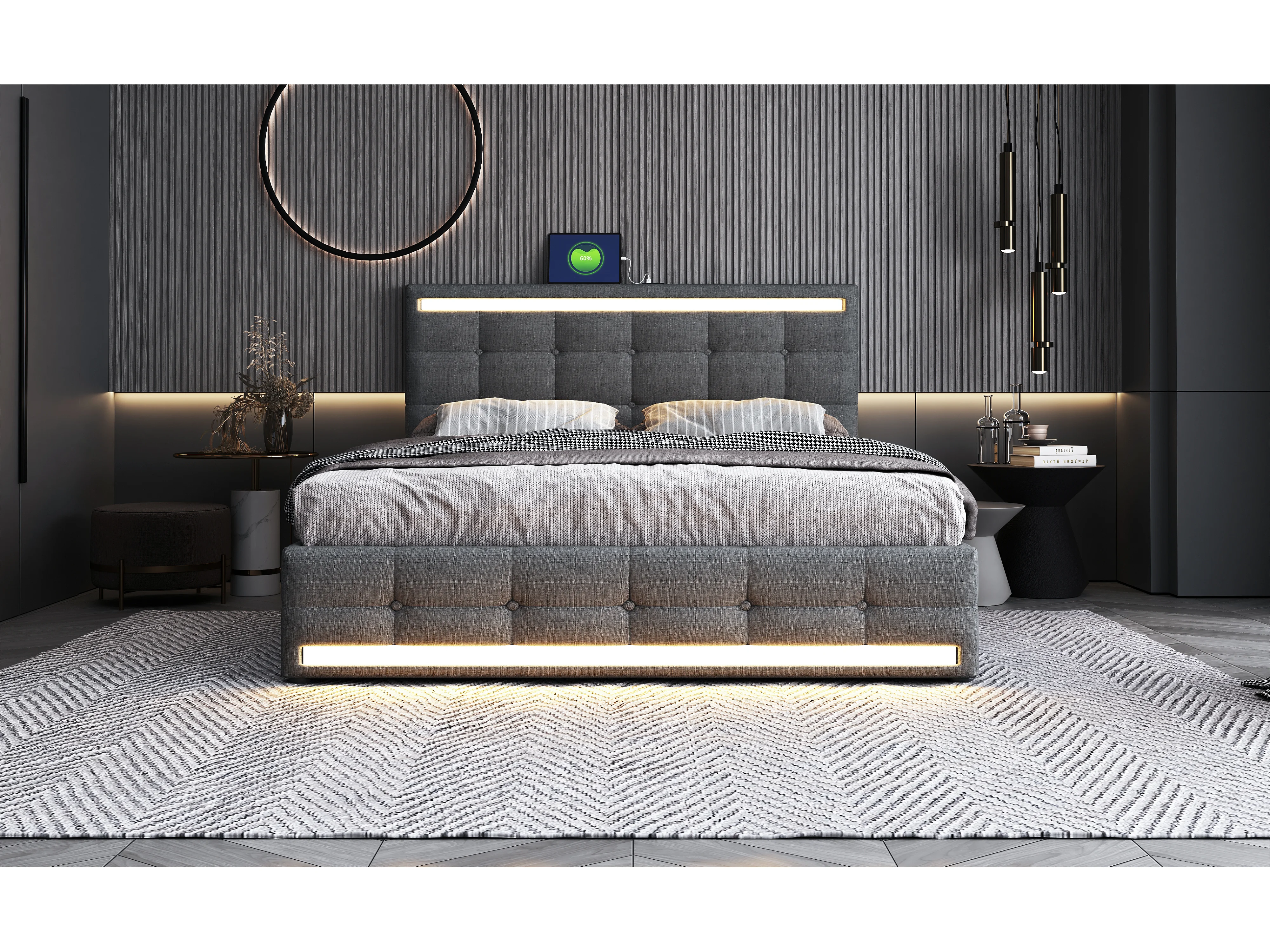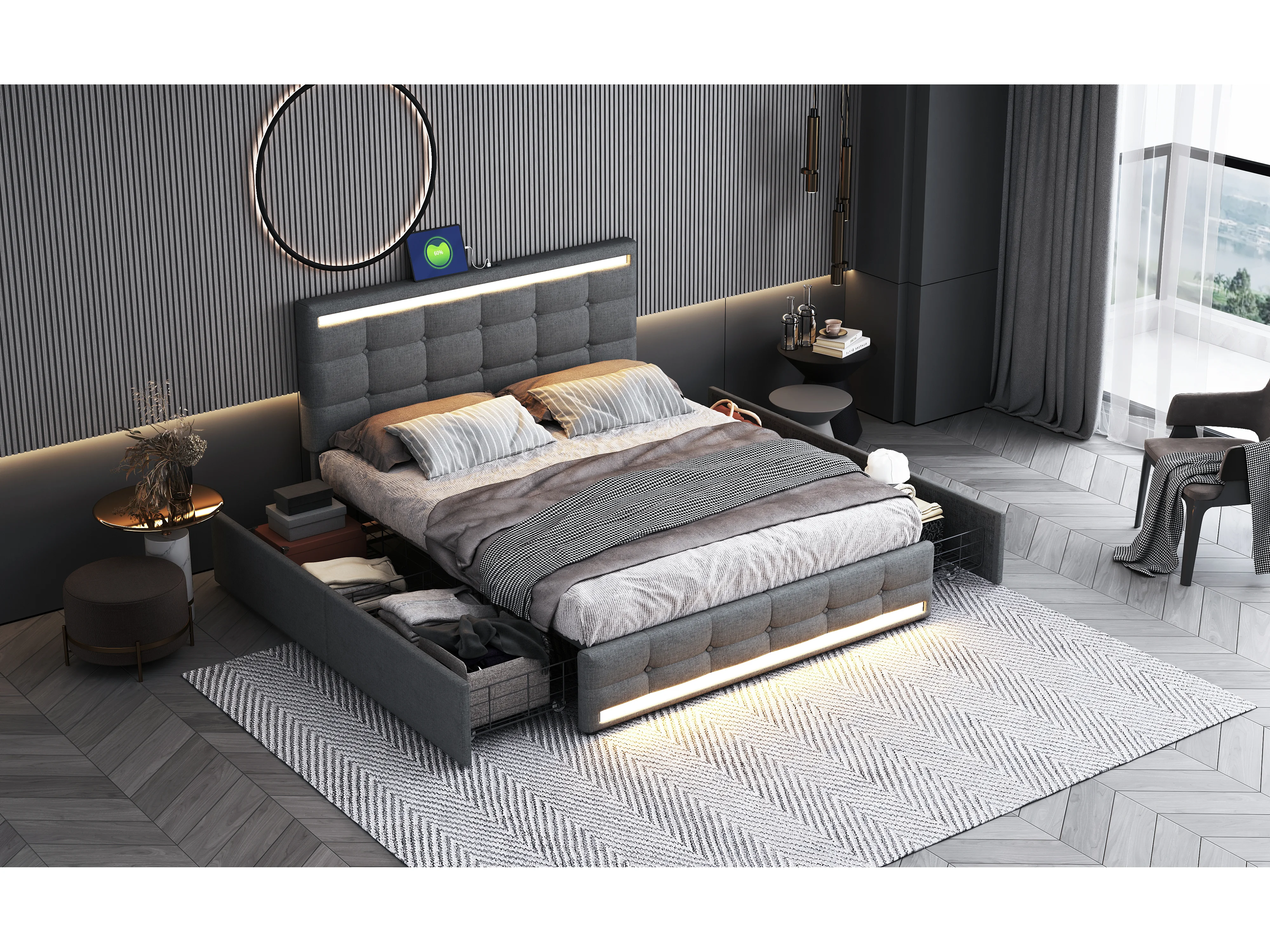Lit rembourré 140×200 cm avec éclairage LED, 4 tiroirs et 2 ports USB, cadre de lit moderne en lin gris