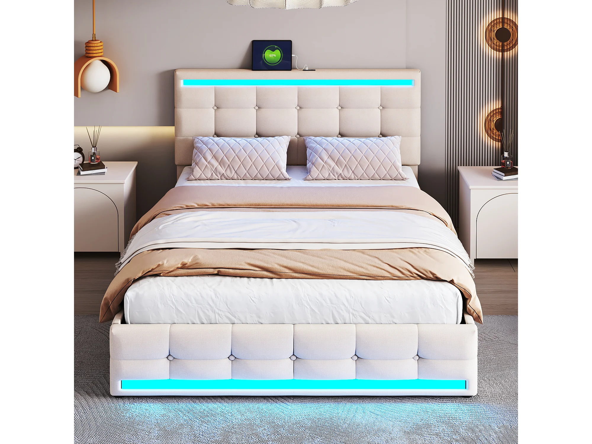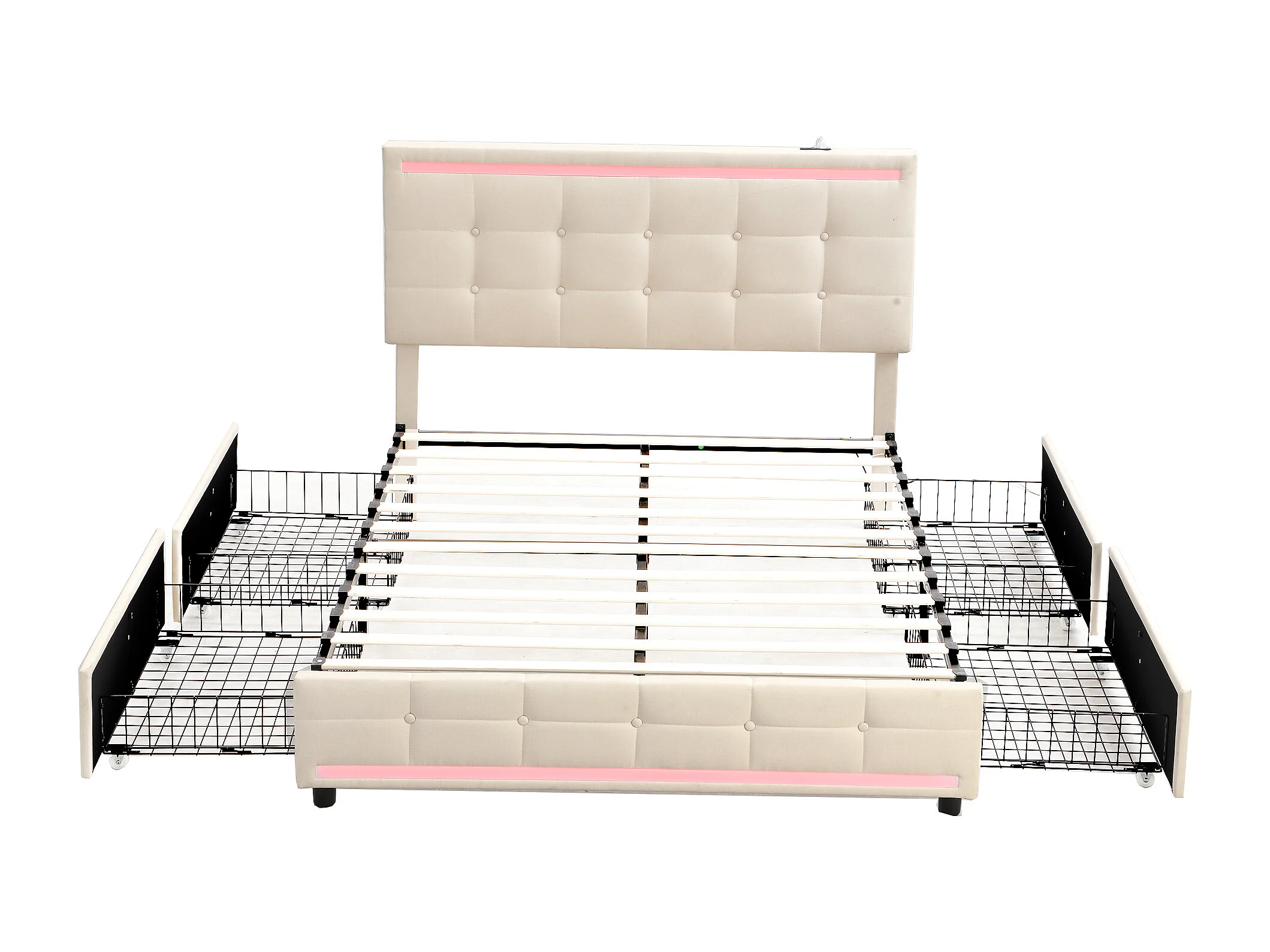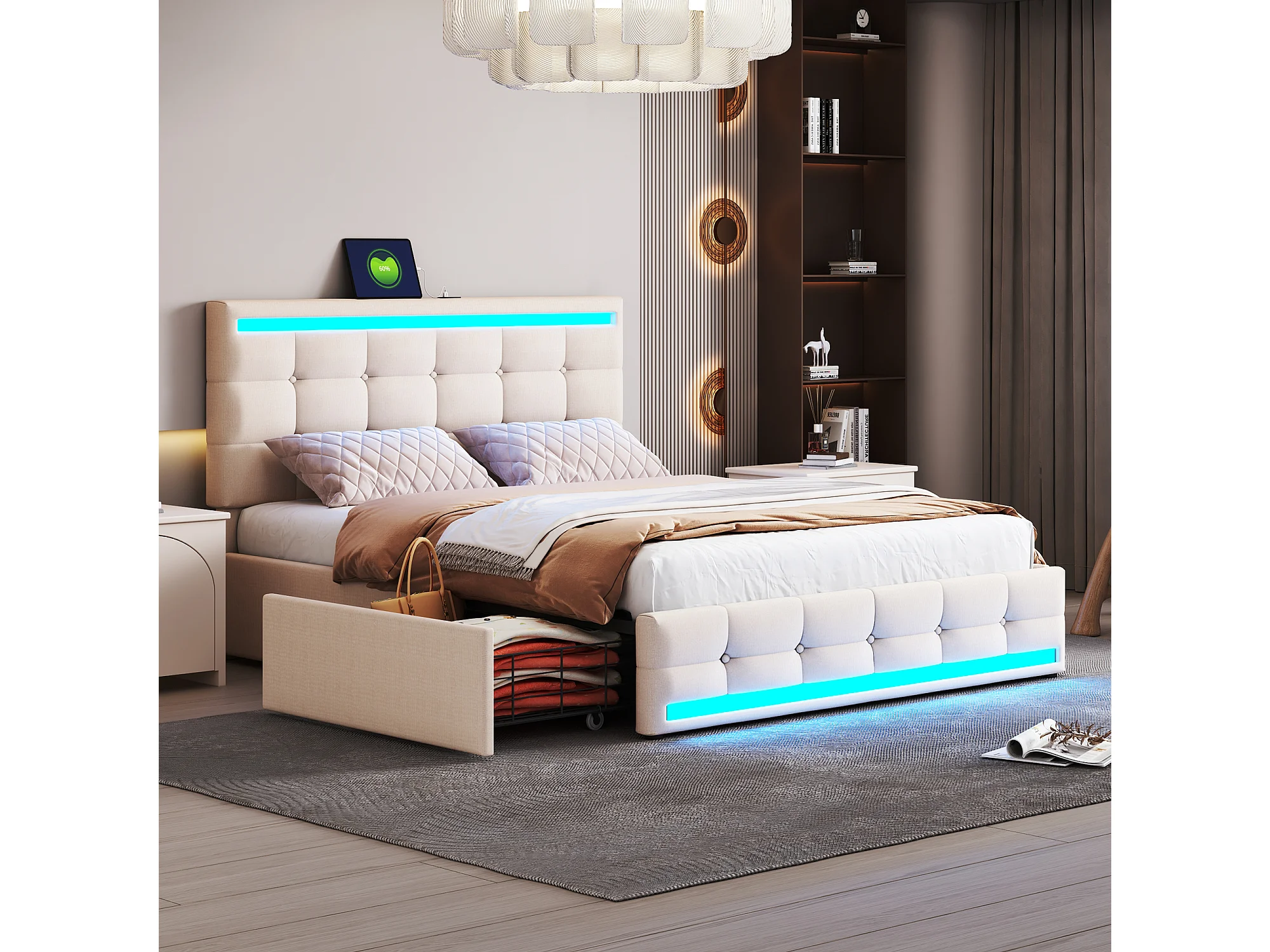 Lit rembourré 140×200 cm avec éclairage LED, 4 tiroirs et 2 ports USB, en lin beige