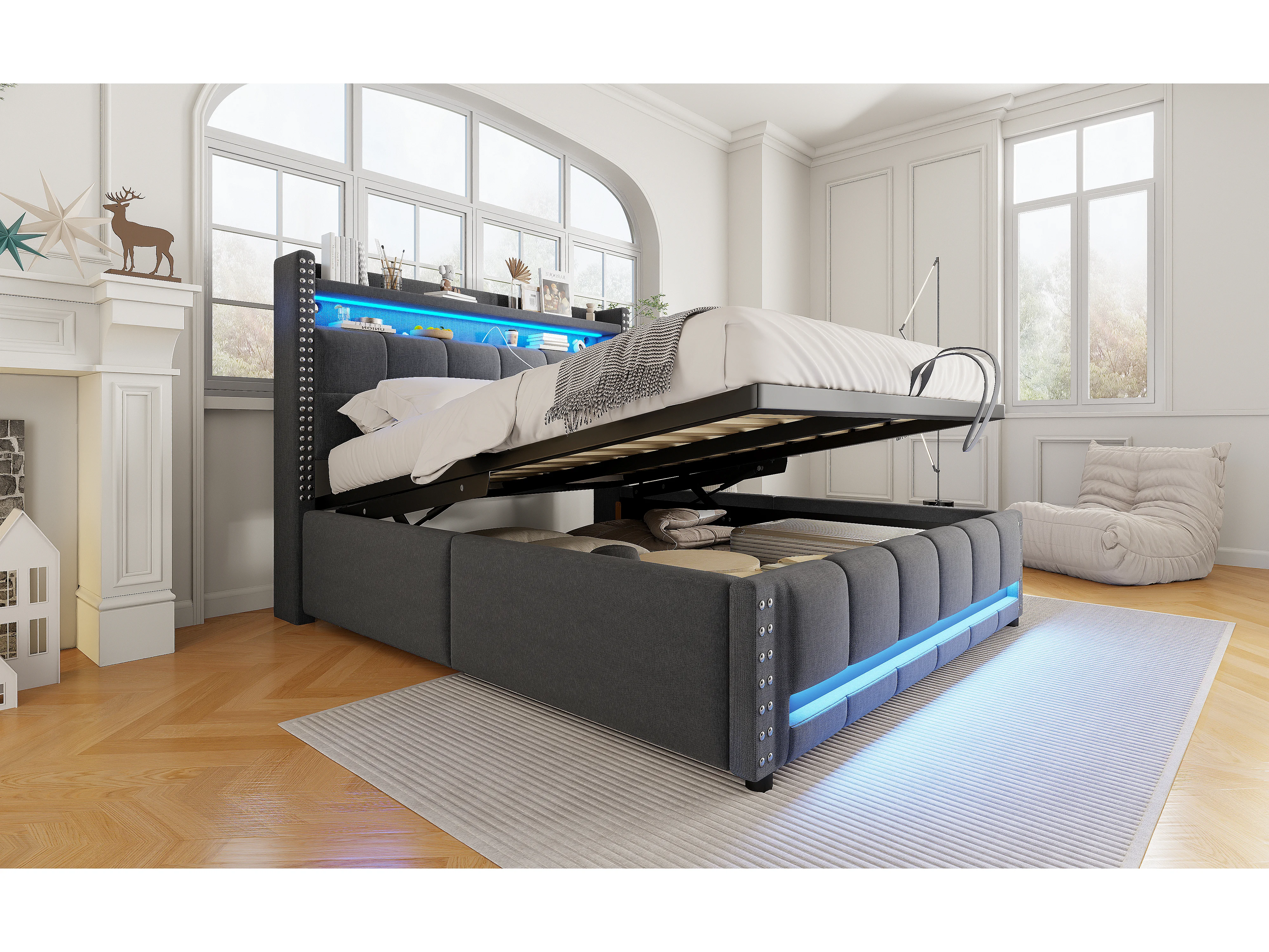 Lit rembourré 140×200 cm avec éclairage LED et prise USB, tête de lit avec étagères et rangement