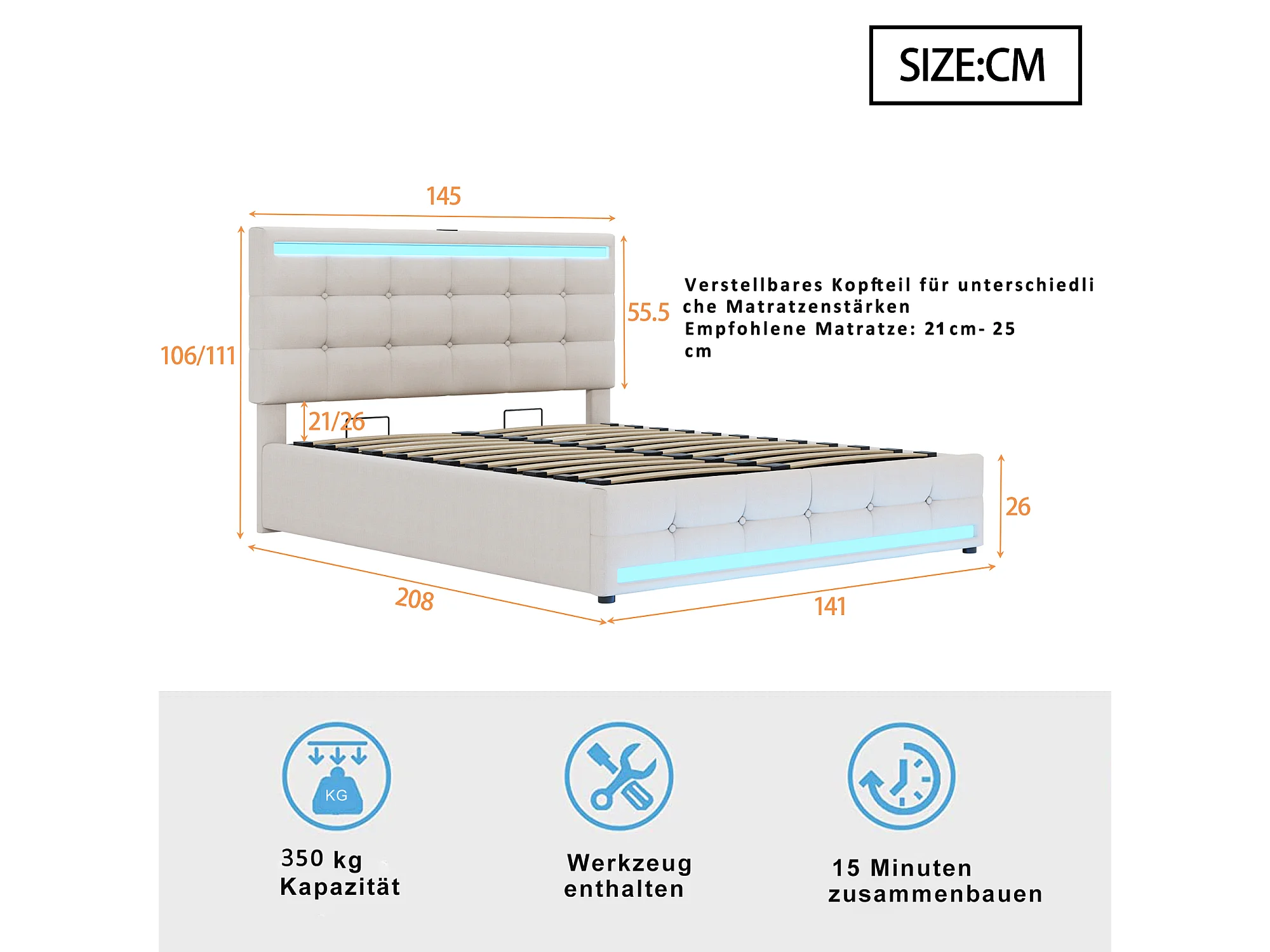 Lit rembourré 140×200 cm avec éclairage LED et rangement pratique, tissu en lin beige