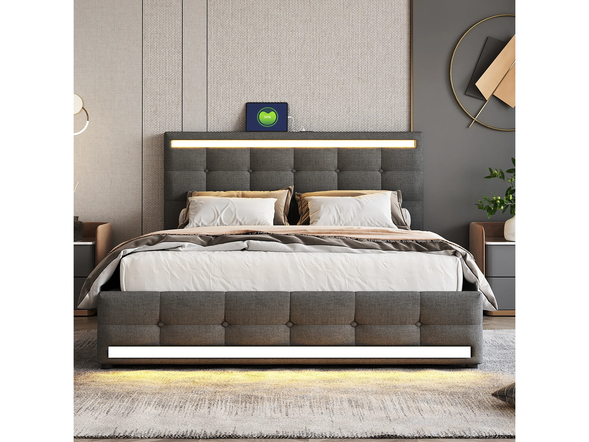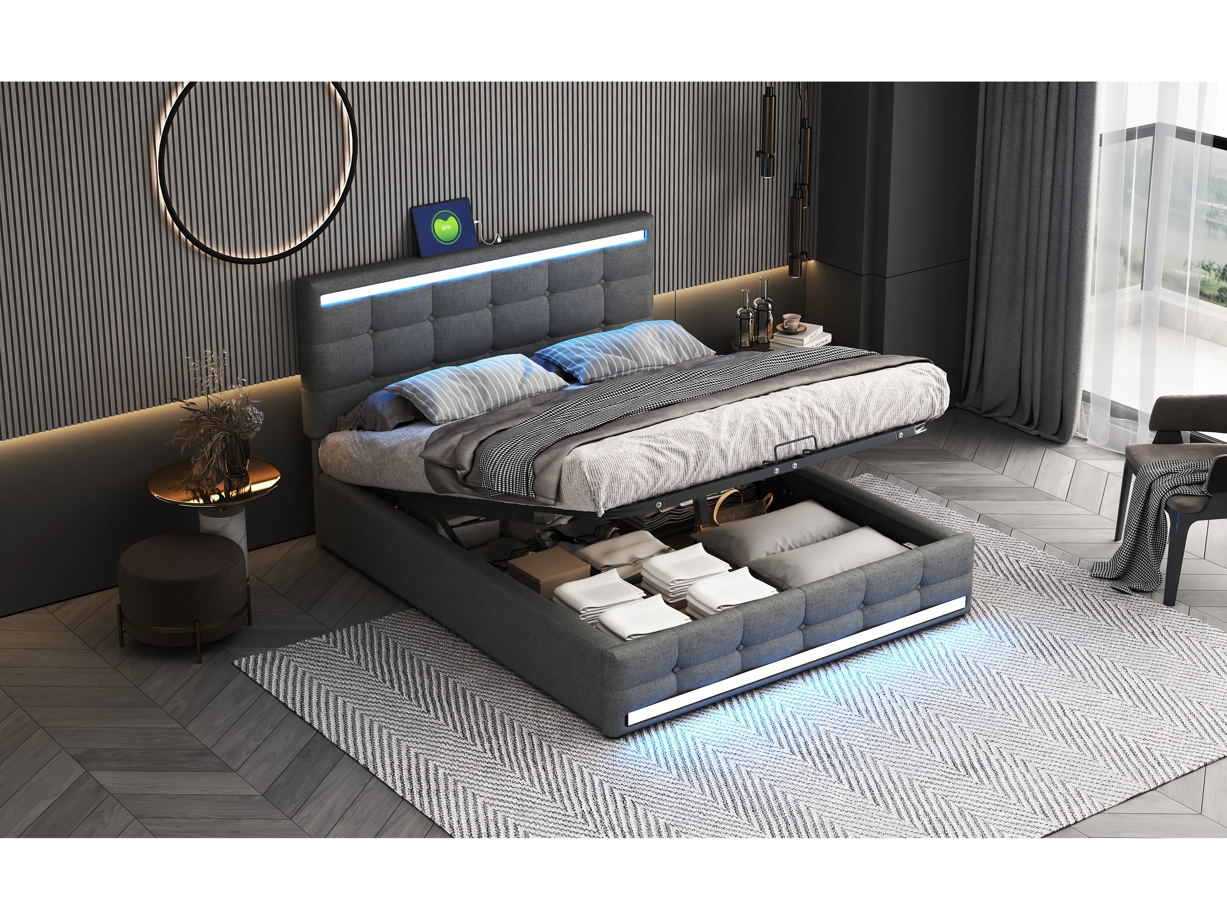 Lit rembourré 140×200 cm avec éclairage LED, rangement spacieux et 2 ports USB