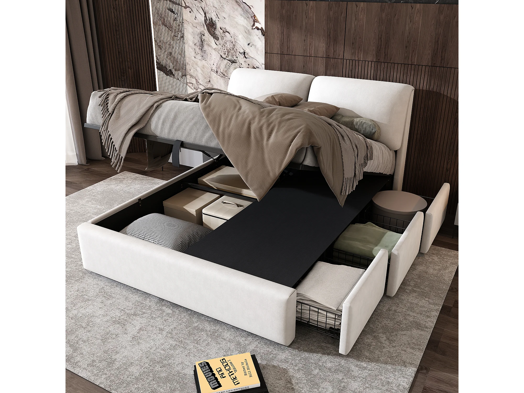 Lit rembourré 140×200 cm, beige, avec tête de lit réglable, trois tiroirs et coffre de rangement