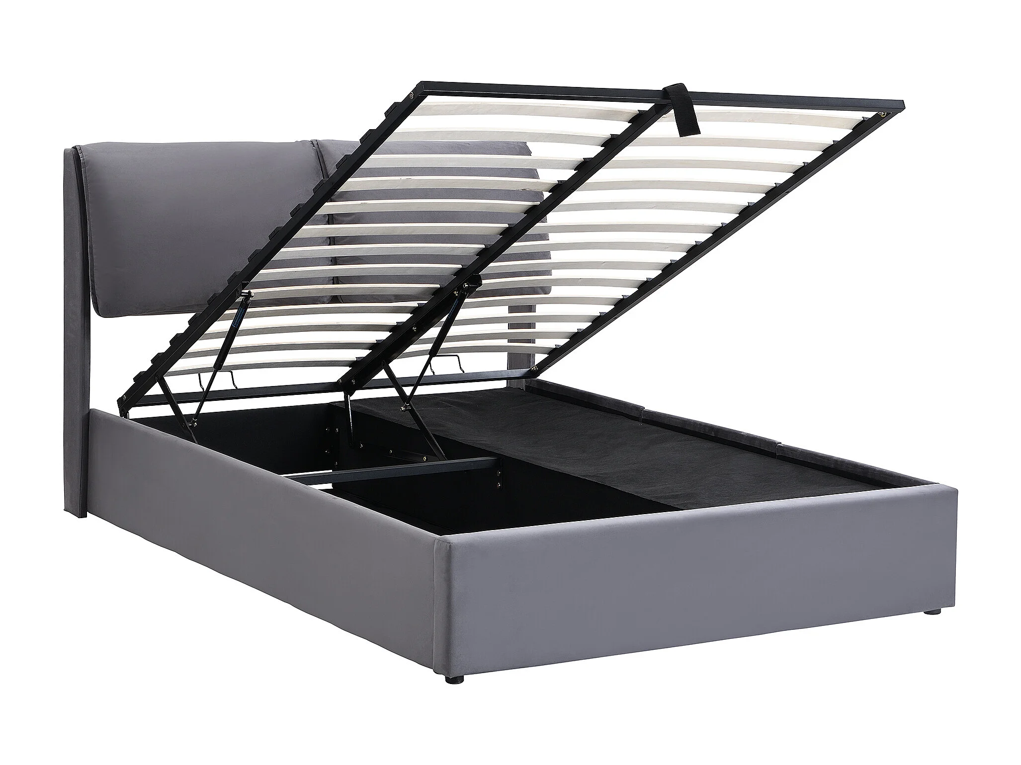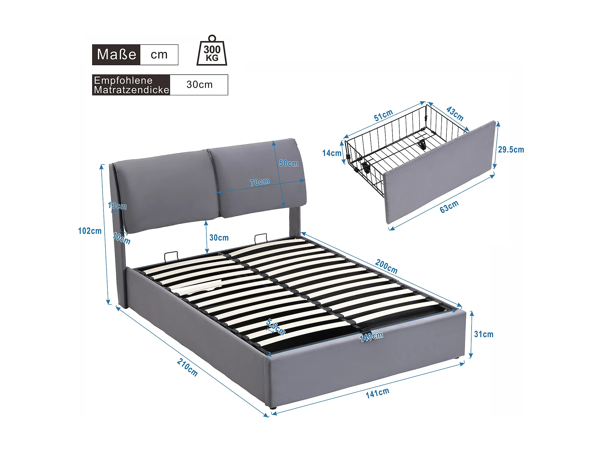 Lit rembourré 140×200 cm, gris, avec tête de lit réglable, trois tiroirs et coffre de rangement
