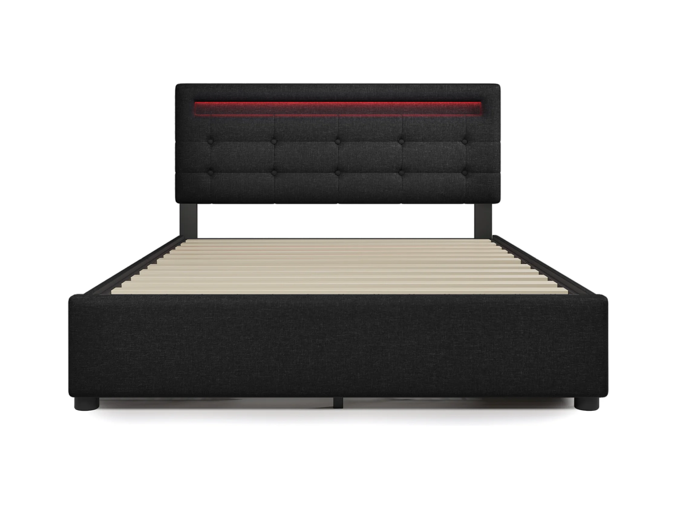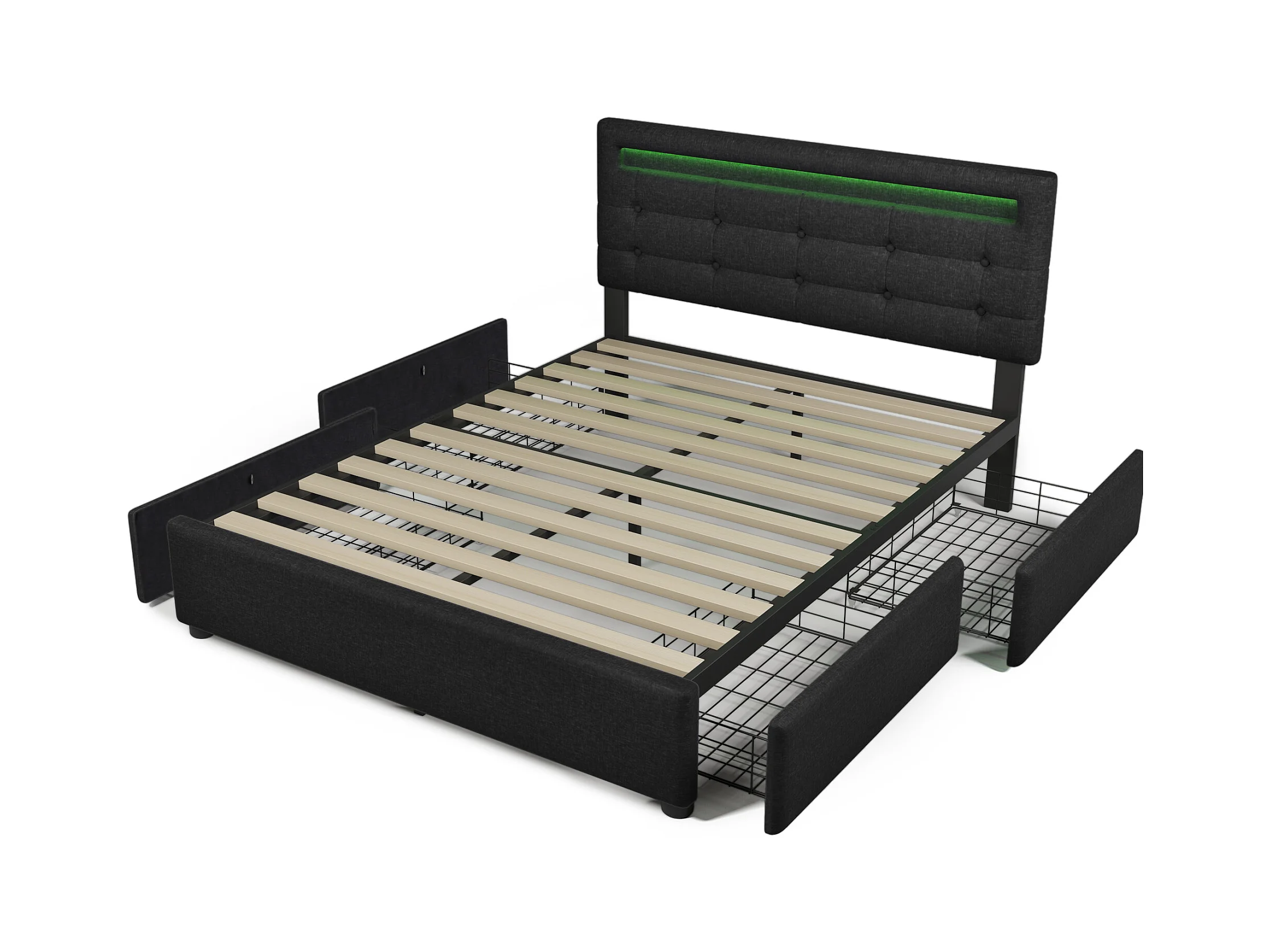 Lit adulte 140x200 cm - Lit double avec 4 tiroirs et tête de lit réglable - éclairage LED - lin noir