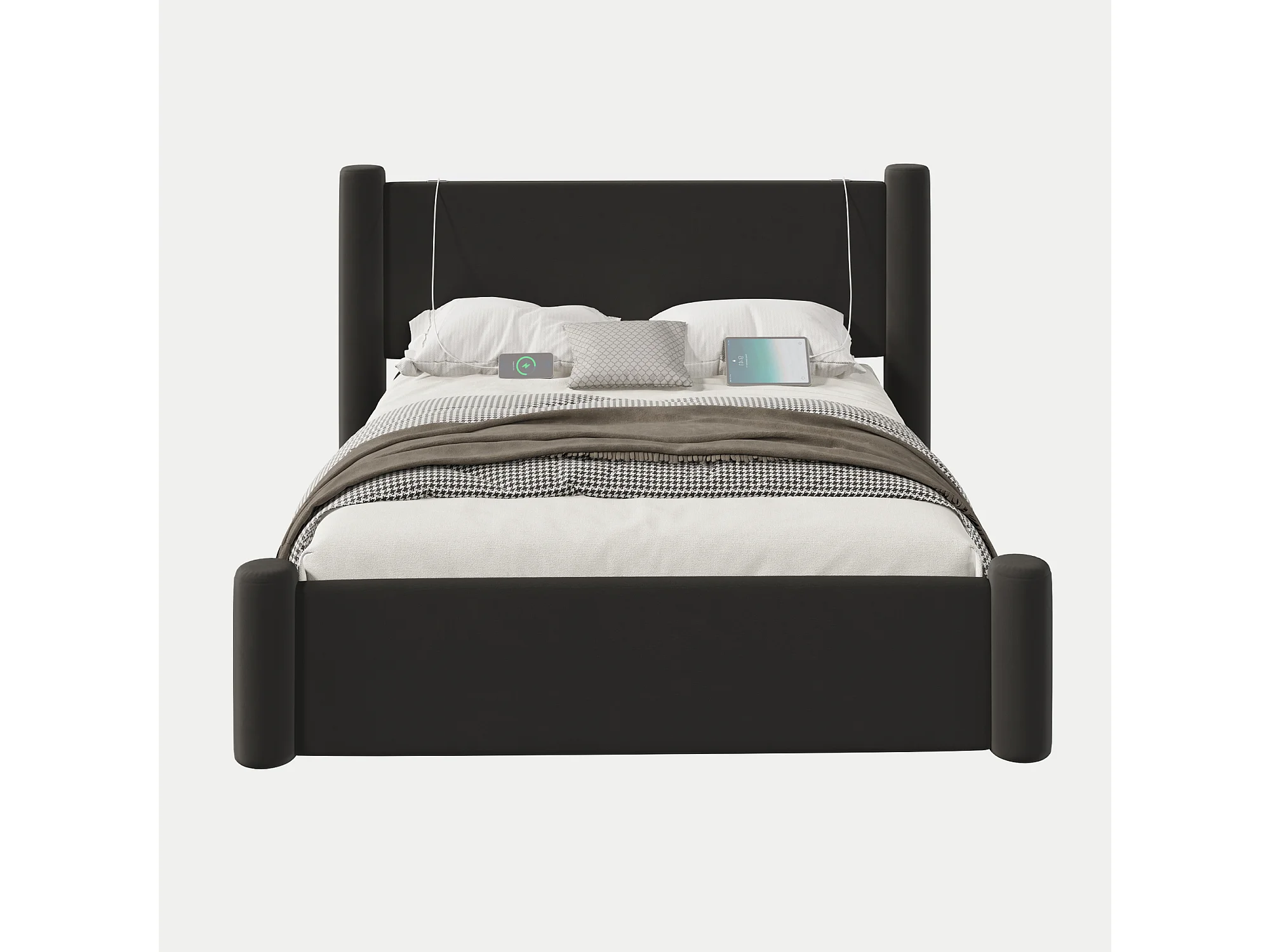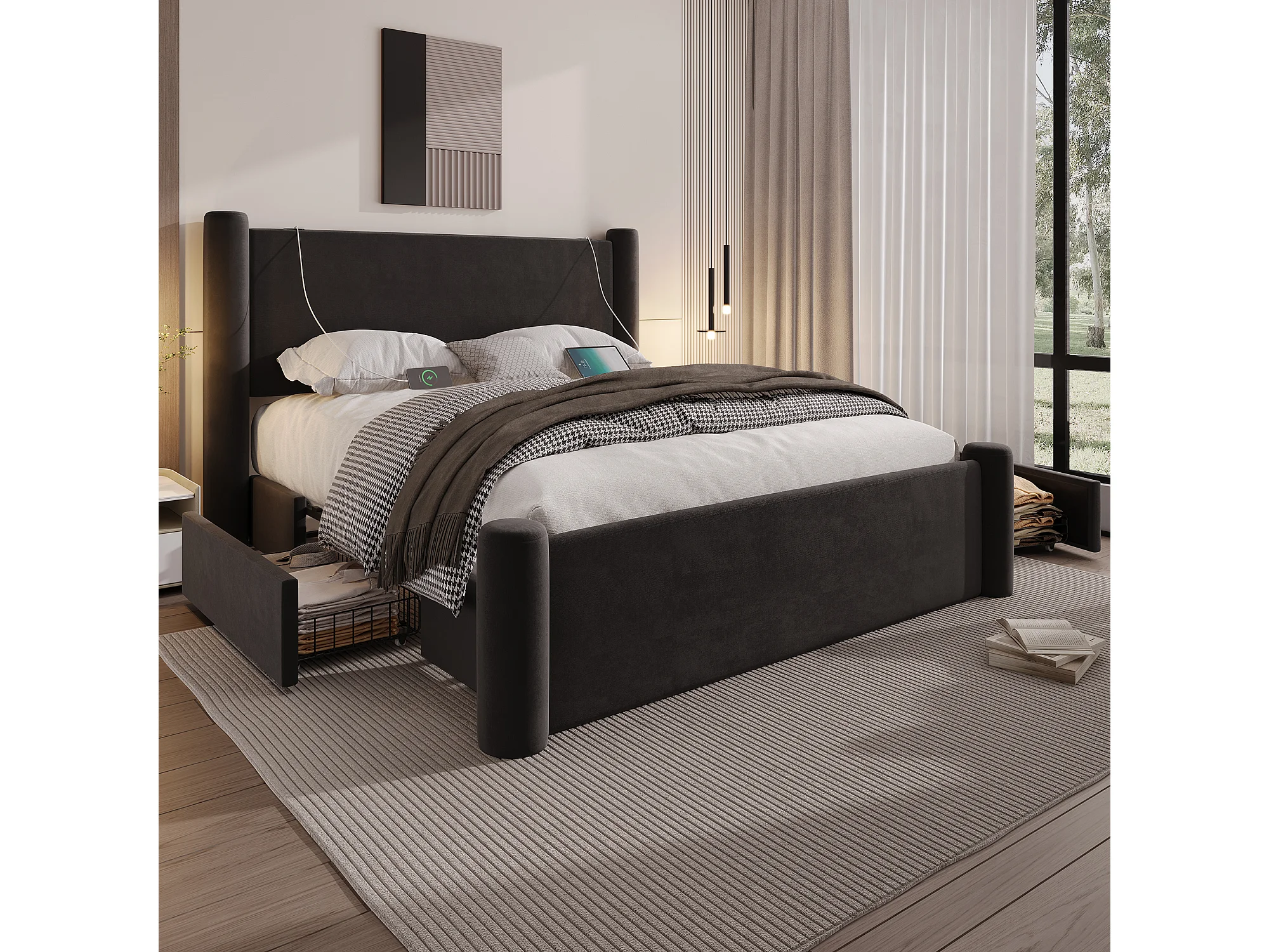 Lit double 140x200 cm - Lit adulte avec chargeur USB et 2 tiroirs - pieds cylindriques - velours noir