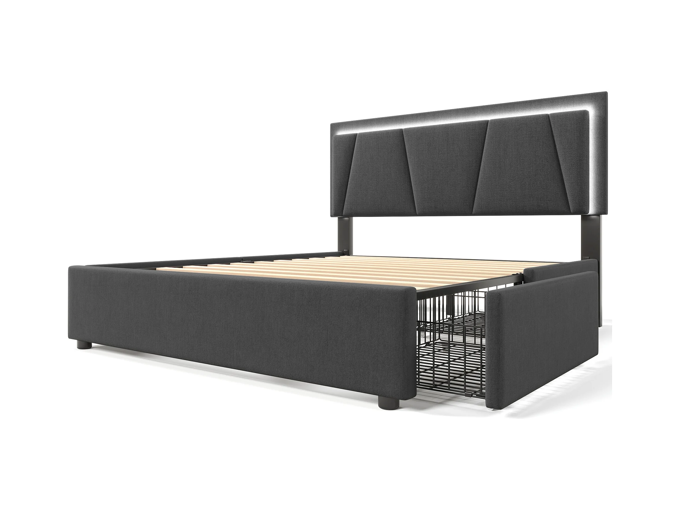 Lit adulte 140x200 cm - Lit double avec 4 tiroirs et tête de lit réglable - Éclairage LED - gris