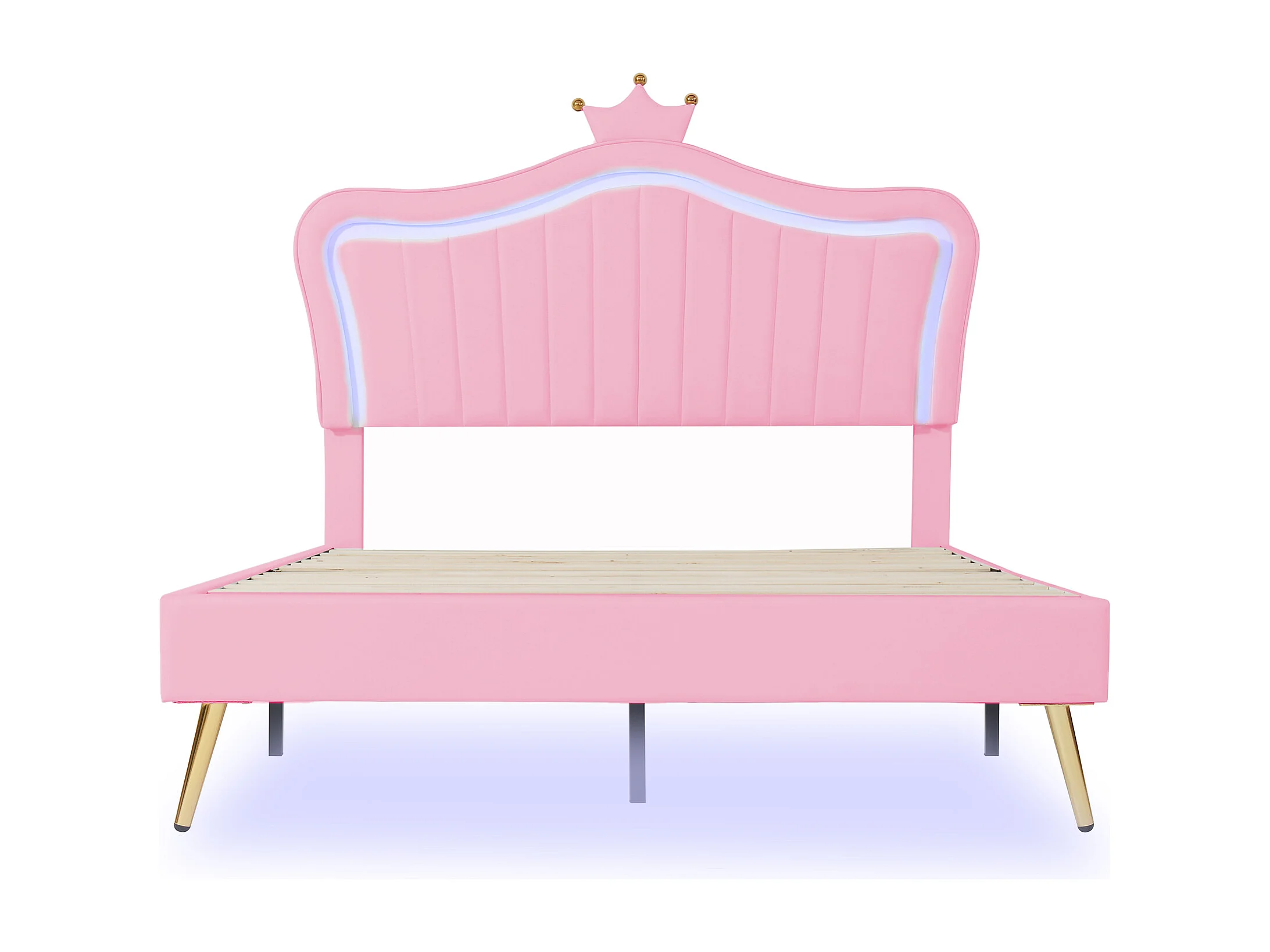 Lit rembourré 140x200 cm pour fille, lit couronne rose en PU cuir avec LED, sommier et tête, matelas non inclus