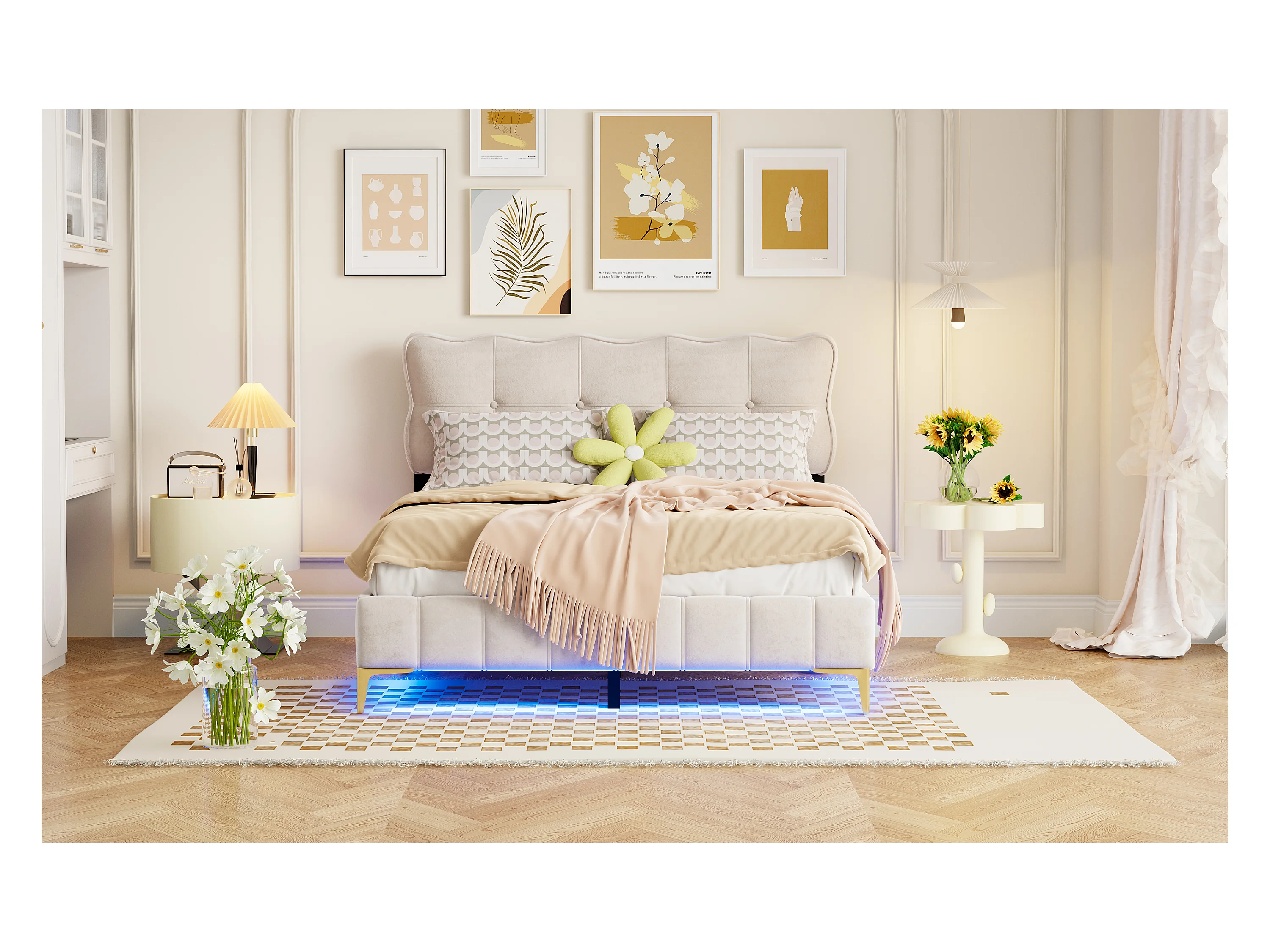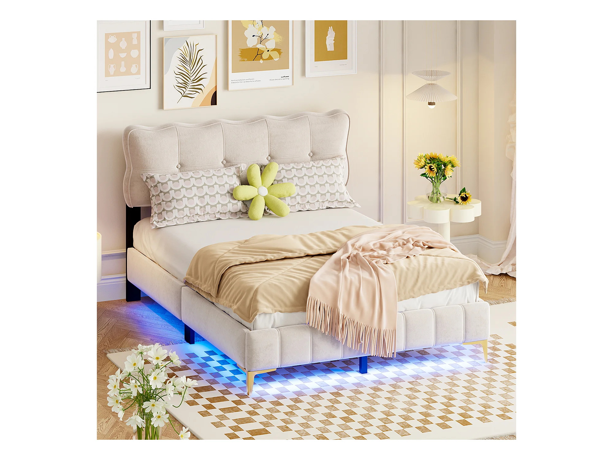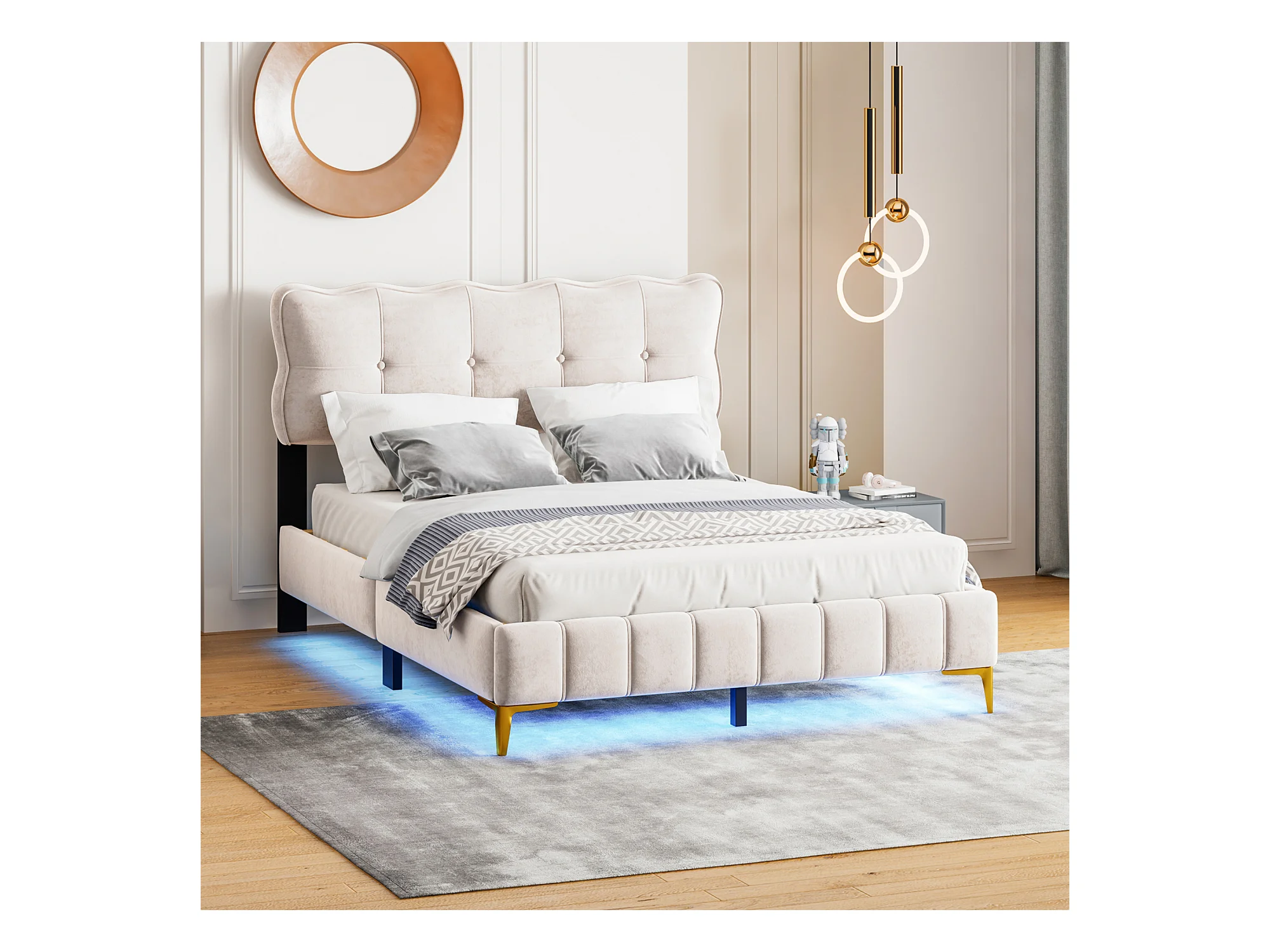 Lit rembourré 140x200 cm pour jeunes, LED intégrées, tête rembourrée, sommier métal, velours beige
