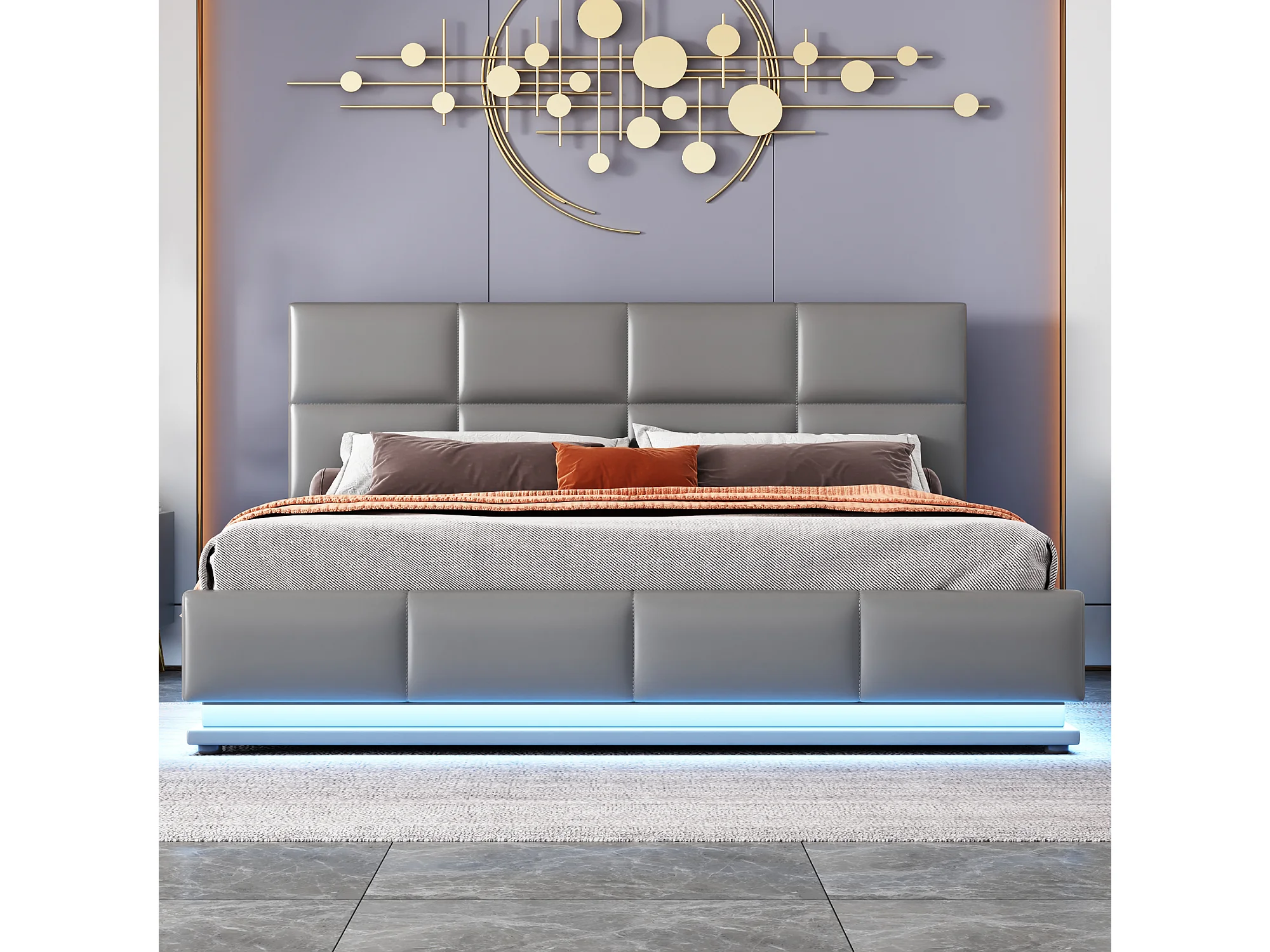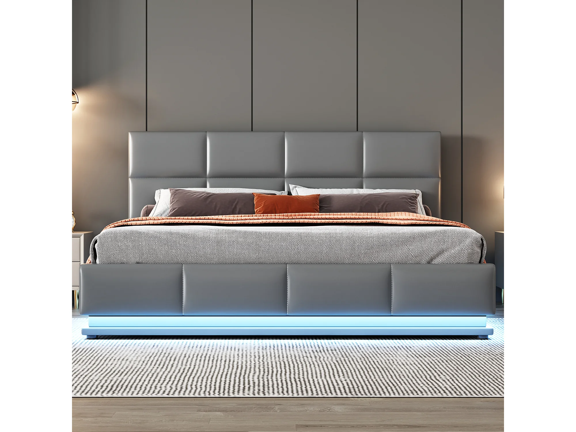 Lit rembourré 160 x 200 cm avec LED, sommier à lattes en métal et coffre de rangement, tête de lit réglable en hauteur, gris