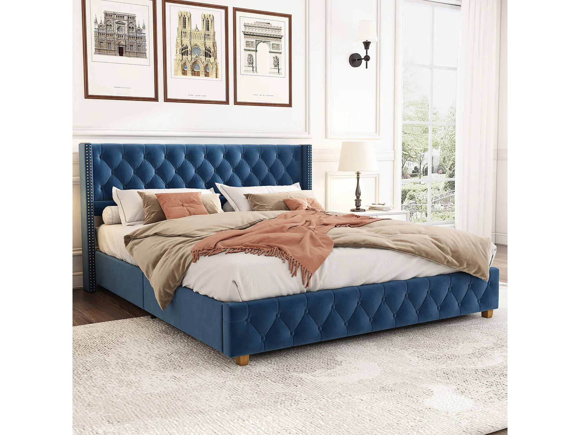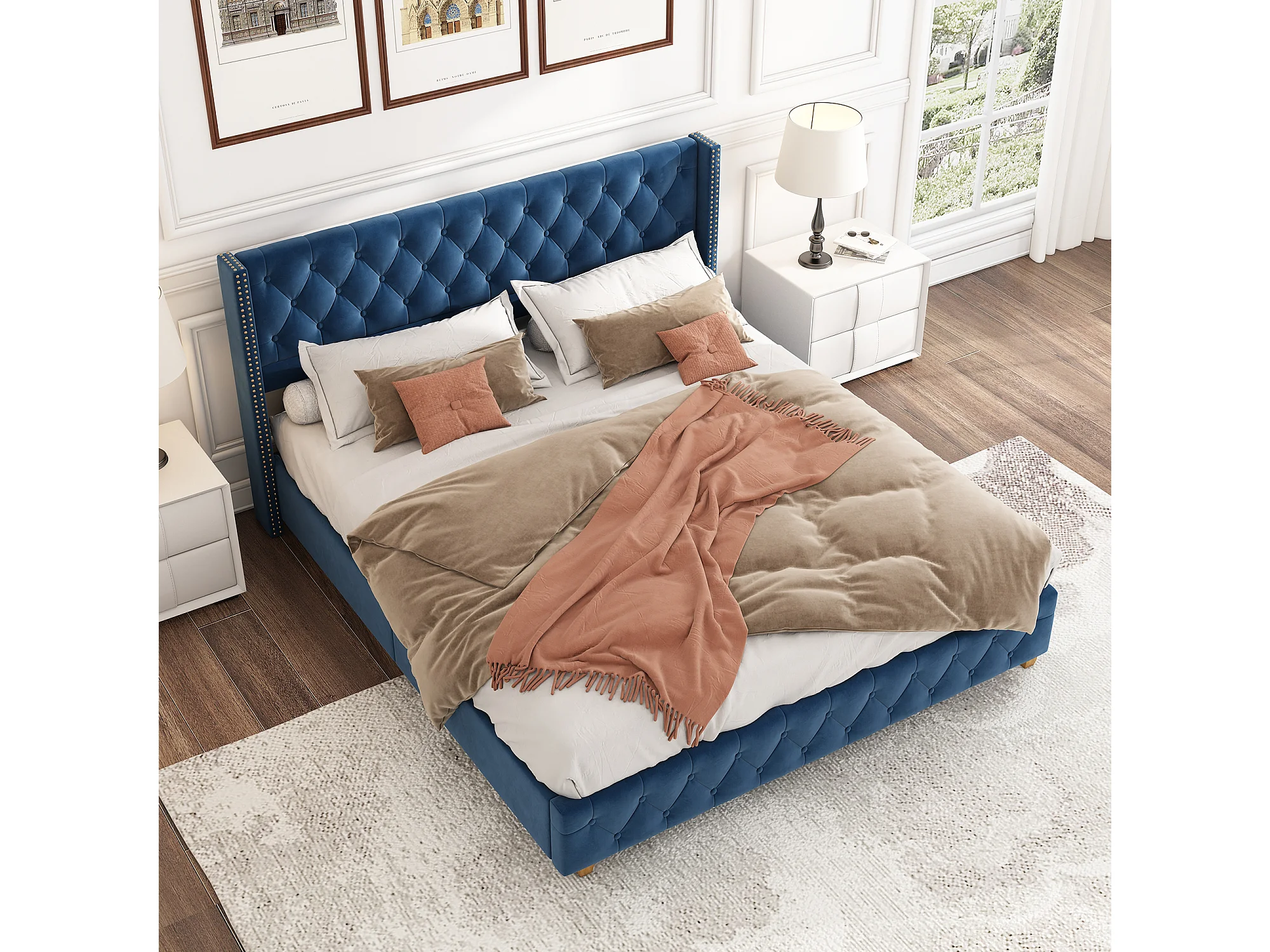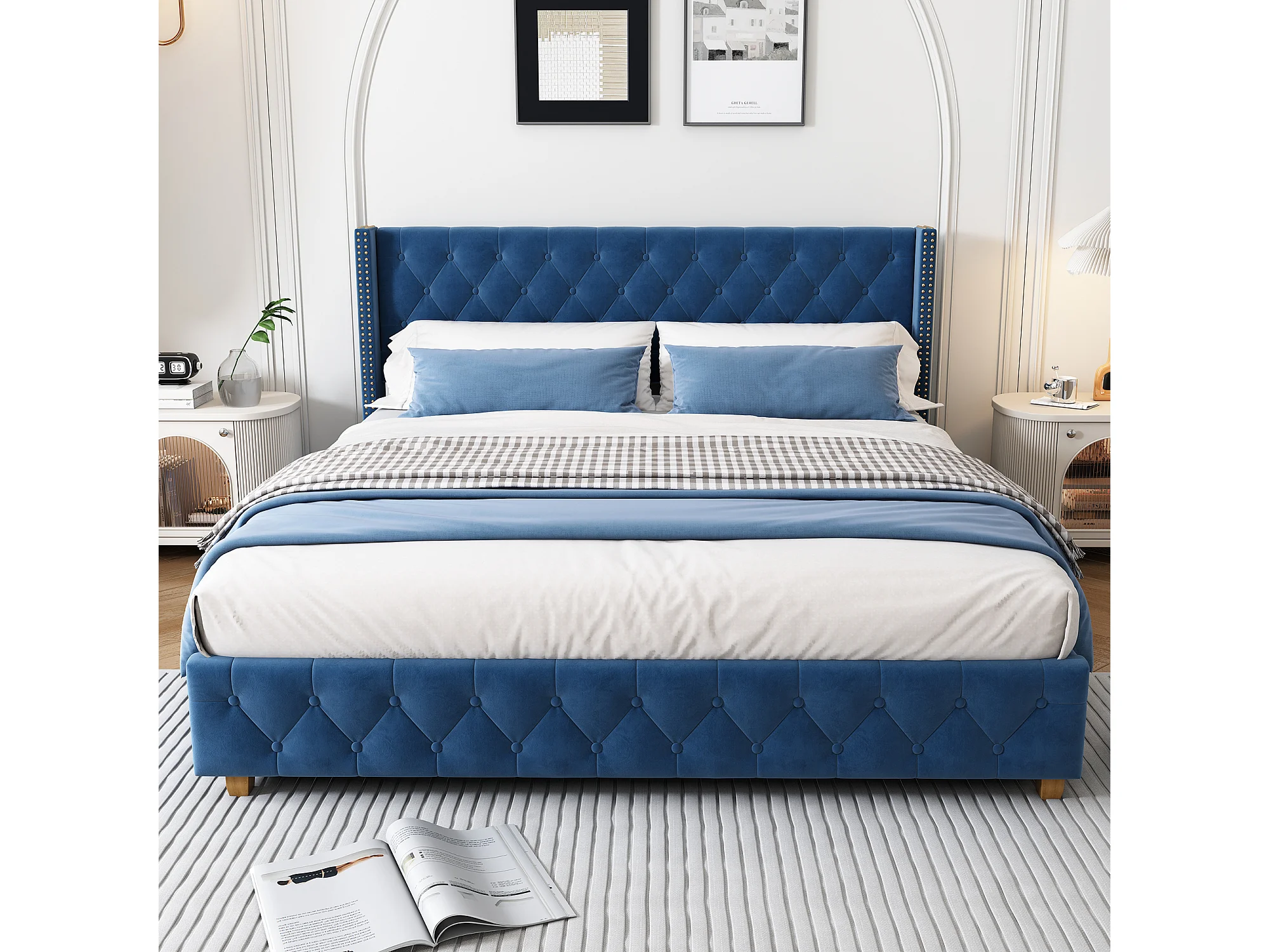 Lit rembourré 160×200 cm avec sommier et tête de lit, capitonnage, clous, pieds en bois, velours, bleu