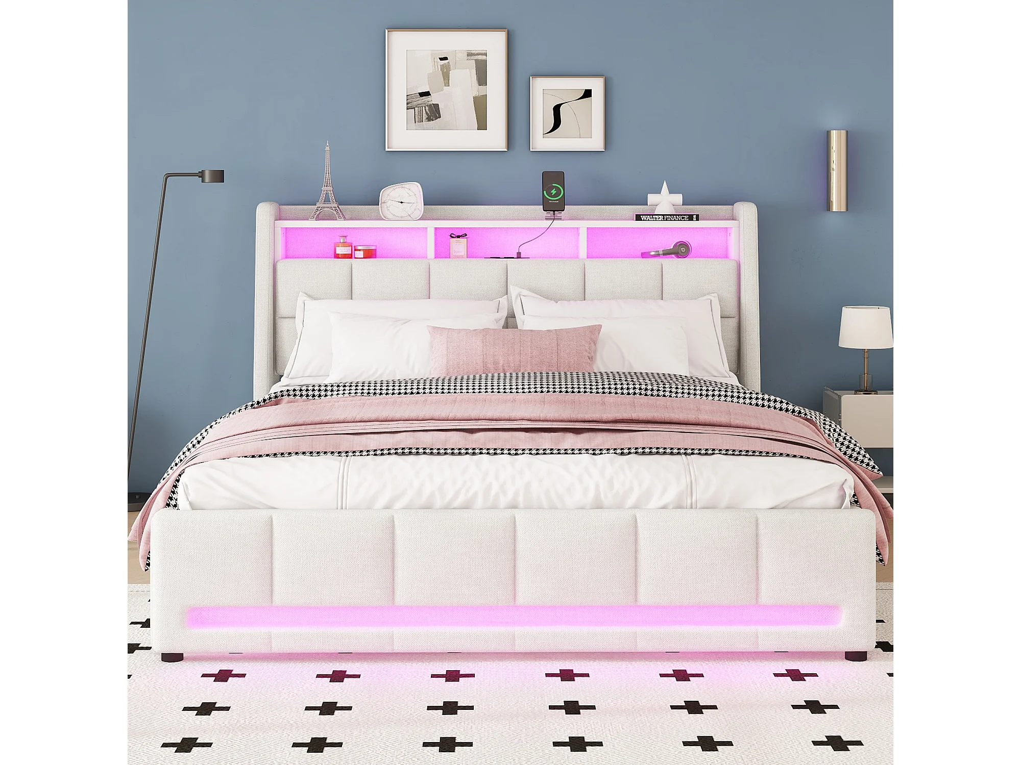Lit rembourré 160x200 cm beige, en lin, avec LED contrôlées par application, tiroirs, prises USB et rangement intégré