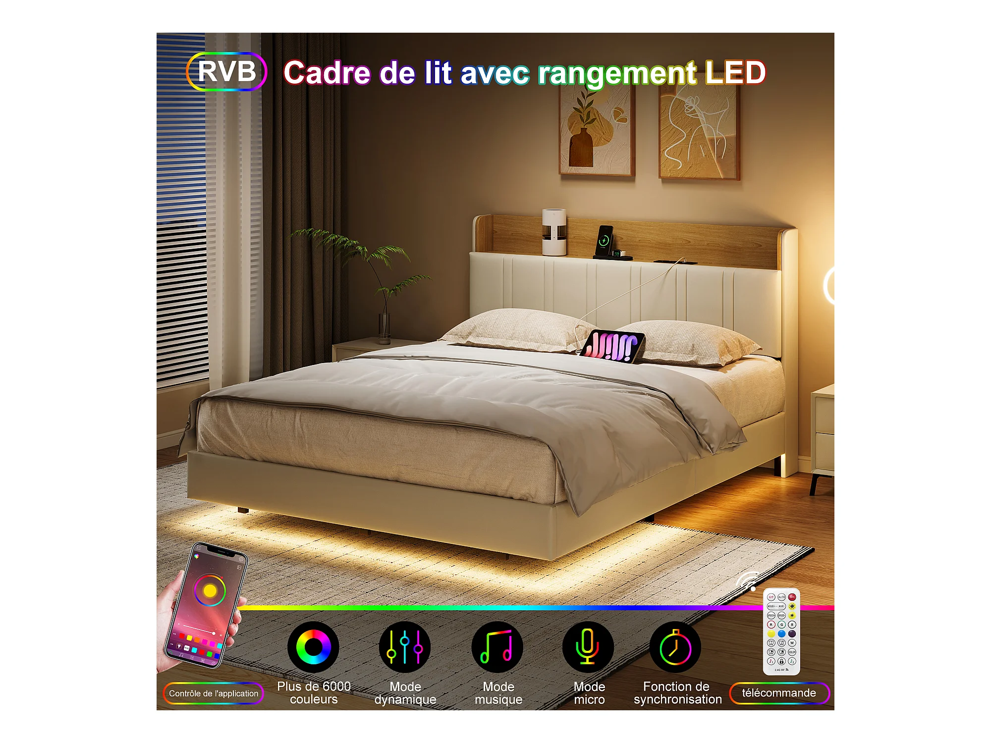 Lit rembourré 160x200 cm en PU blanc et bois clair avec LED sous-lit, rangement tête de lit, ports USB doubles et poches latérales (matelas non inclus)