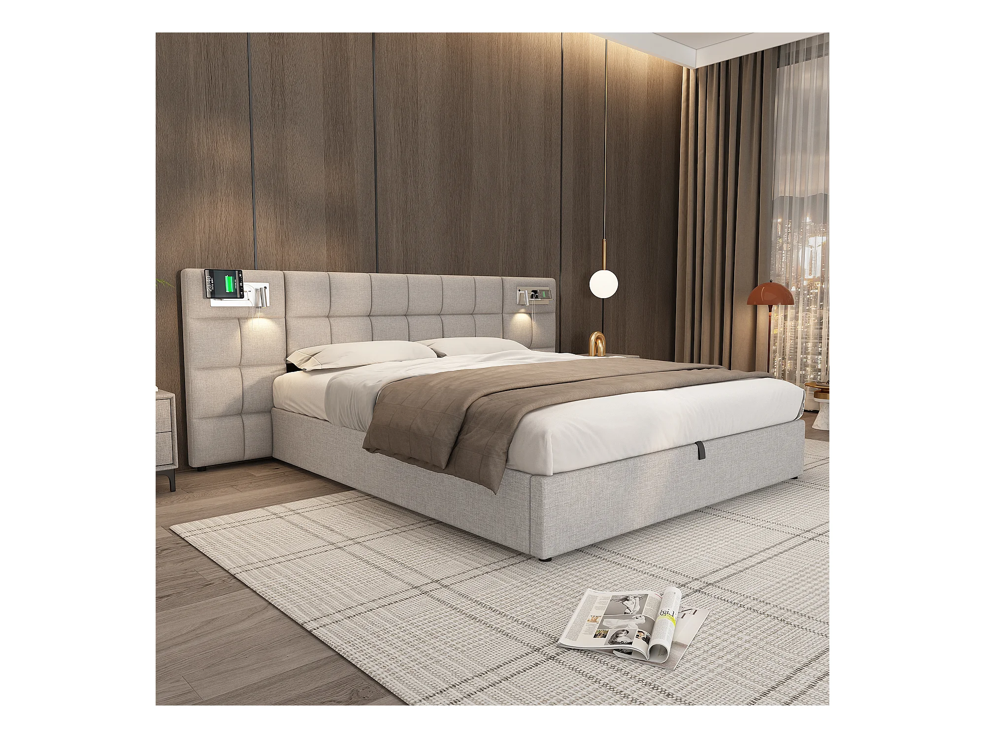 Lit rembourré 180 x 200 cm avec rangement hydraulique, port USB et charge sans fil, éclairage intégré