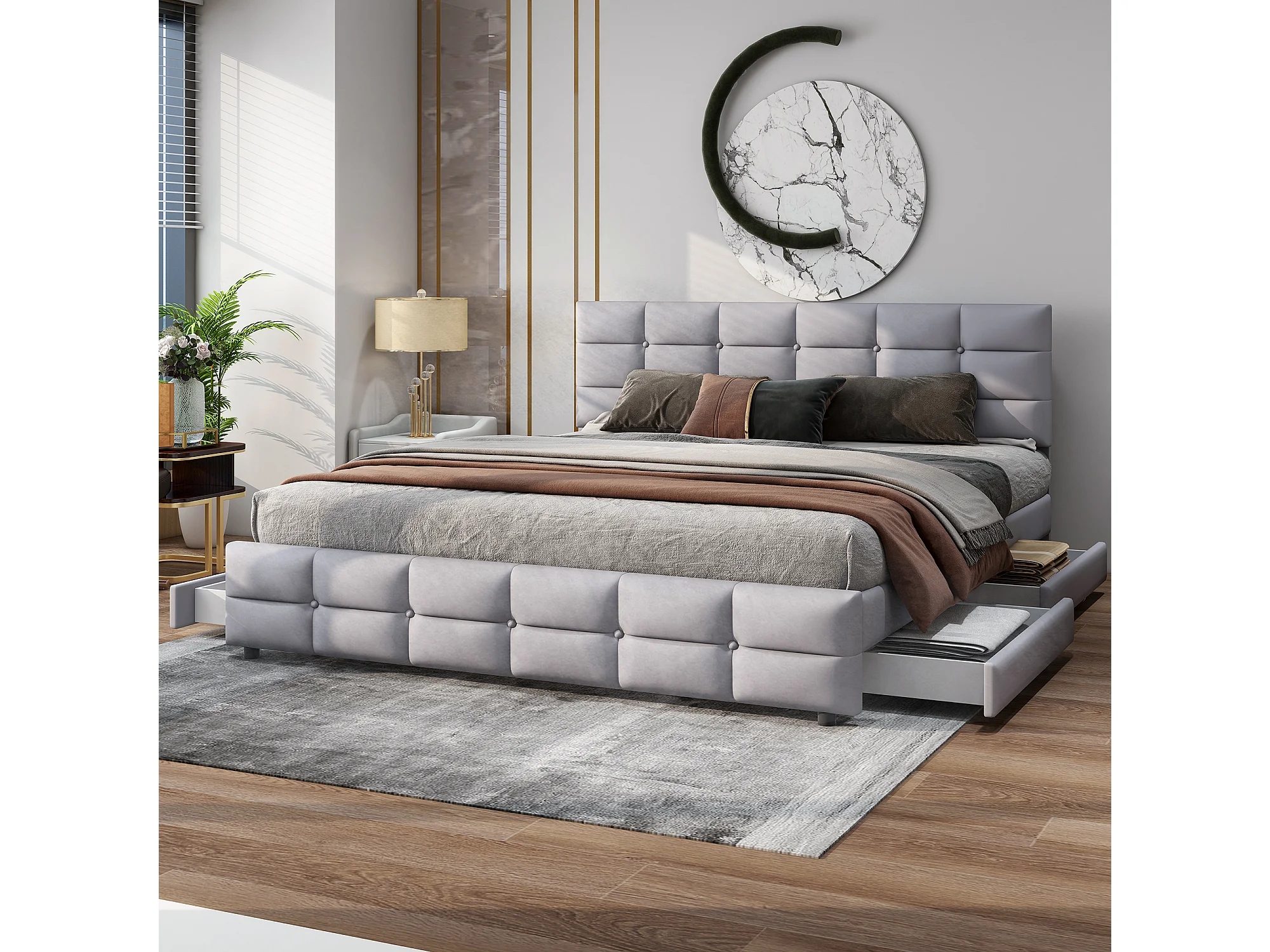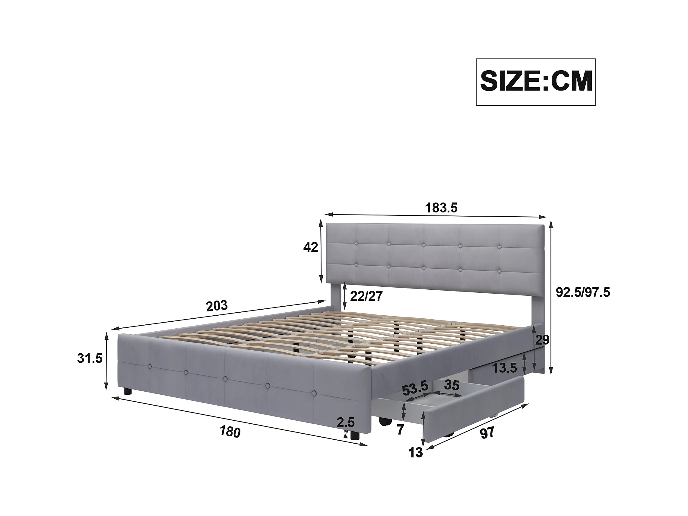 Lit rembourré 180x200 cm avec 4 tiroirs, sommier inclus, velours gris, adulte et adolescent