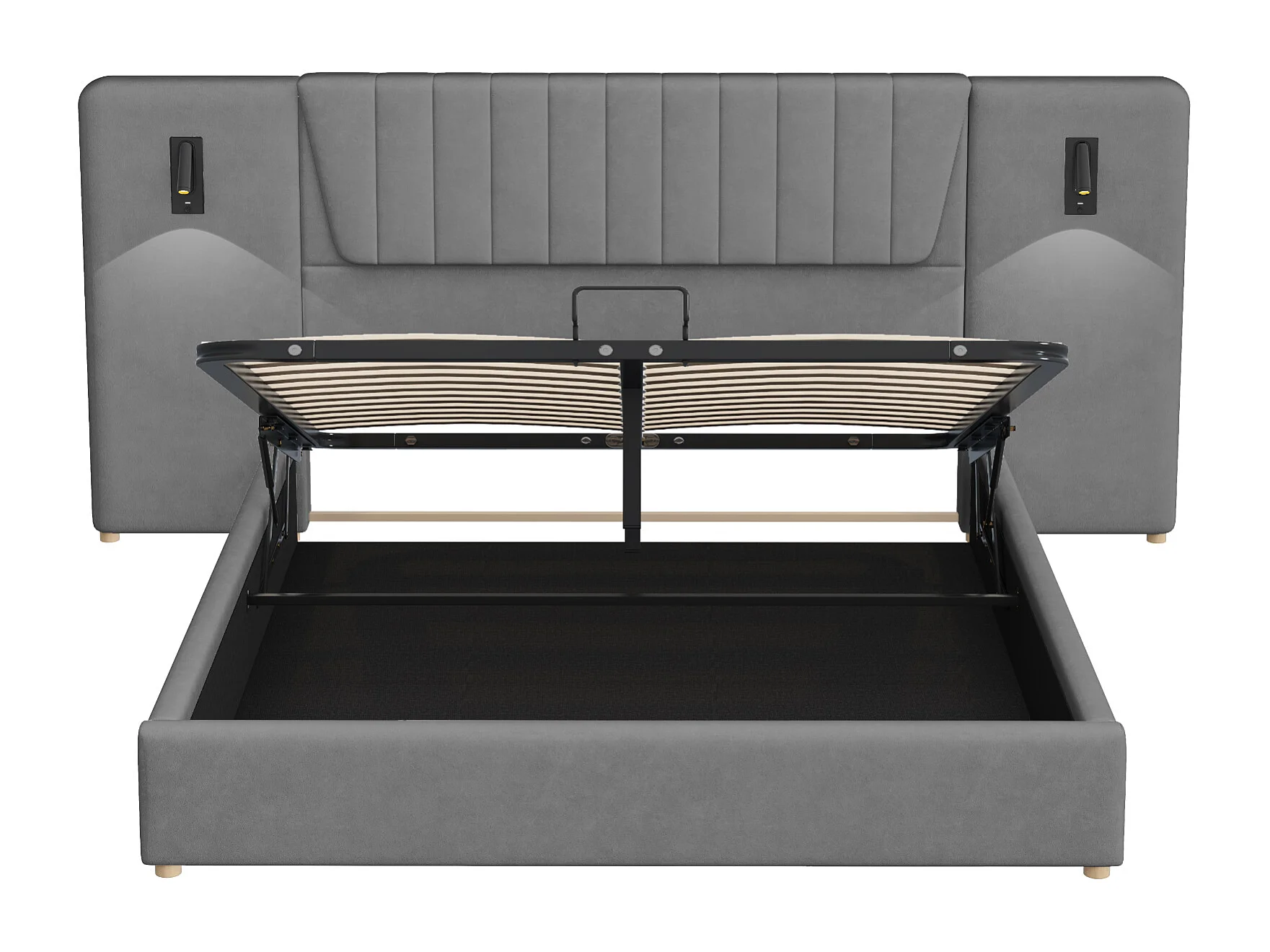 Lit rembourré 180×200 cm, avec dossier extra long, lampes de lecture pivotantes et port USB