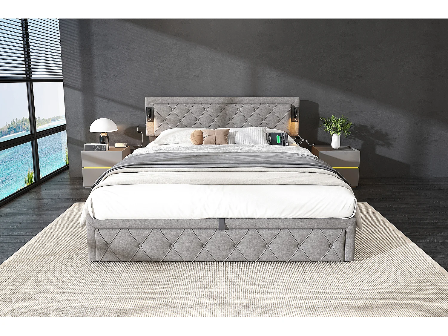 Lit rembourré 180×200 cm, avec éclairage Downlight & port USB, tête de lit en lin gris, rangement hydraulique