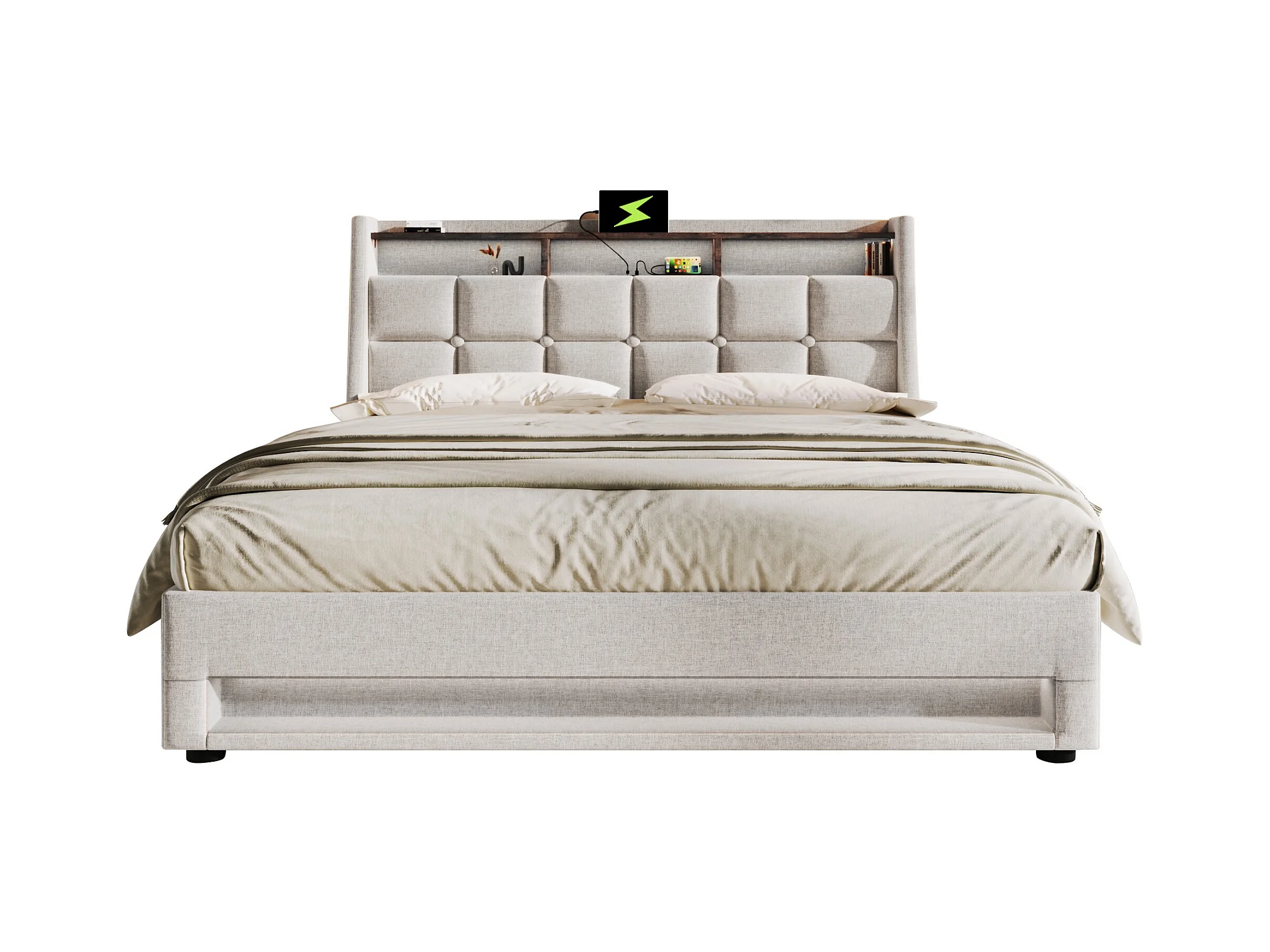 Lit rembourré 180x200 cm en lin beige avec éclairage LED et USB, tête de lit confortable