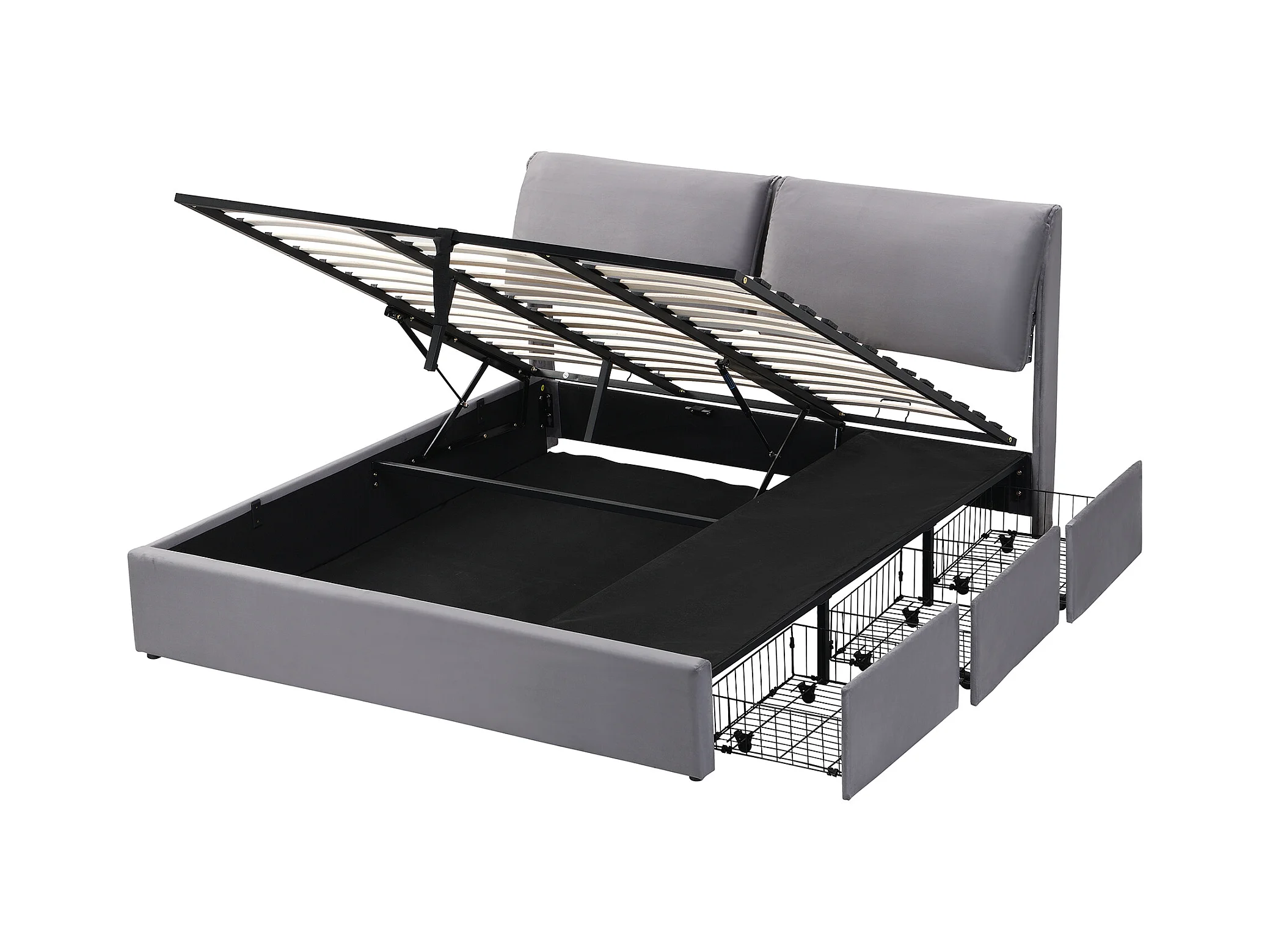 Lit rembourré 180×200 cm, gris, avec tête de lit réglable, trois tiroirs et coffre de rangement