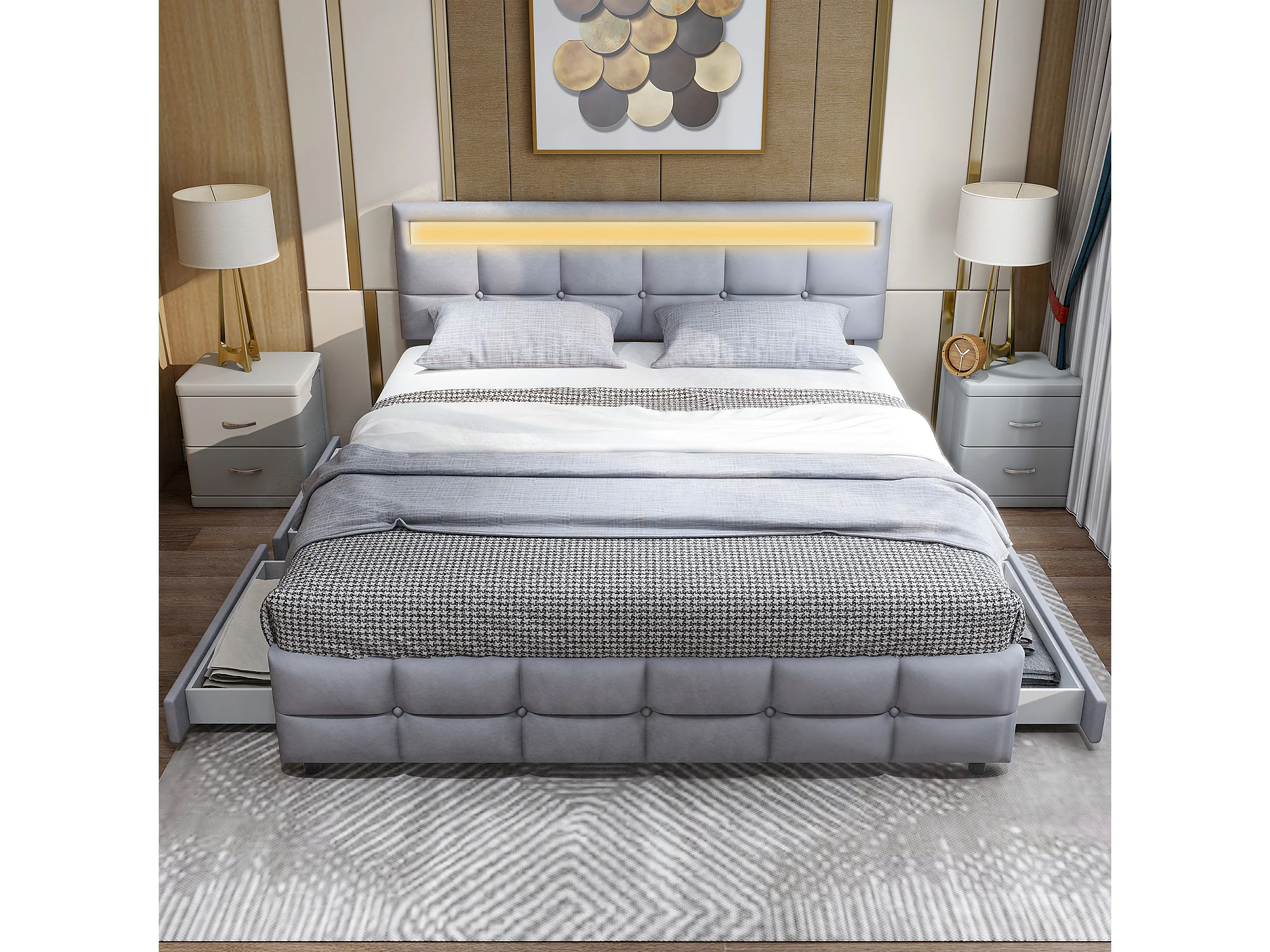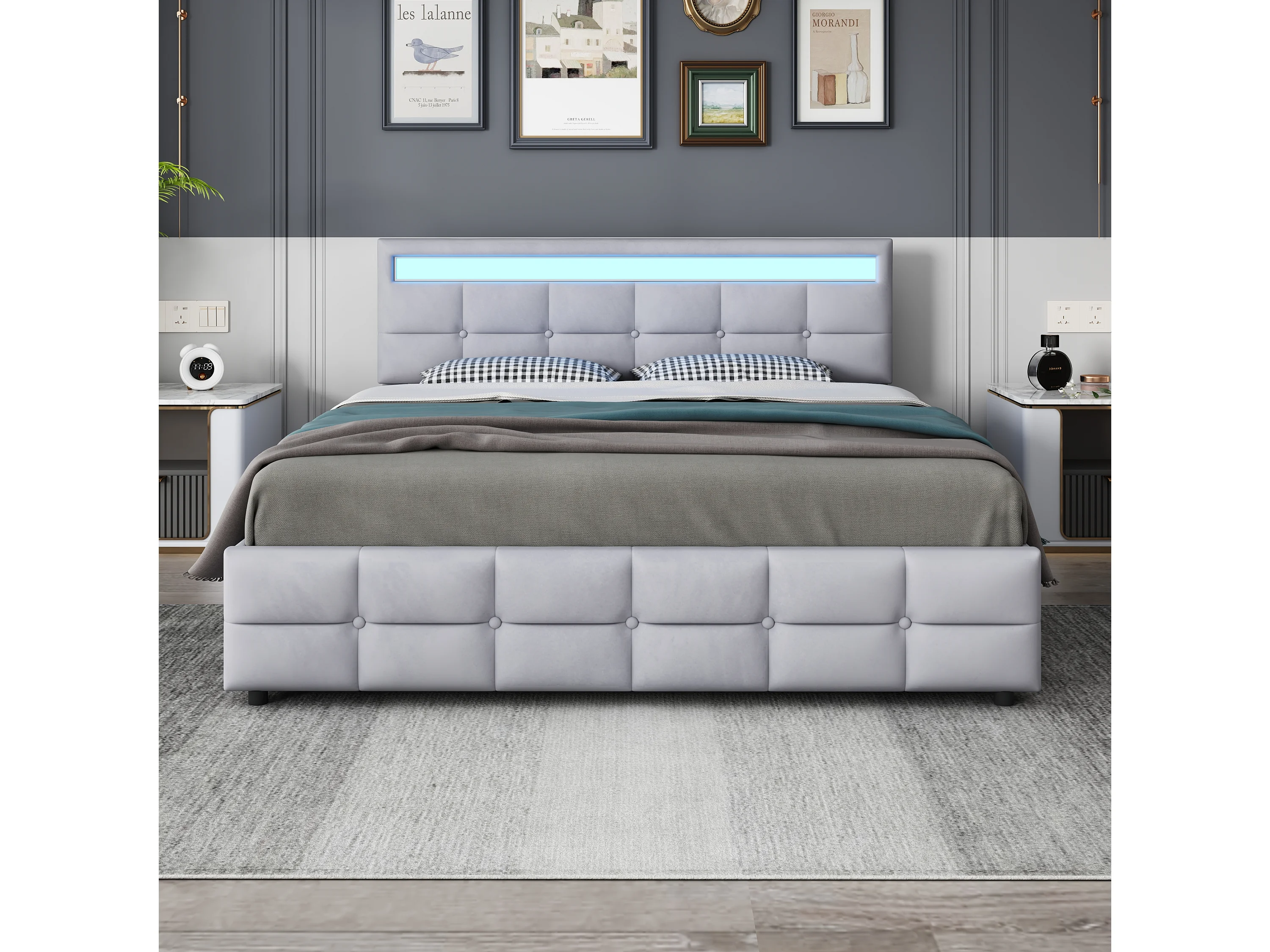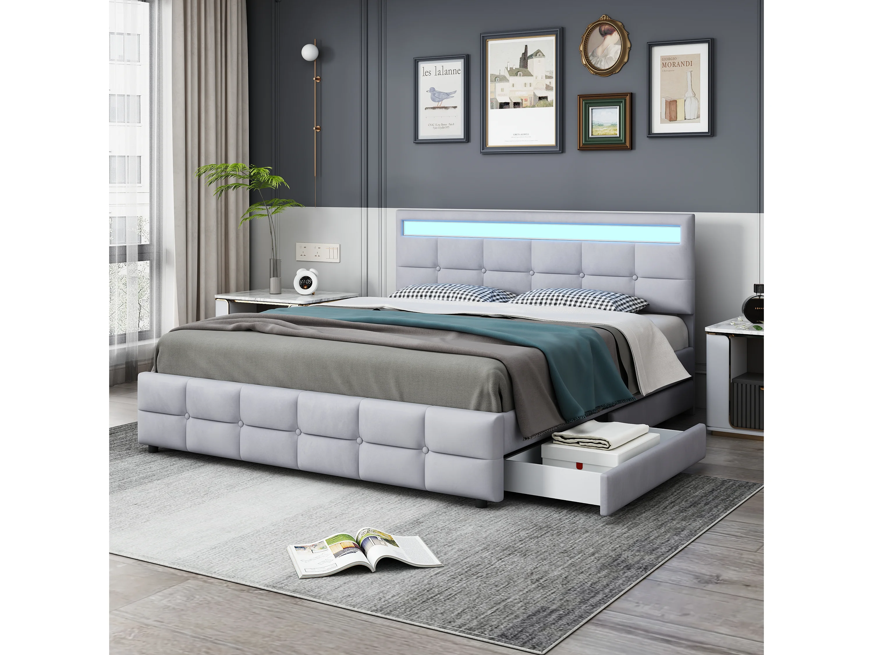 Lit rembourré 180x200 cm LED avec 4 tiroirs, sommier inclus, velours gris, rangement fonctionnel