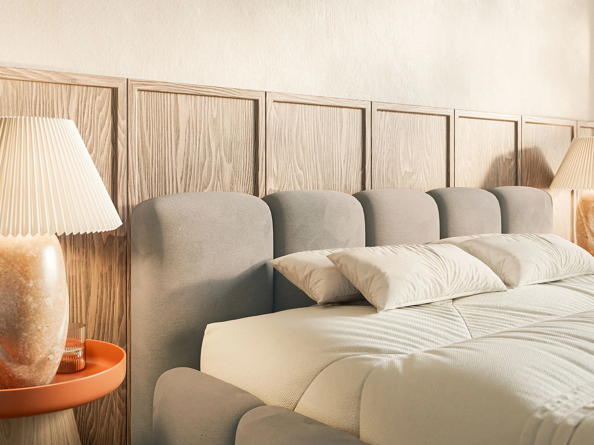 Lit rembourré – 200x200 cm – gris-beige – avec coffre de rangement – velours hydrophobe - CLOUDY LOW
