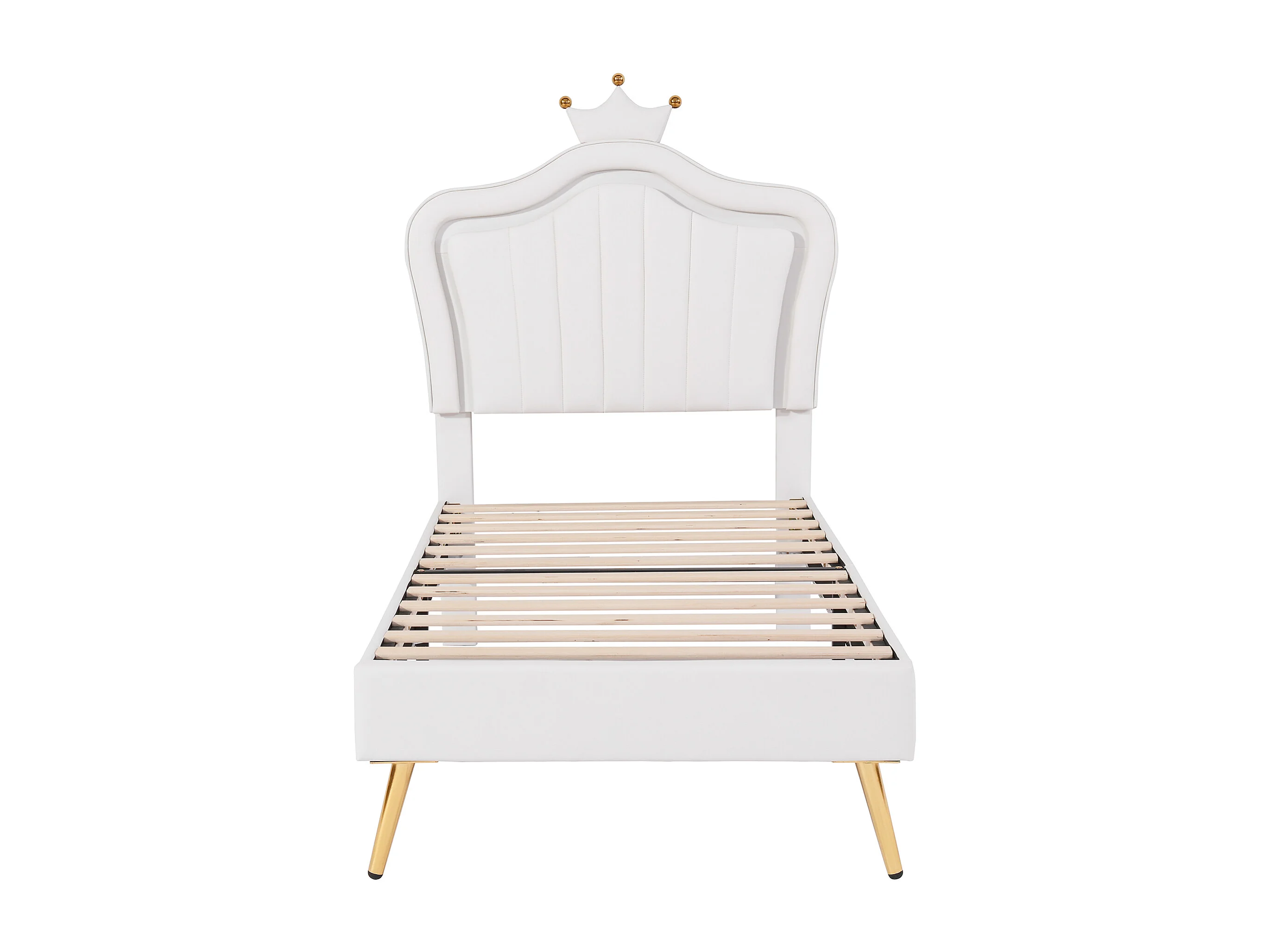 Lit rembourré 90x200 cm, lit fille couronne blanche, PU cuir, LED, tiroirs et sommier inclus