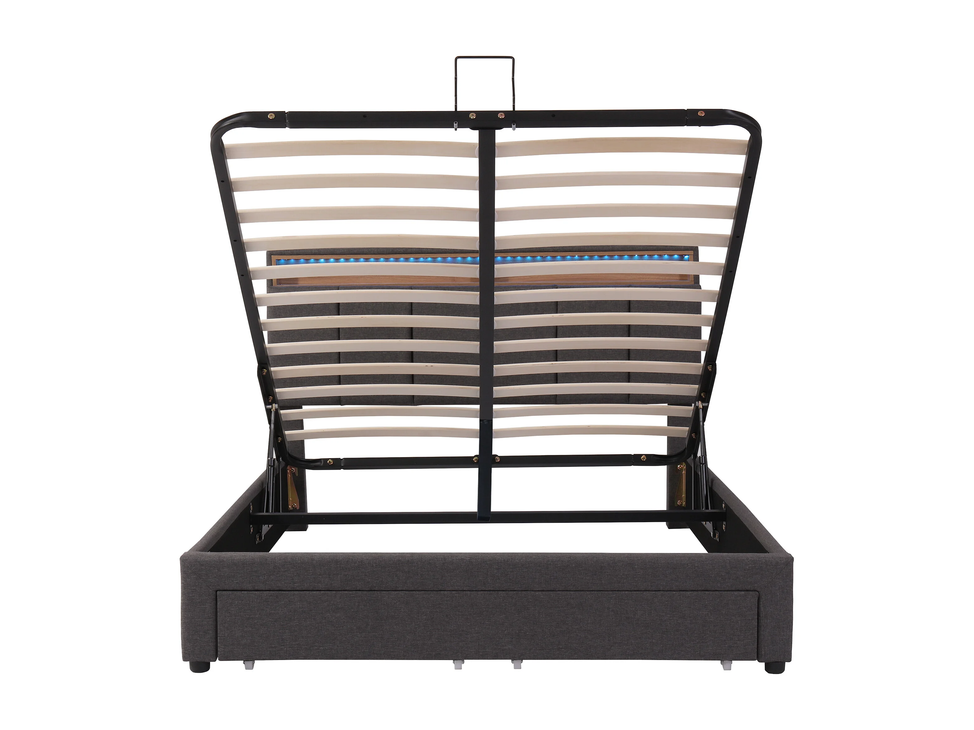 Lit rembourré avec éclairage LED, lit de rangement hydraulique 140×200 cm, gris, avec tête de lit en mousse