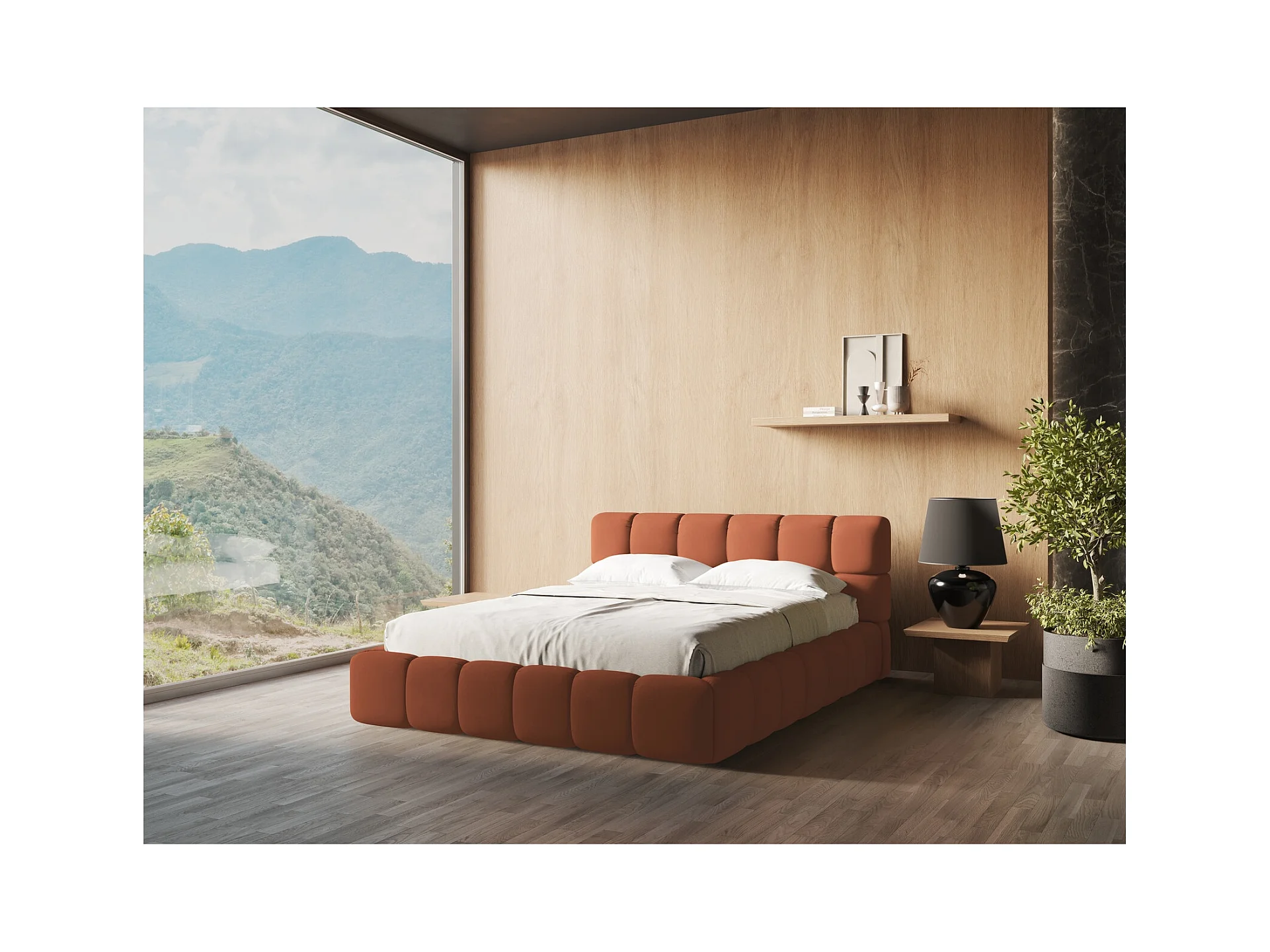 Lit rembourré avec rangement 180 x 228 - en Chenille - terre cuite - NALU