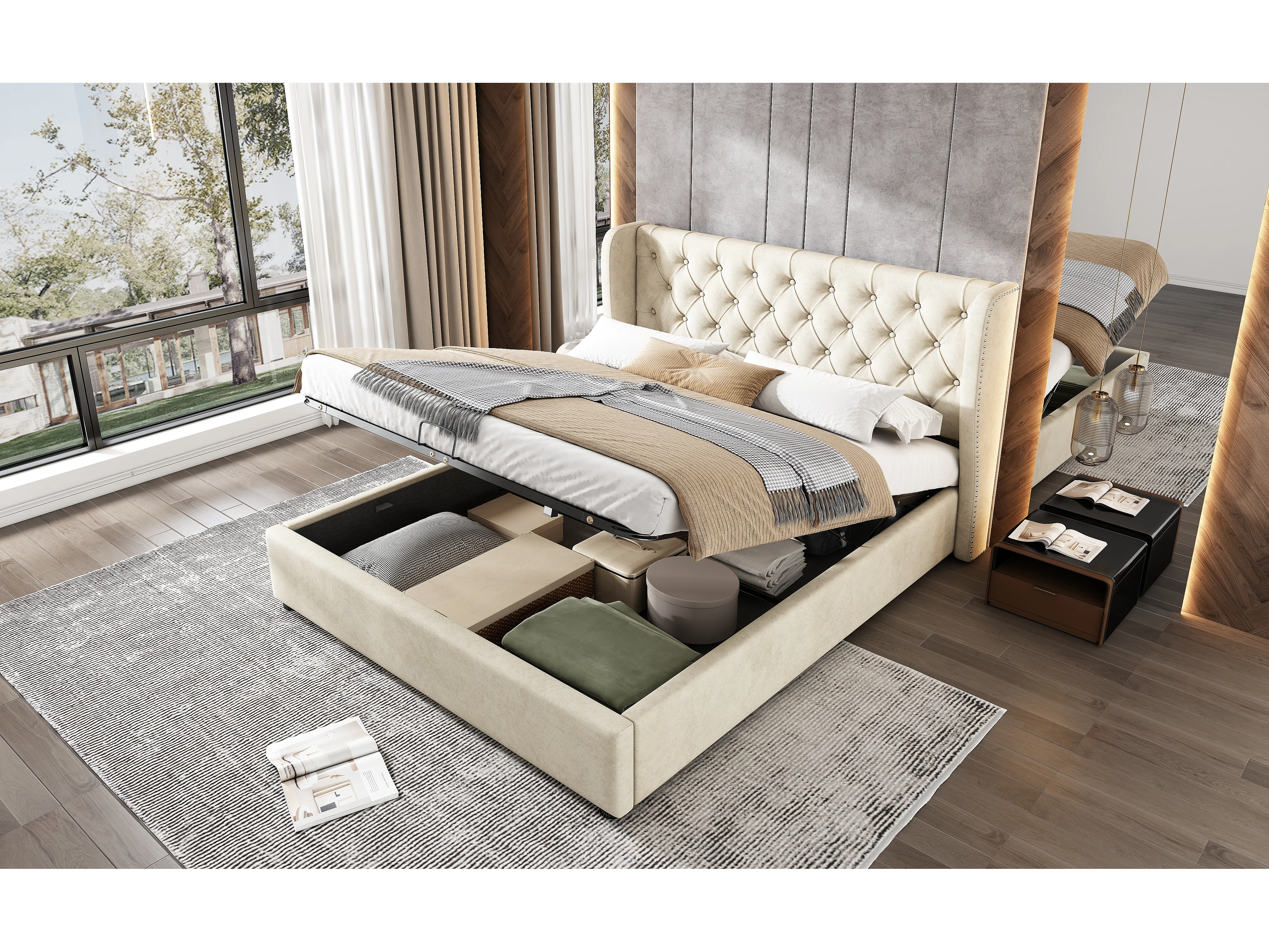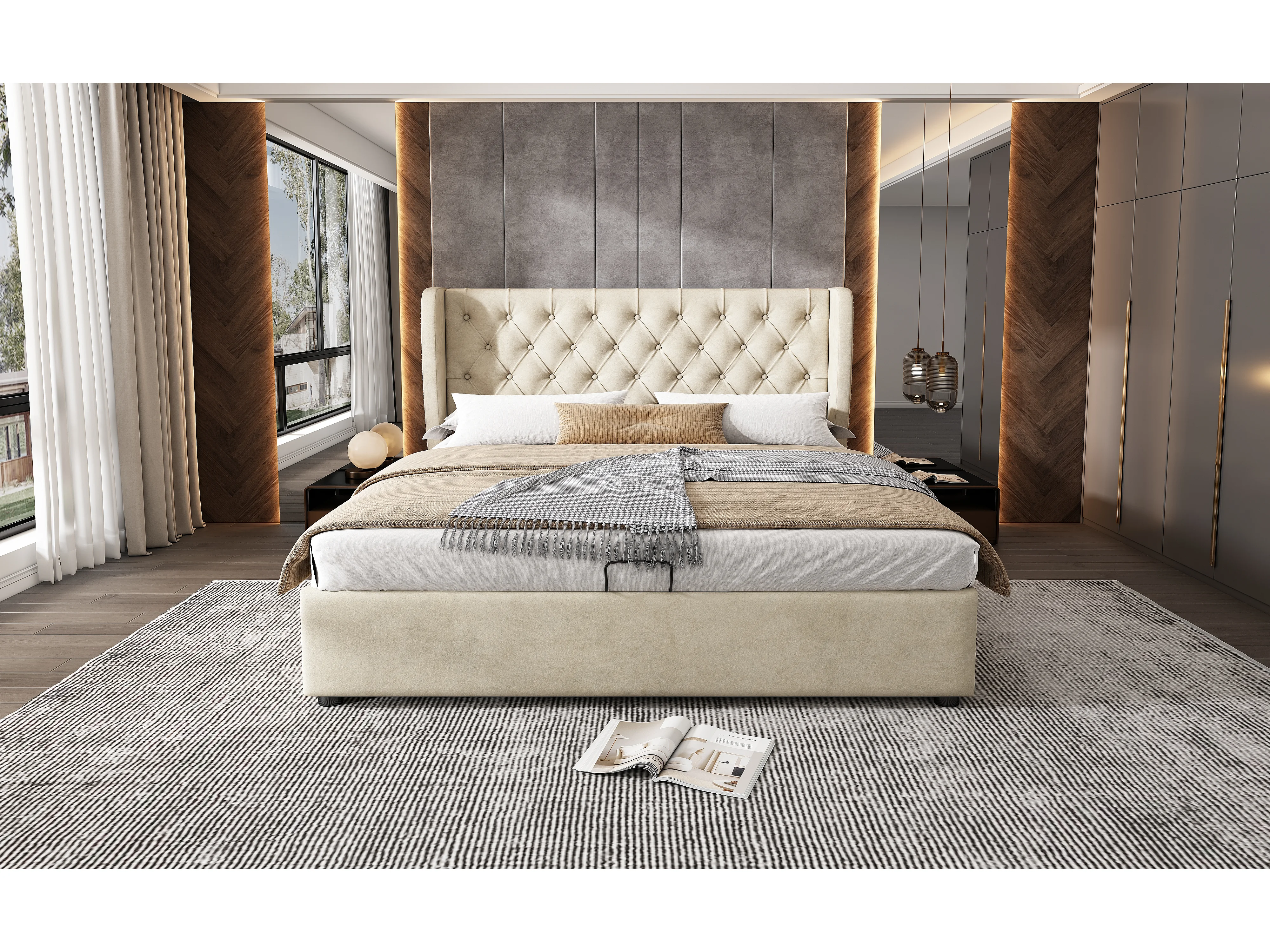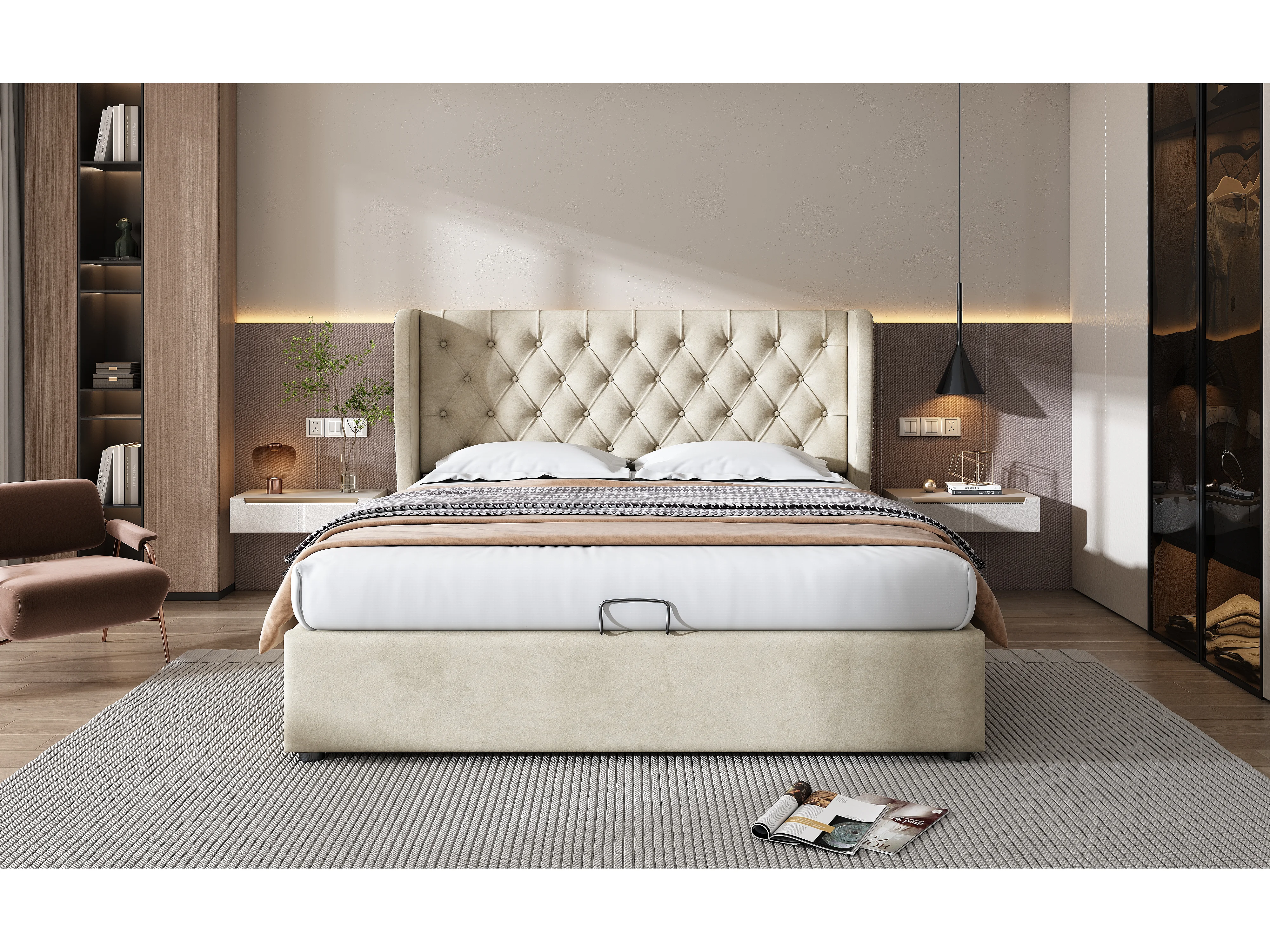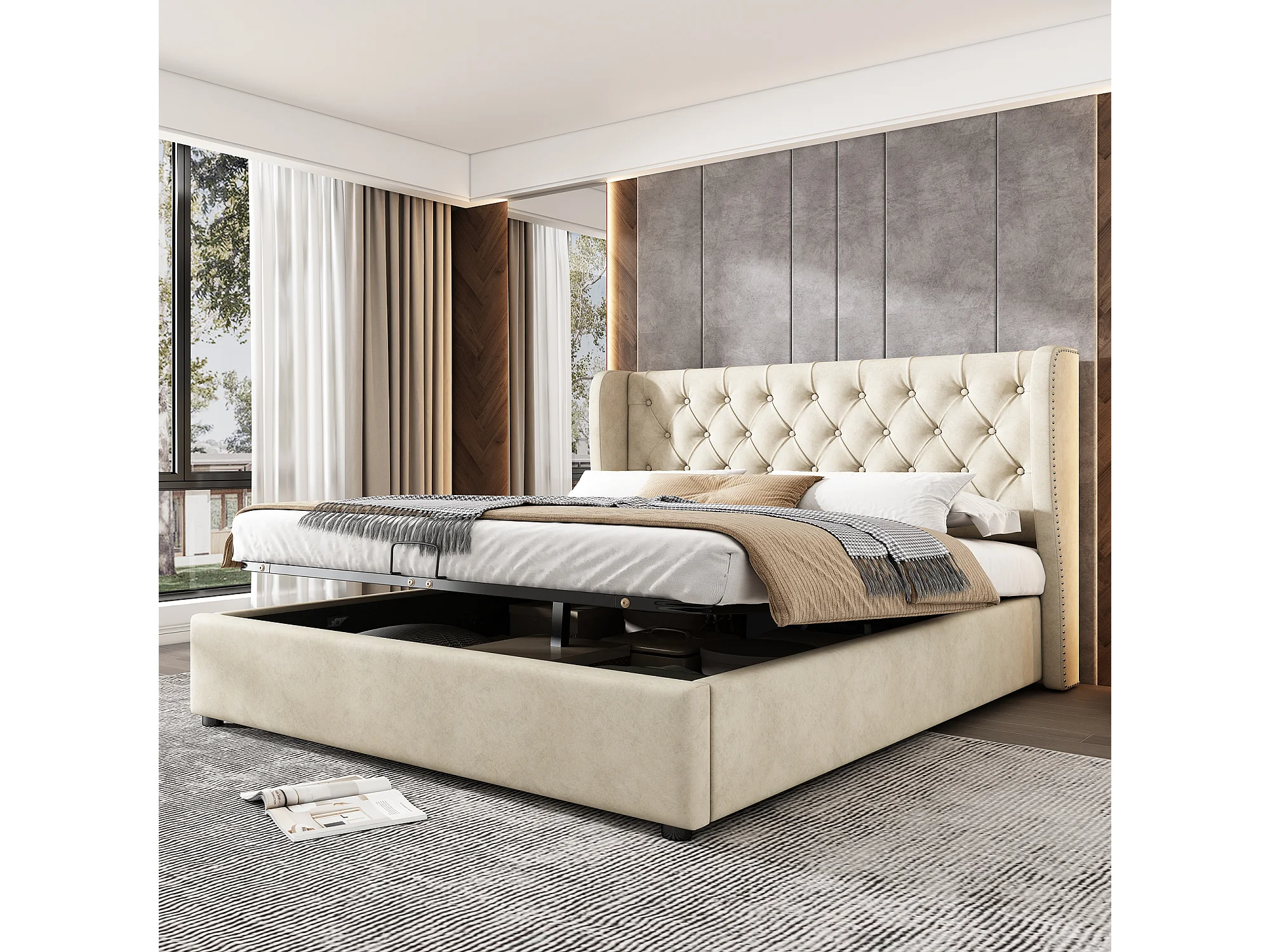 Lit rembourré beige 140x190 cm avec échelle, barrières de sécurité et rangement intégré, design confortable