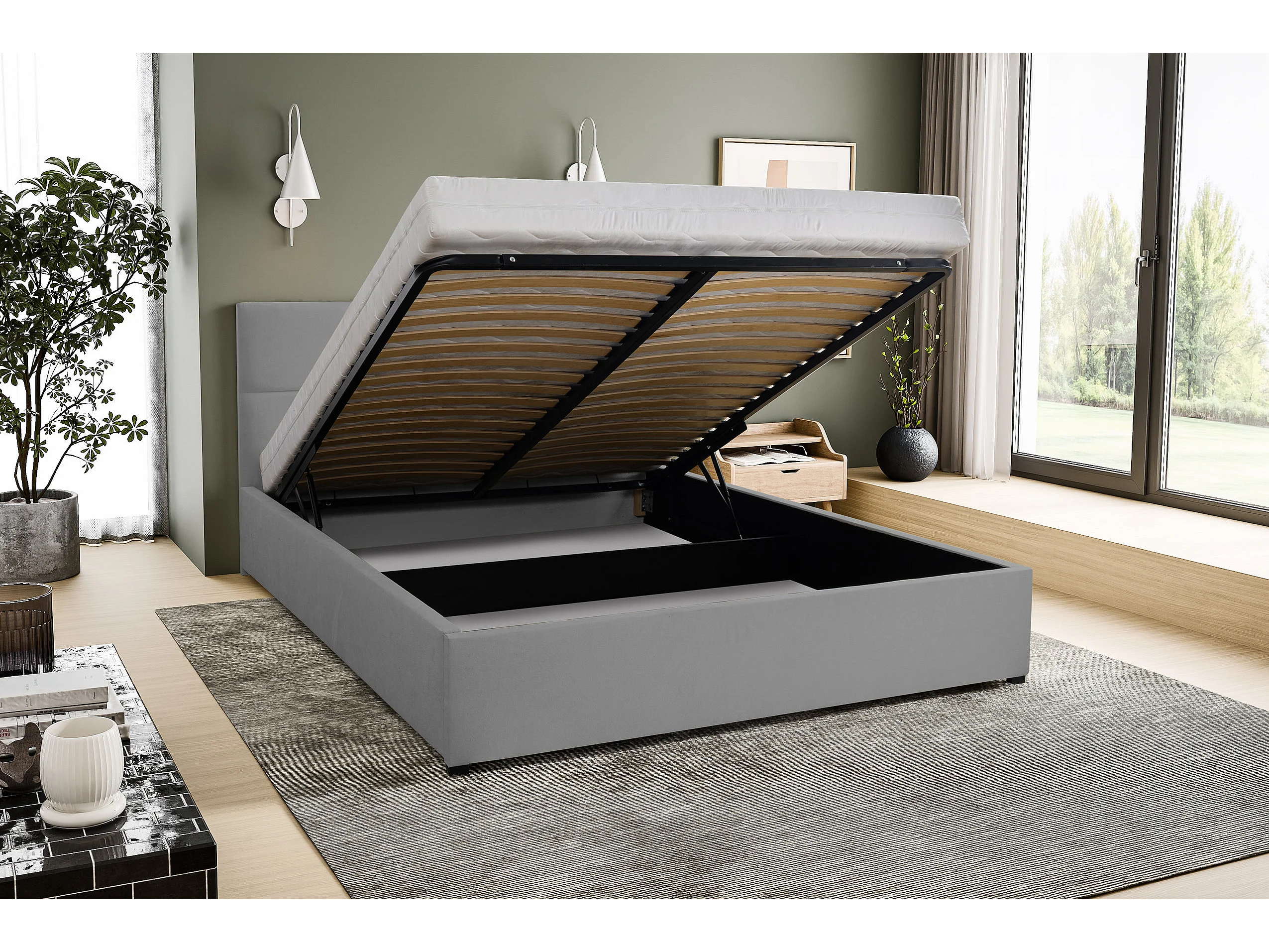 Lit rembourré BETTY avec tête de lit, 160 x 200 cm, lit double avec coffre de rangement et sommier à lattes en velours, velours, couleur : gris