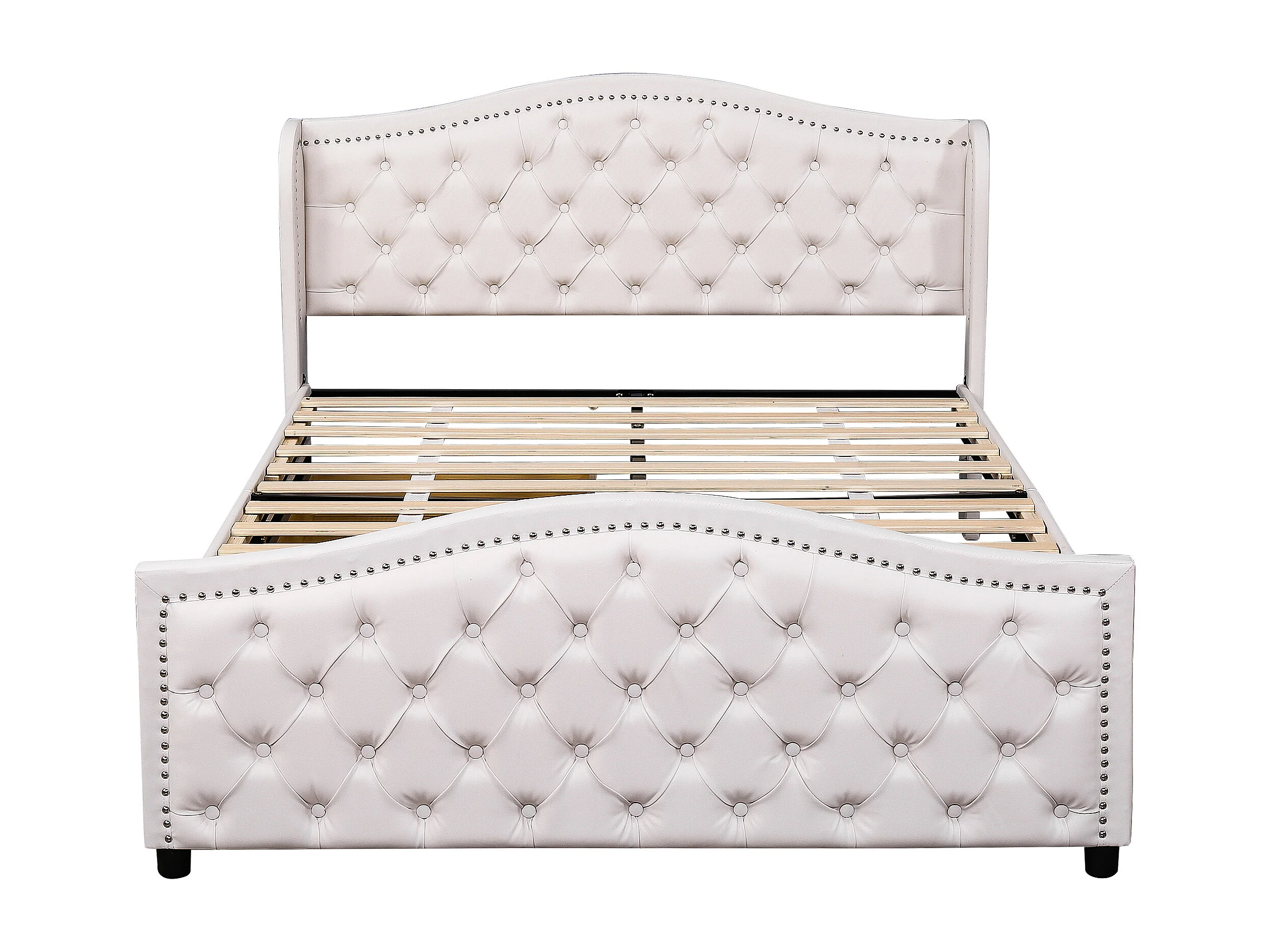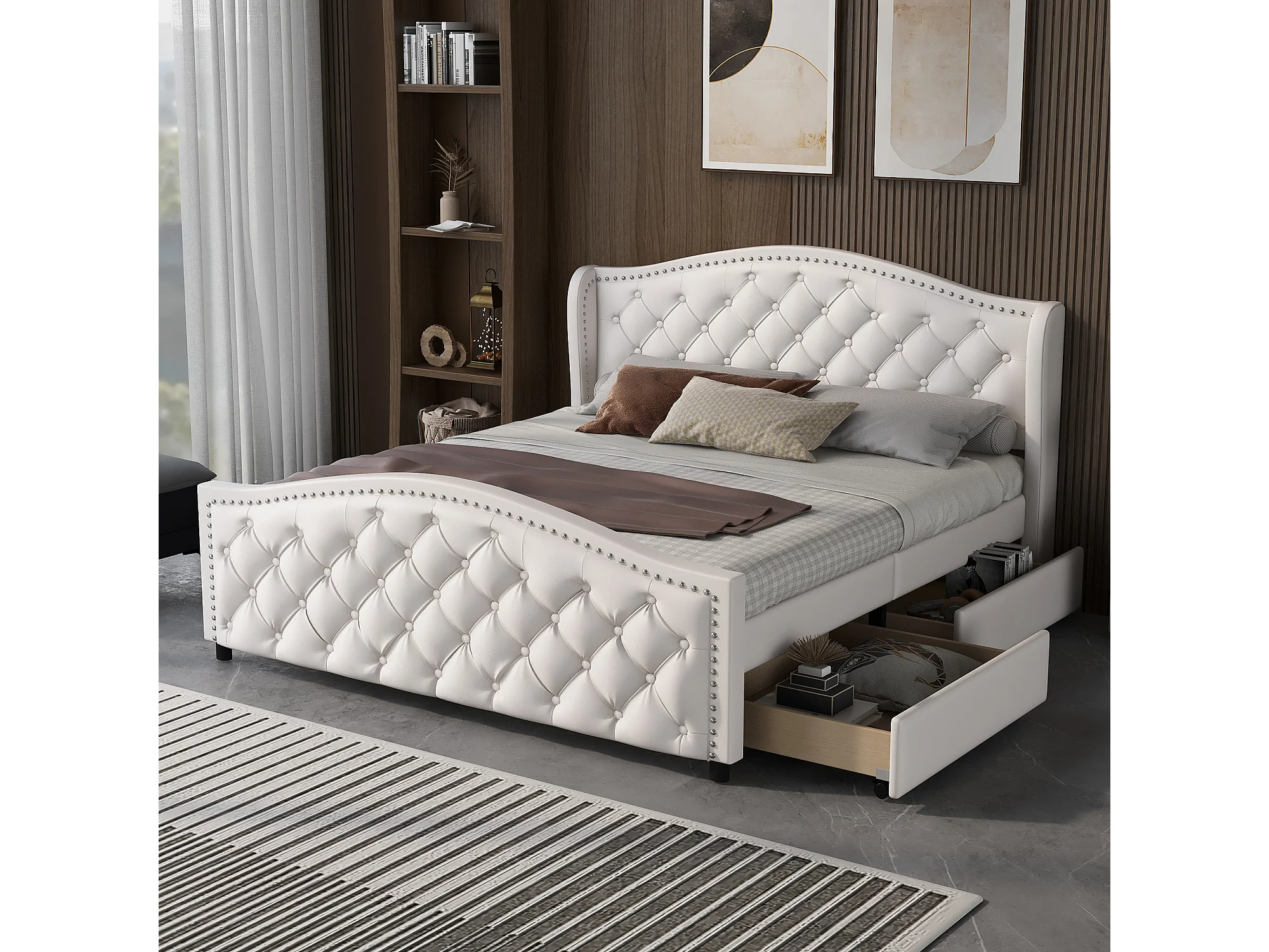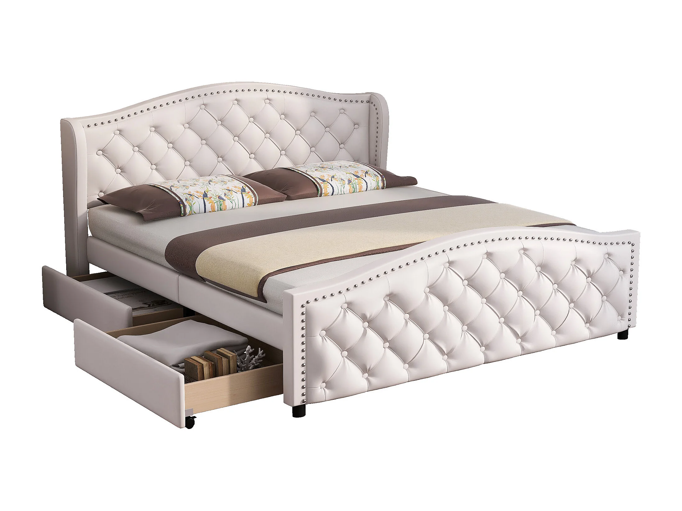 Lit rembourré blanc 140x200 cm avec sommier, 2 tiroirs et tête de lit style Chesterfield, design élégant