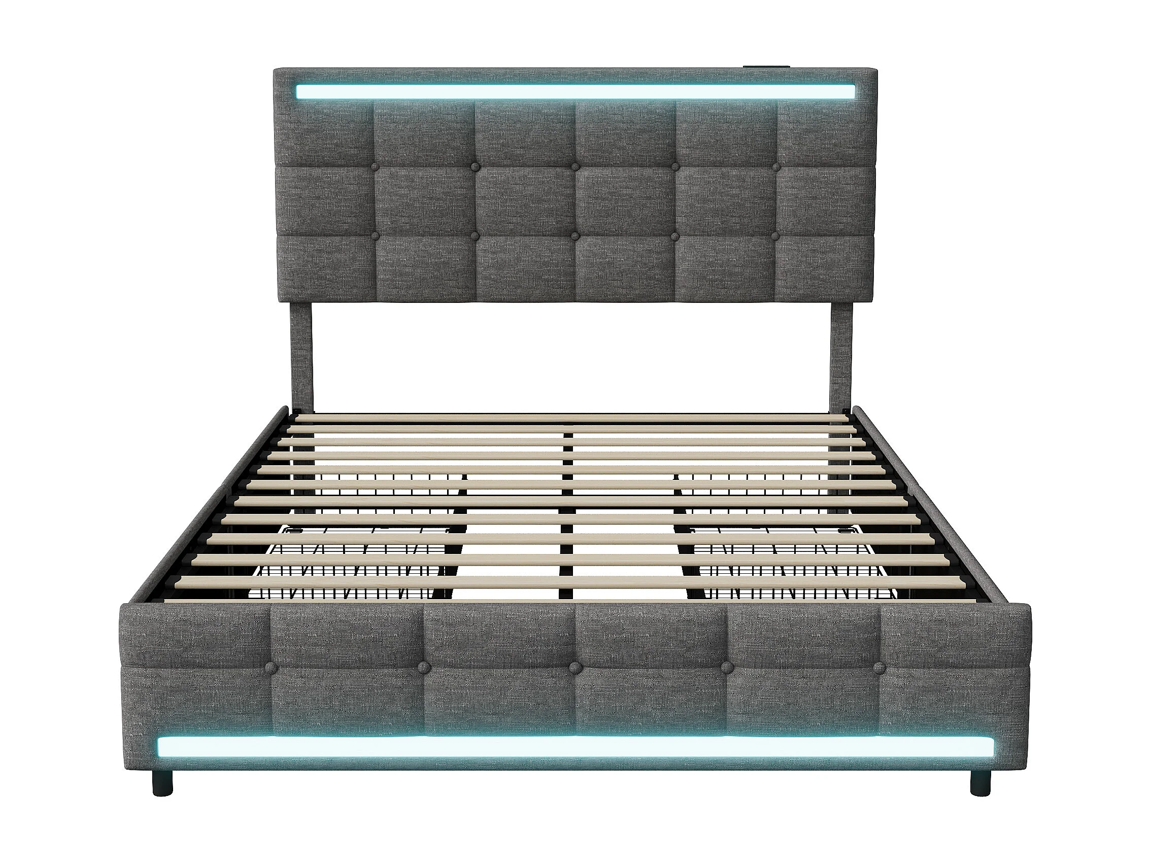 Lit rembourré, cadre de lit, double lit, 140 x 200 cm, avec 4 tiroirs, avec USB, lin, gris, sans matelas