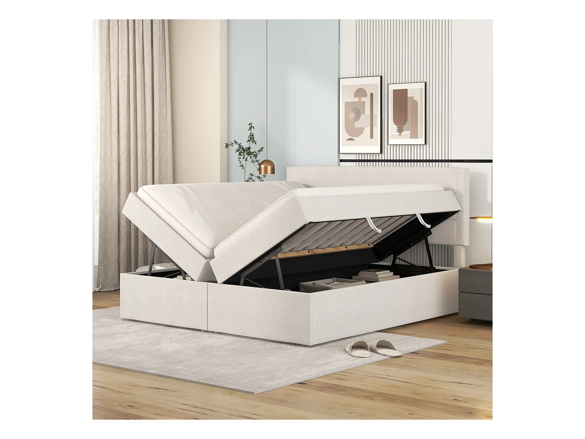 Lit Rembourré Double 200 X 140 cm Avec Sommier À Lattes En Métal - Grand Espace De Rangement - Ouvrant Des Deux Côtés - Beige