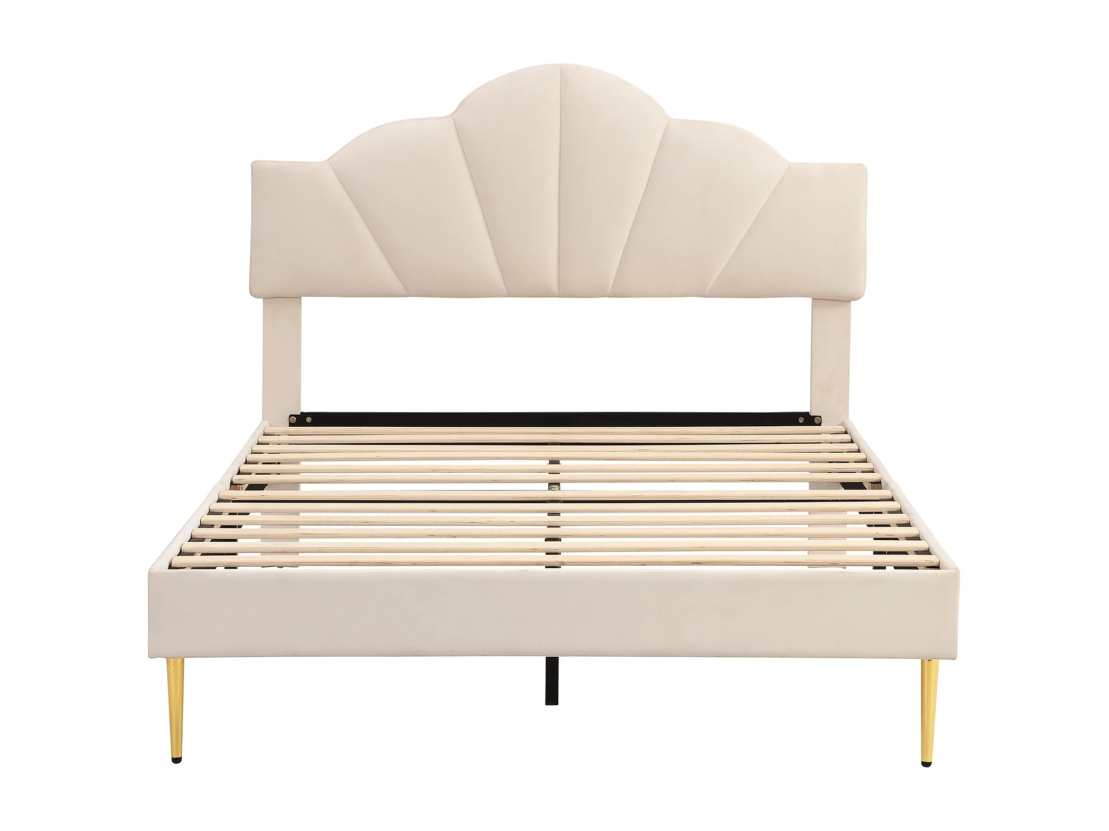Lit rembourré en velours beige 140×190 cm avec tête de lit réglable et pieds en fer doré