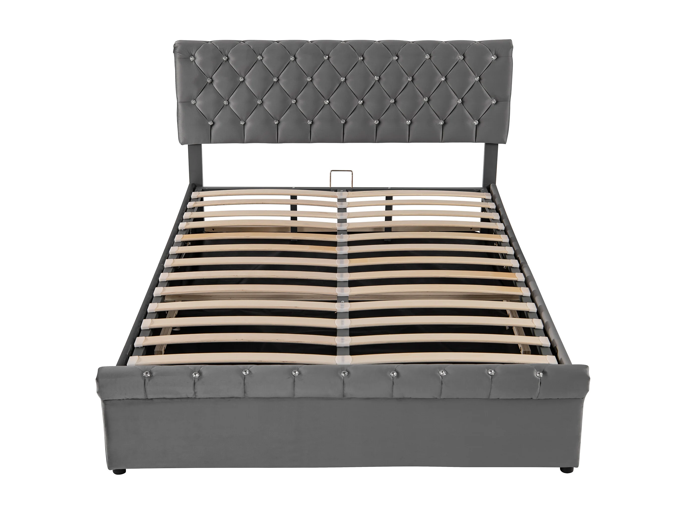 Lit rembourré gris 140x200 cm avec tête de lit réglable et rangement hydraulique, idéal pour chambre adulte