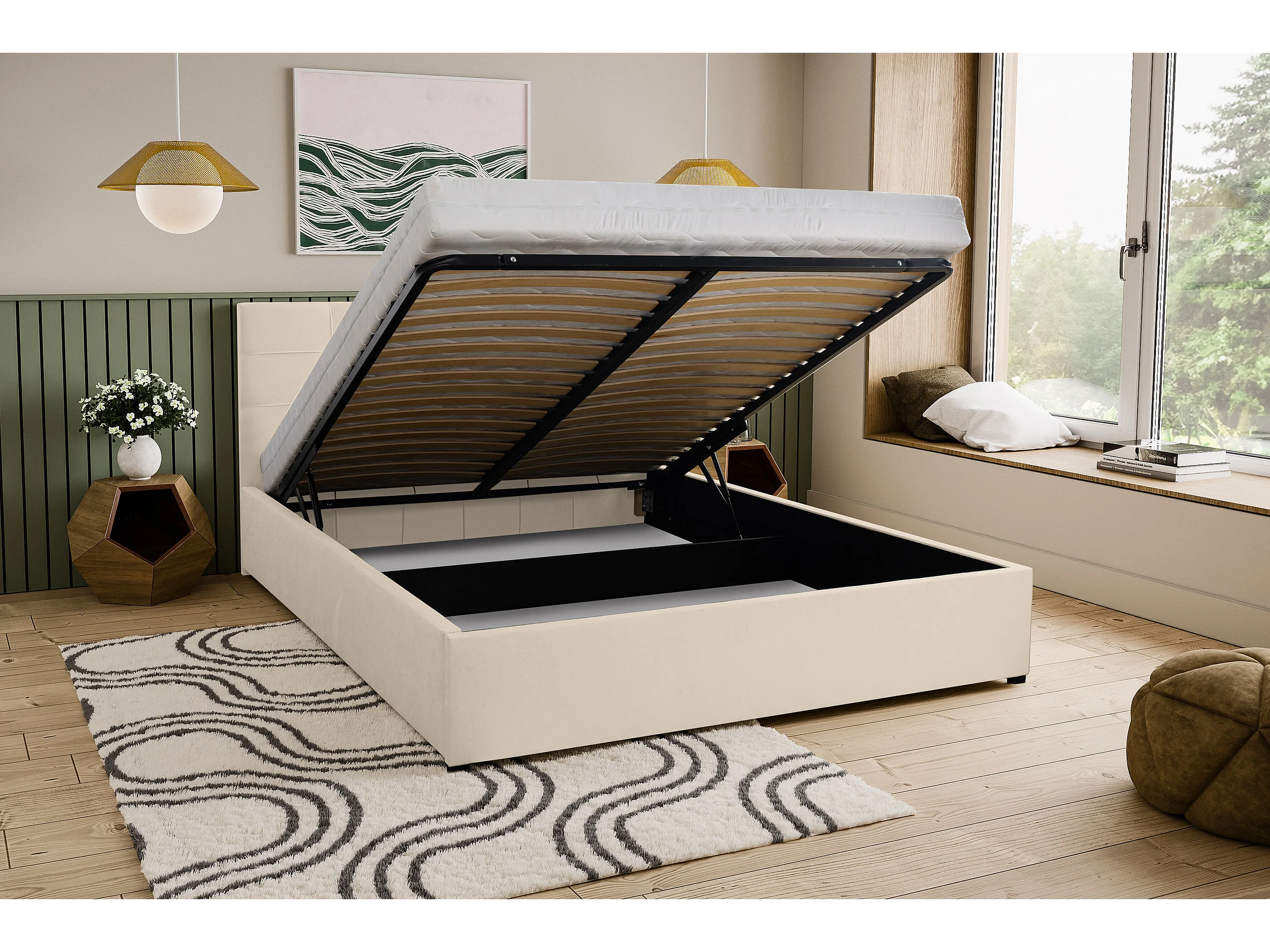 Lit rembourré JESSA avec tête de lit, 180 x 200 cm, lit double avec coffre de rangement et sommier à lattes en velours, velours, couleur : beige