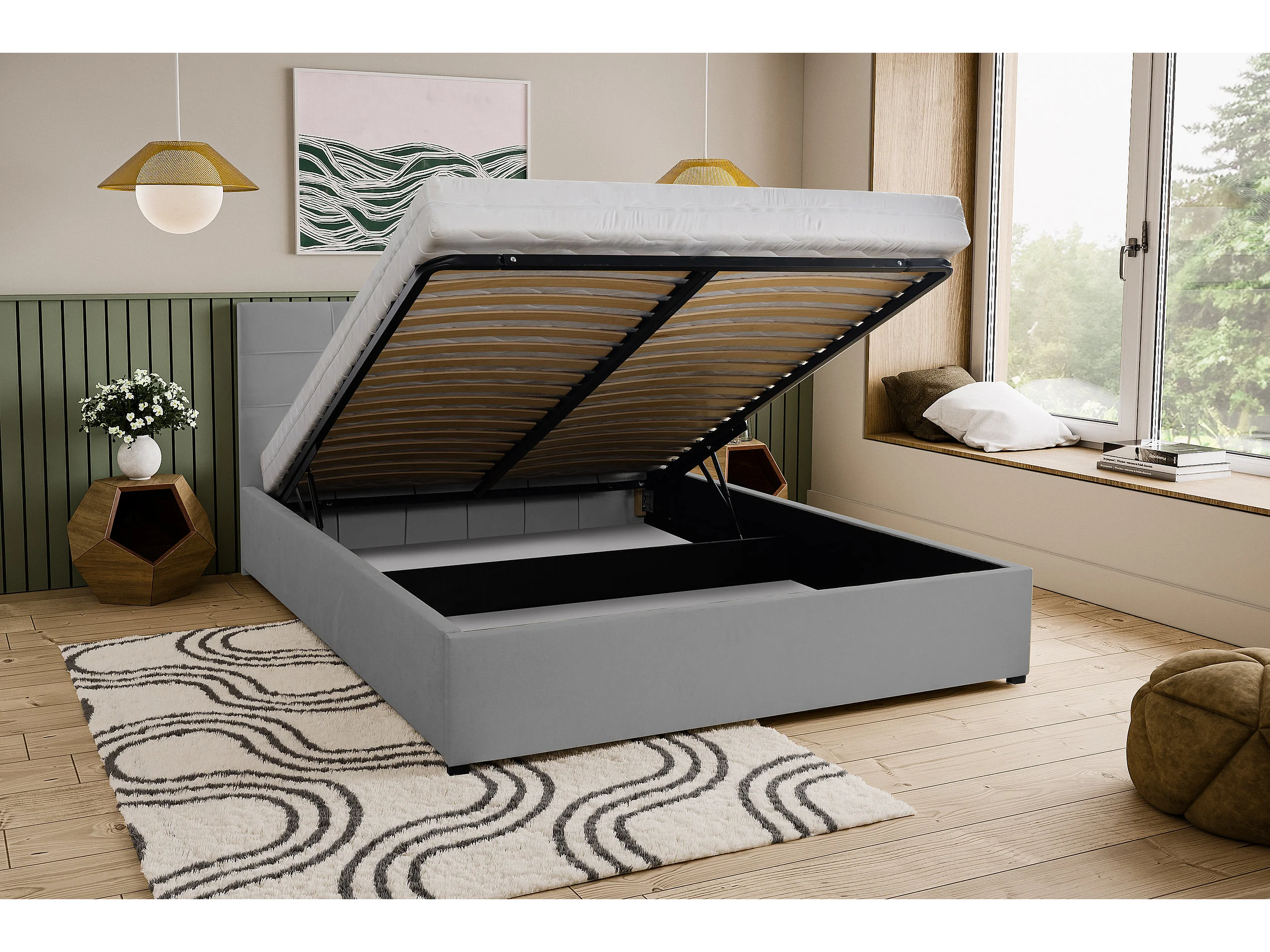 Lit rembourré JESSA avec tête de lit, 180 x 200 cm, lit double avec coffre de rangement et sommier à lattes en velours, velours, couleur : gris