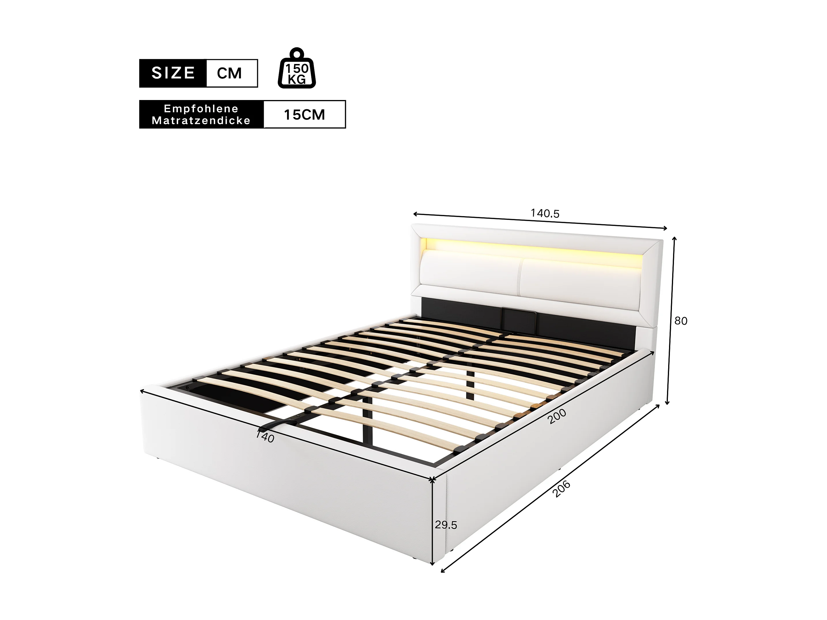 Lit rembourré LED, 140×200 cm, blanc, avec échelle et barrières de sécurité, rangement intégré