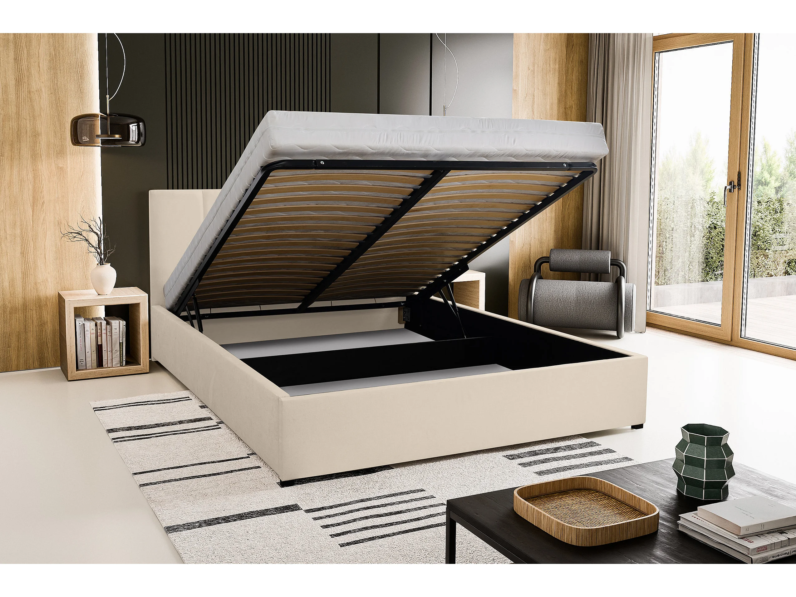 Lit rembourré LISA avec tête de lit, 180 x 200 cm, lit double avec coffre de rangement et sommier à lattes en velours, velours, couleur : beige
