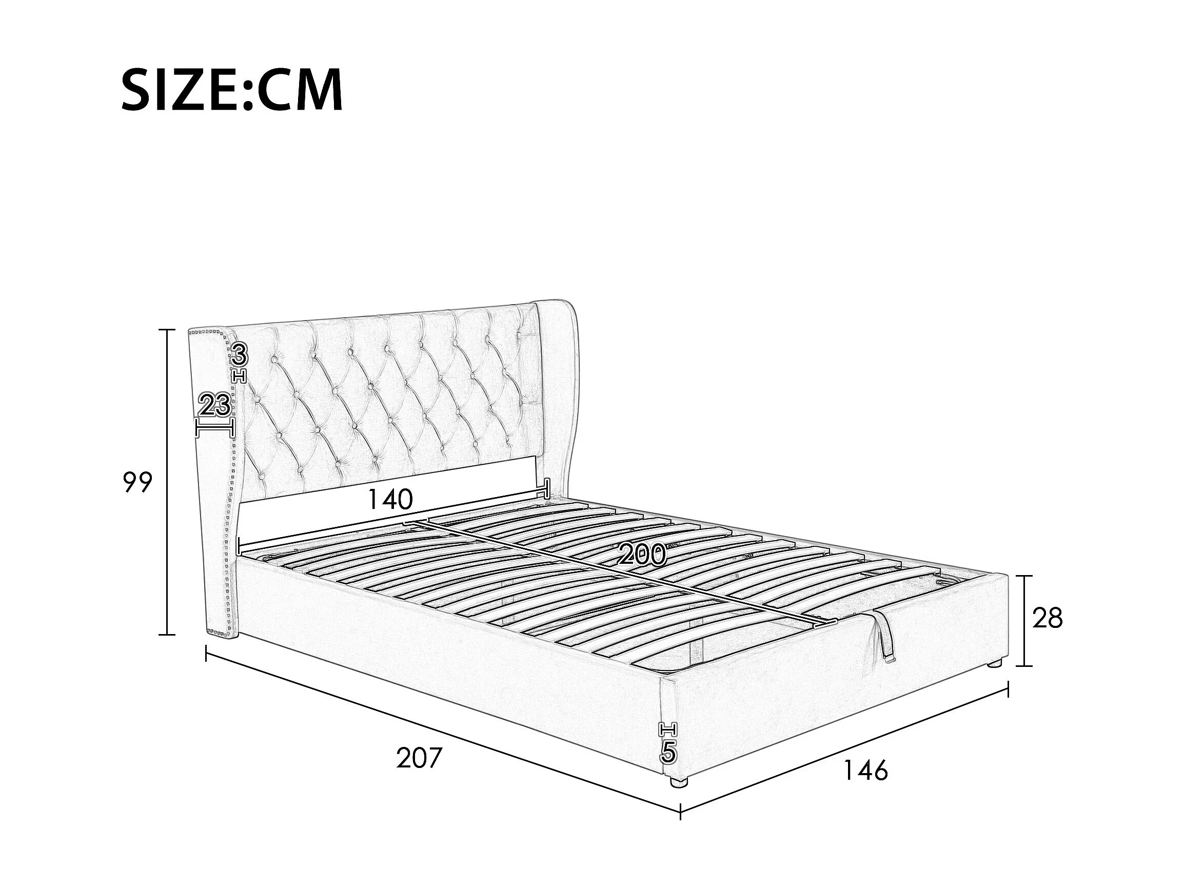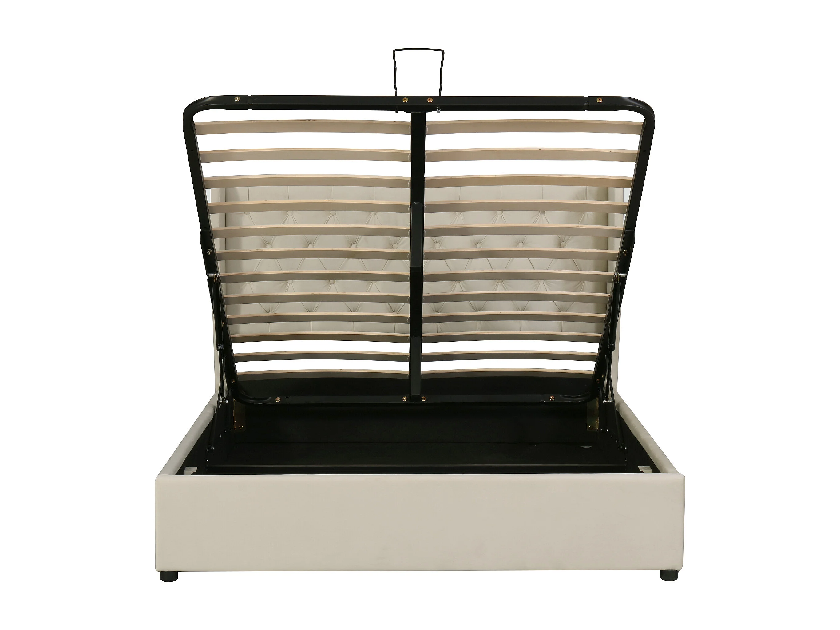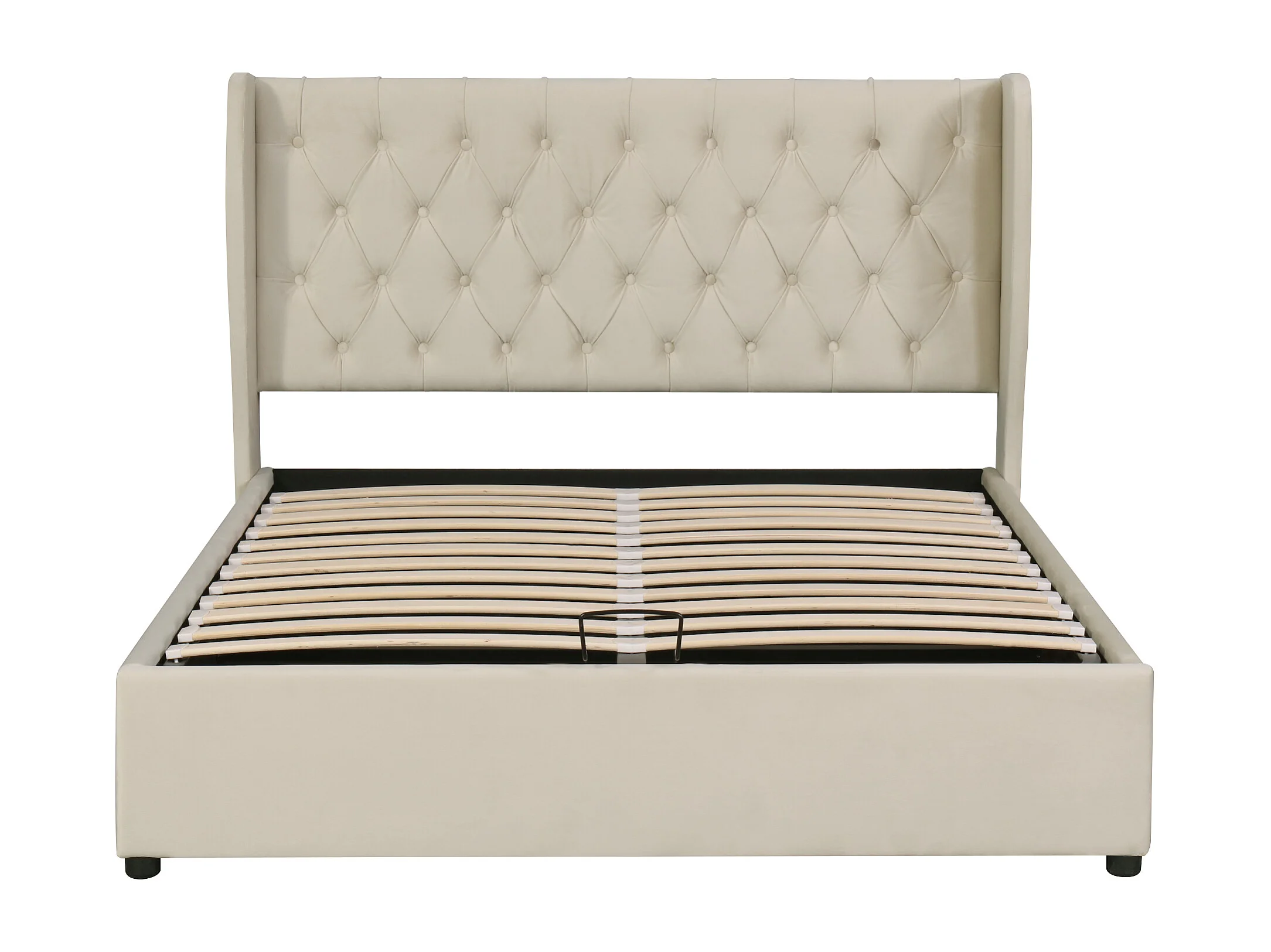 Gestoffeerd bed Hydraulisch functioneel bed met lattenbodem en opbergruimte,oorvorm Fluwelen stof Grote knoopnaden,Tweepersoonsbed 140X200 cm,beige,Zonder matras