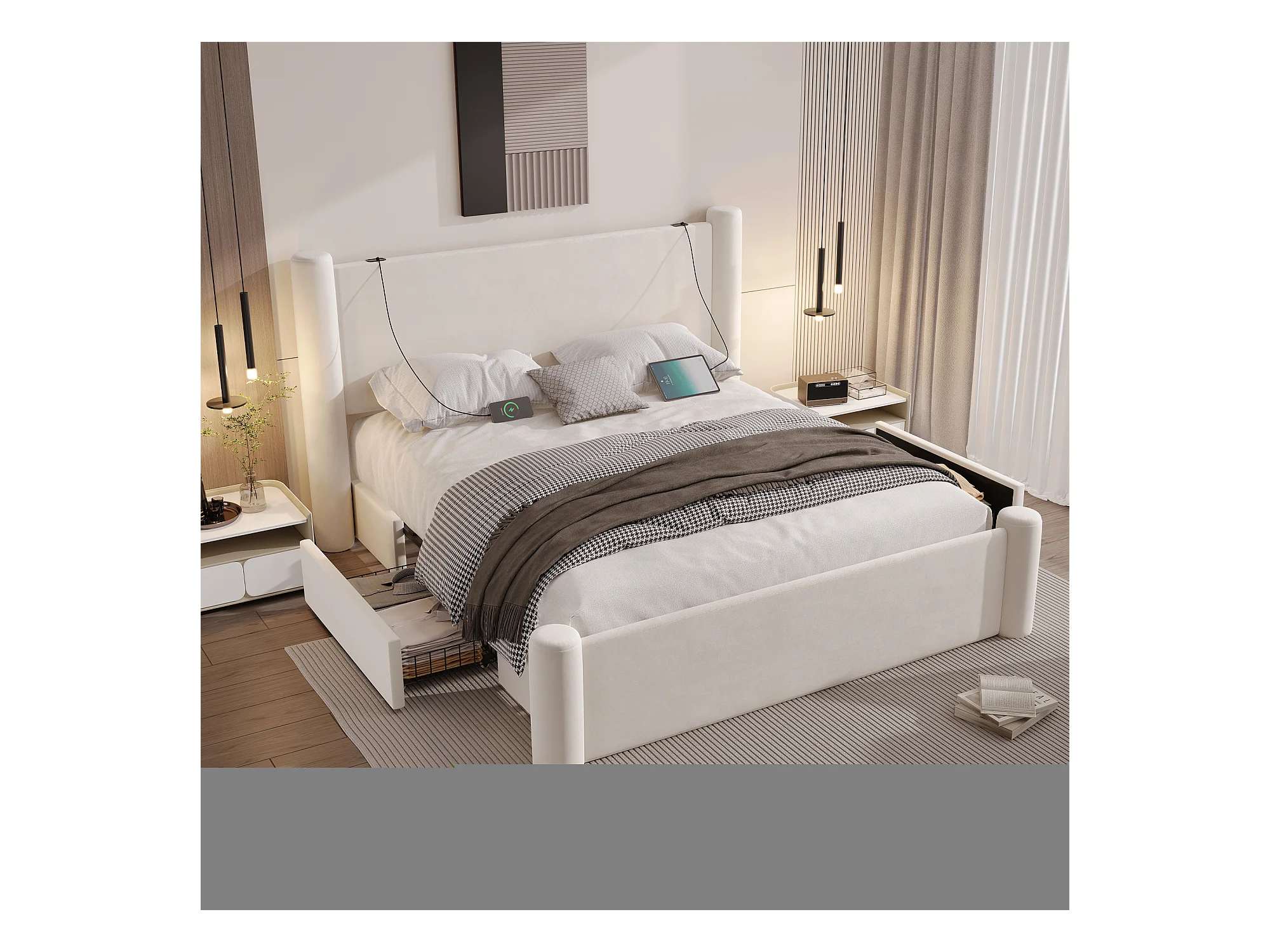 Lit rembourré moderne - 160 x 200 cm - tête de lit épaissé + 2 tiroirs + ports USB - velours - beige