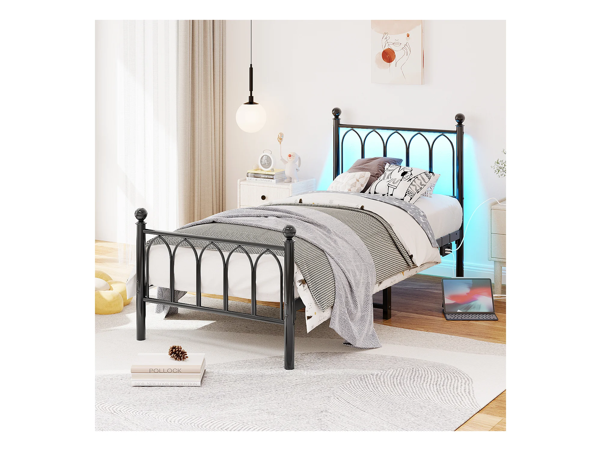 Lit simple 90 x 200 cm, noir, avec port de charge et LED, cadre métallique - sans matelas