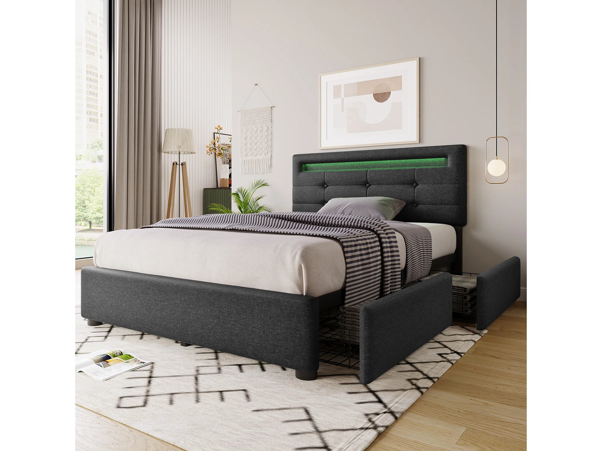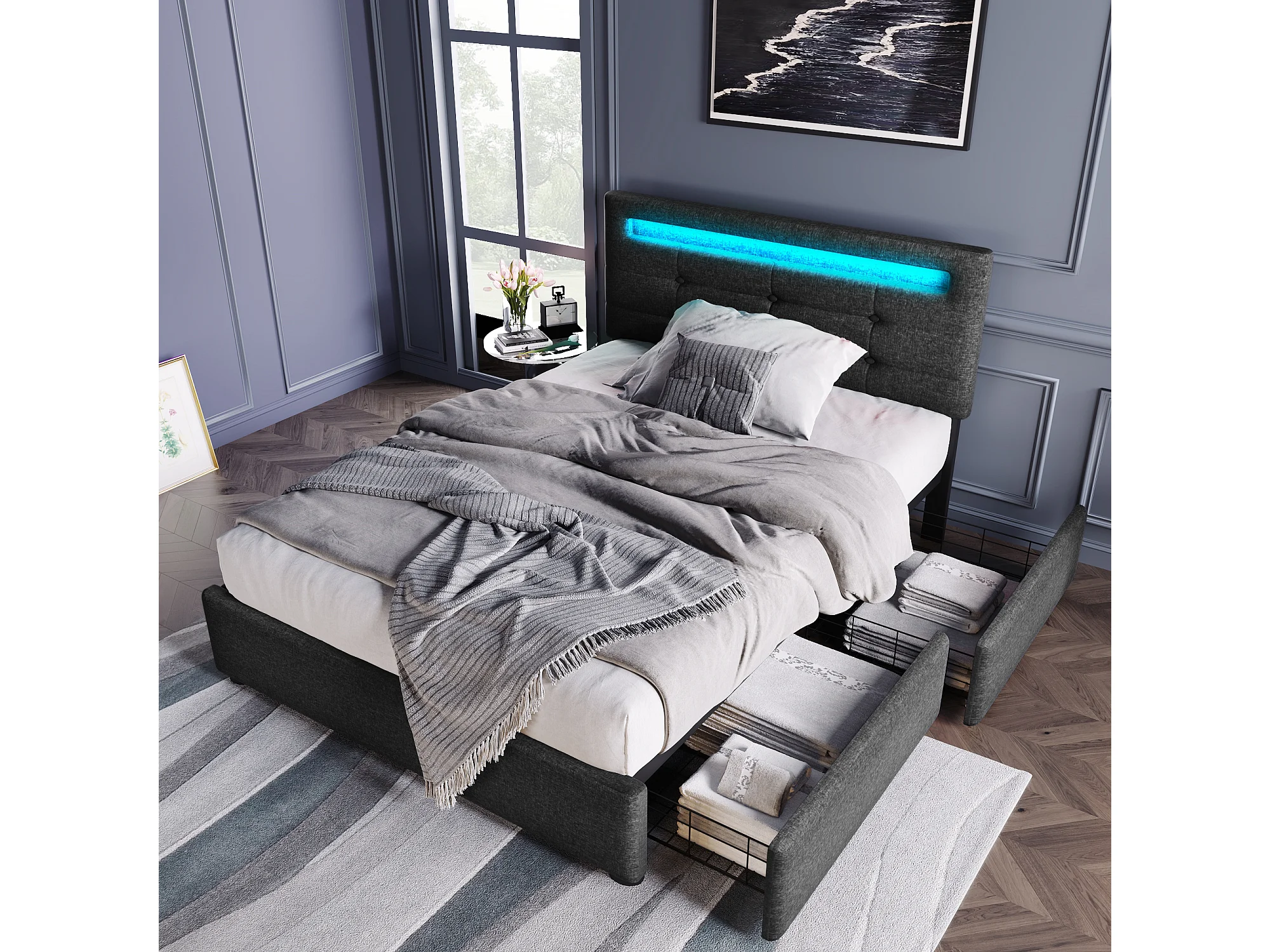 Lit simple 90x200 cm avec éclairage LED, 2 tiroirs, tête de lit réglable en gris