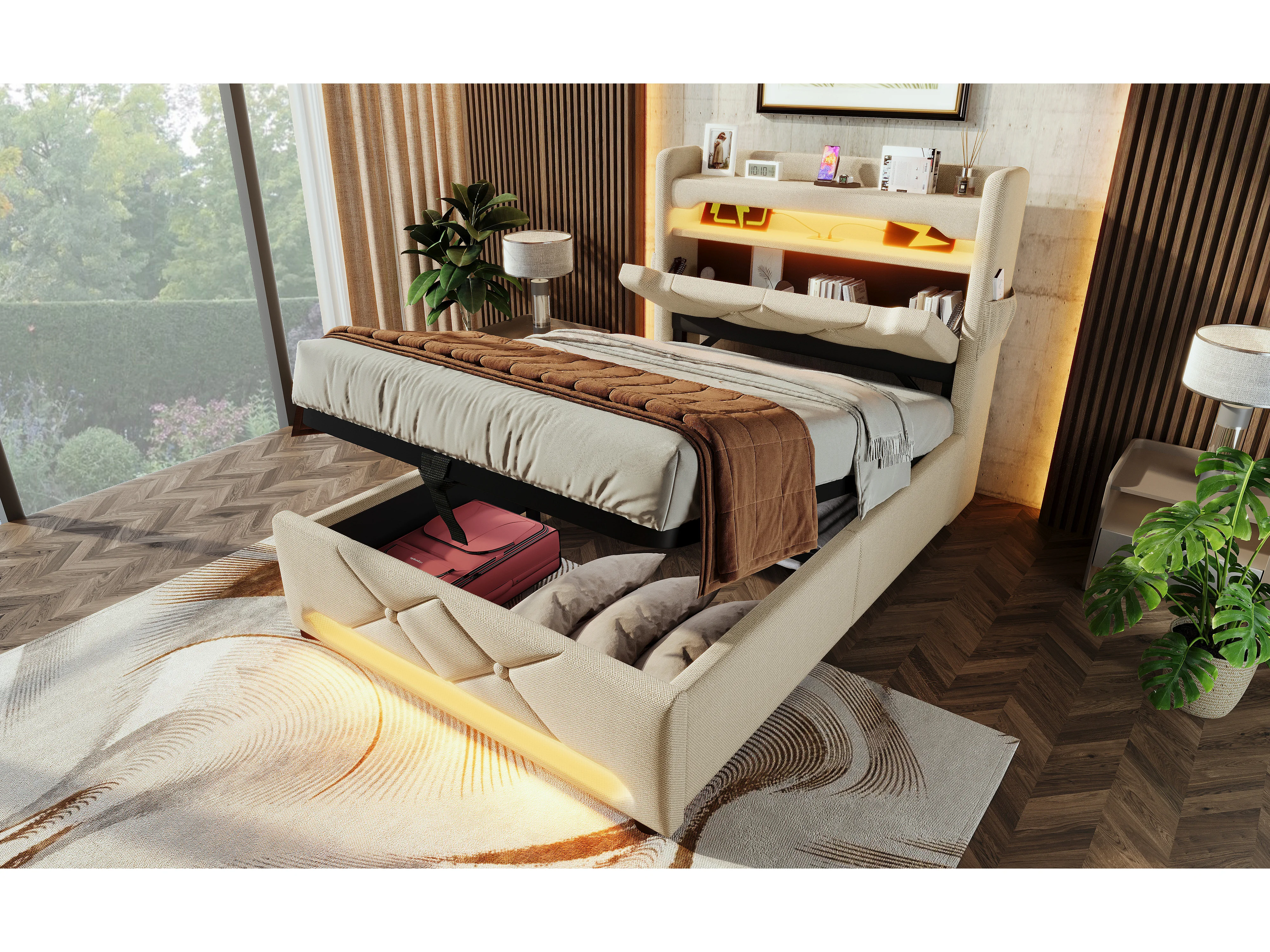 Lit simple 90×200 cm en lin beige avec tête de lit de rangement et ports USB